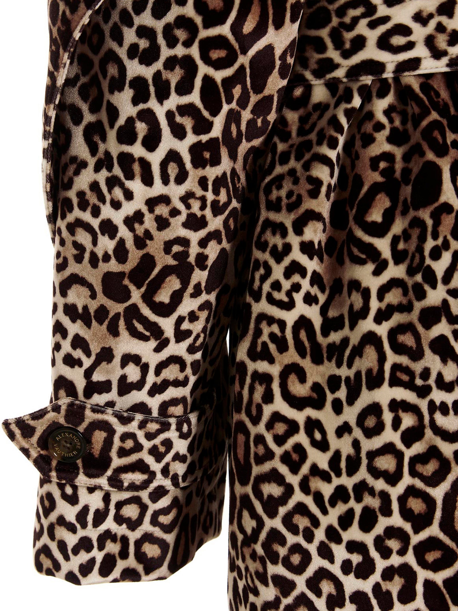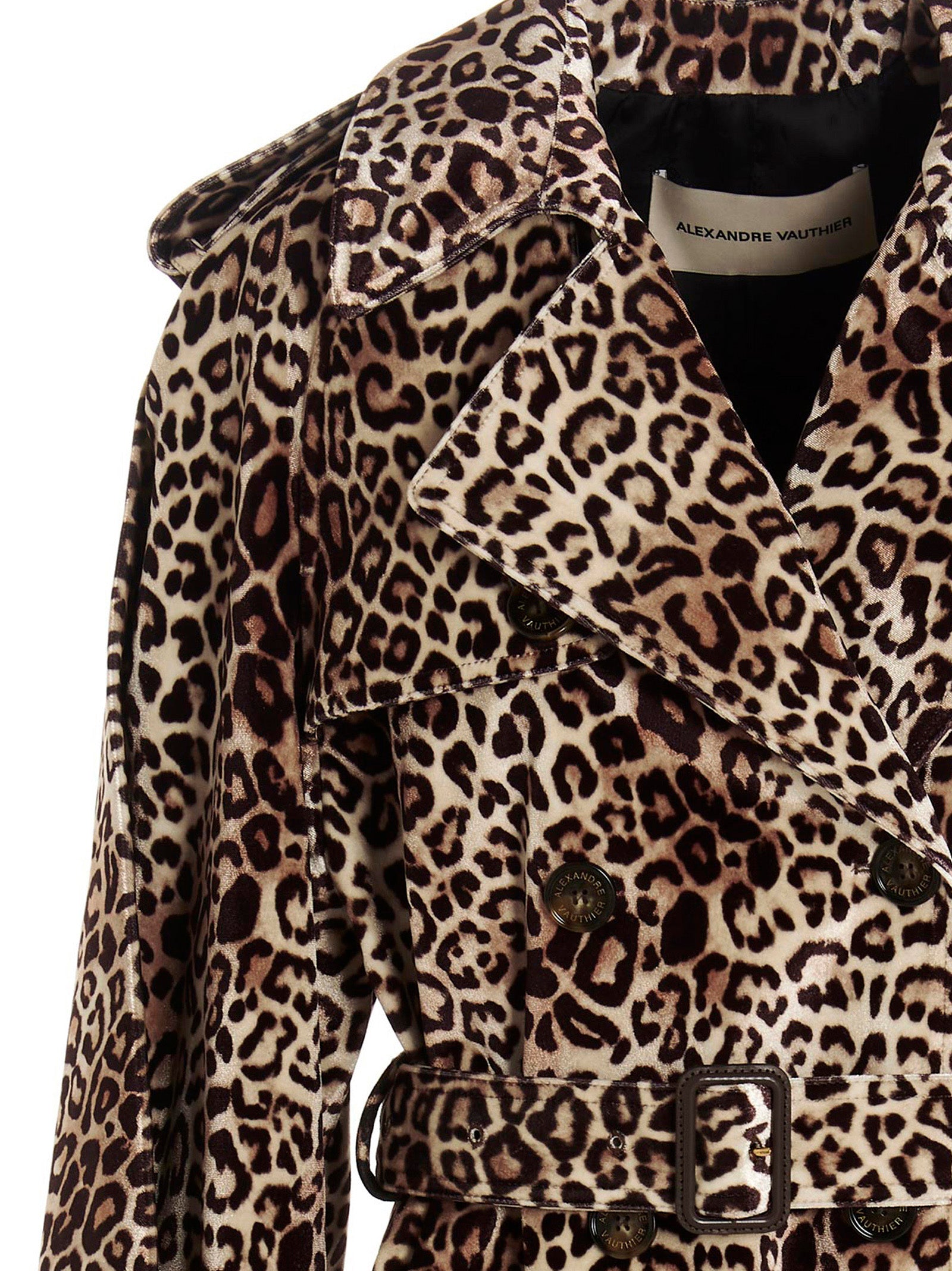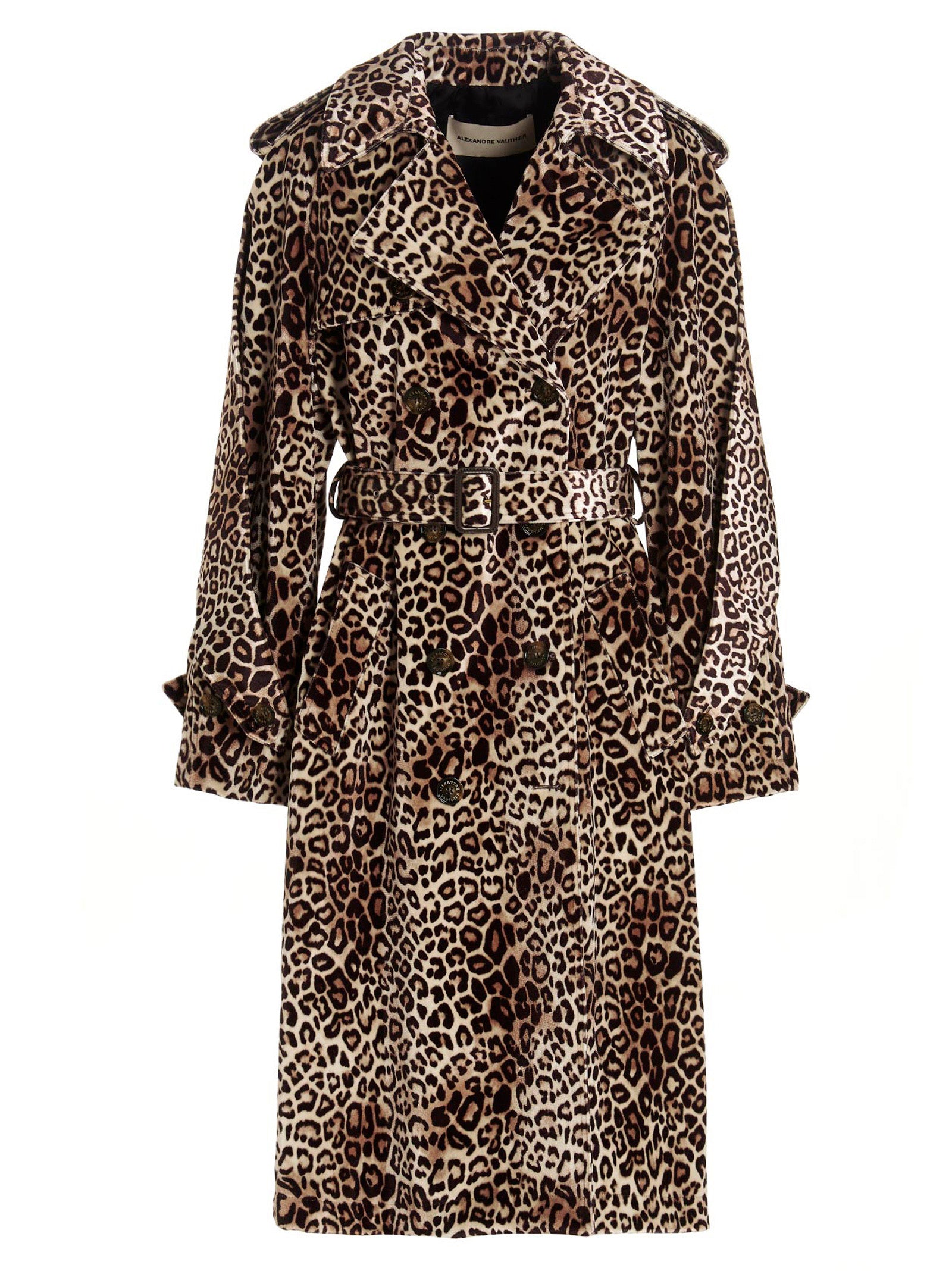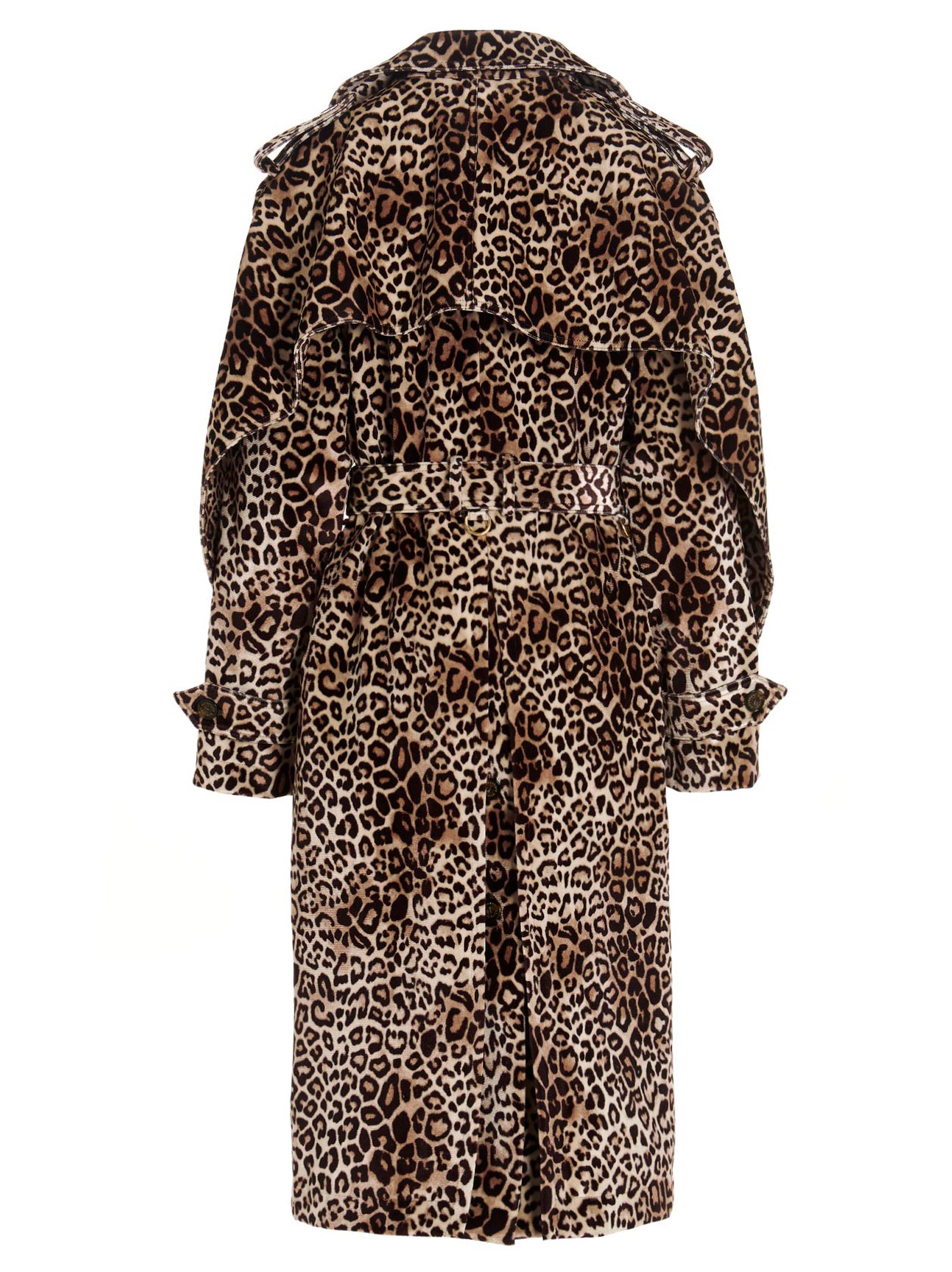 Trench di velluto a doppio petto con stampa leopardata all-over, chiusura dei pulsanti, cintura regolabile e rimovibile in vita, tasche, maniche lunghe e split posteriori.