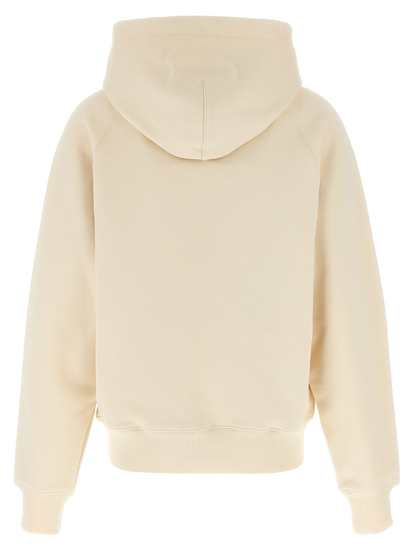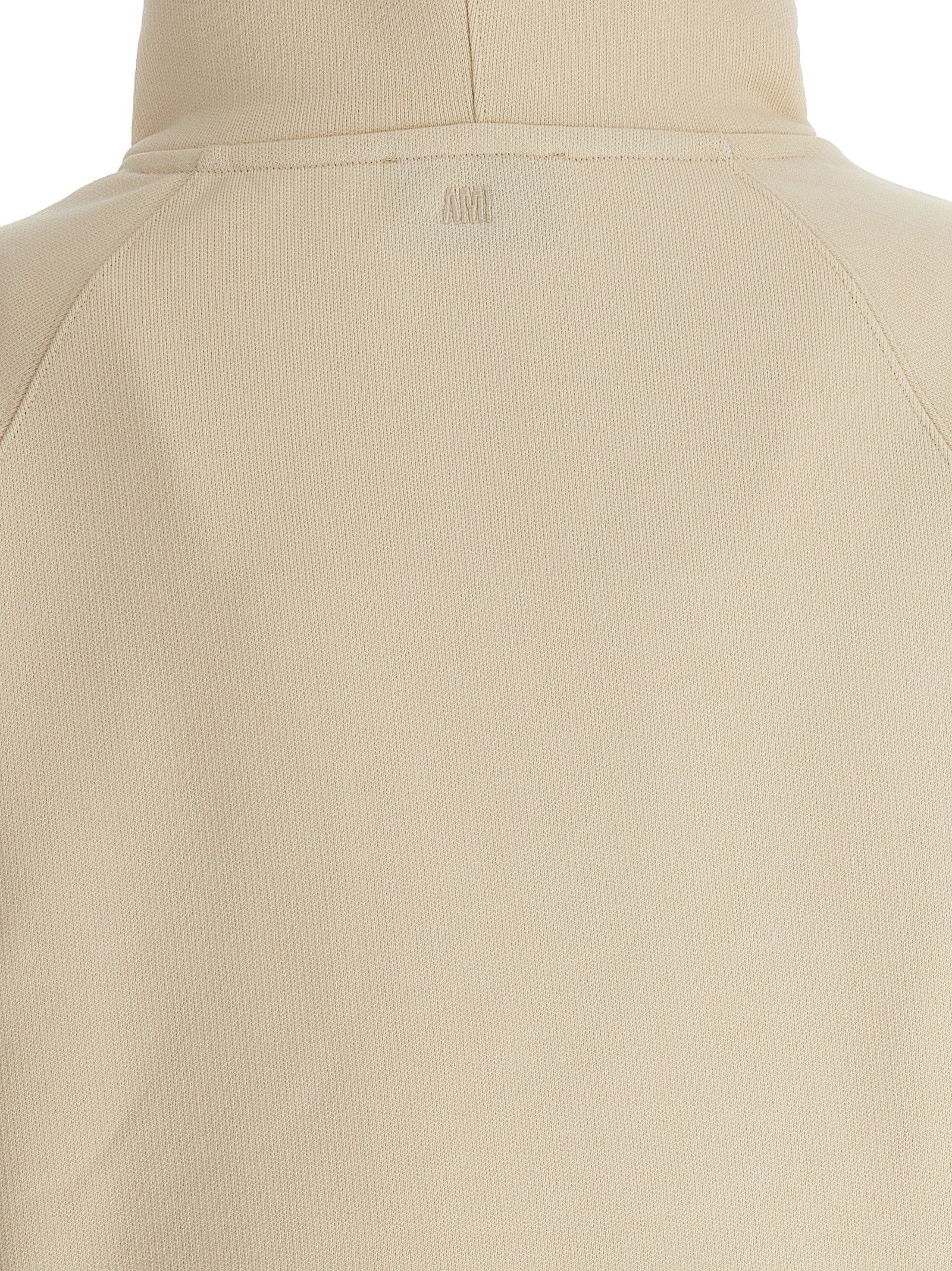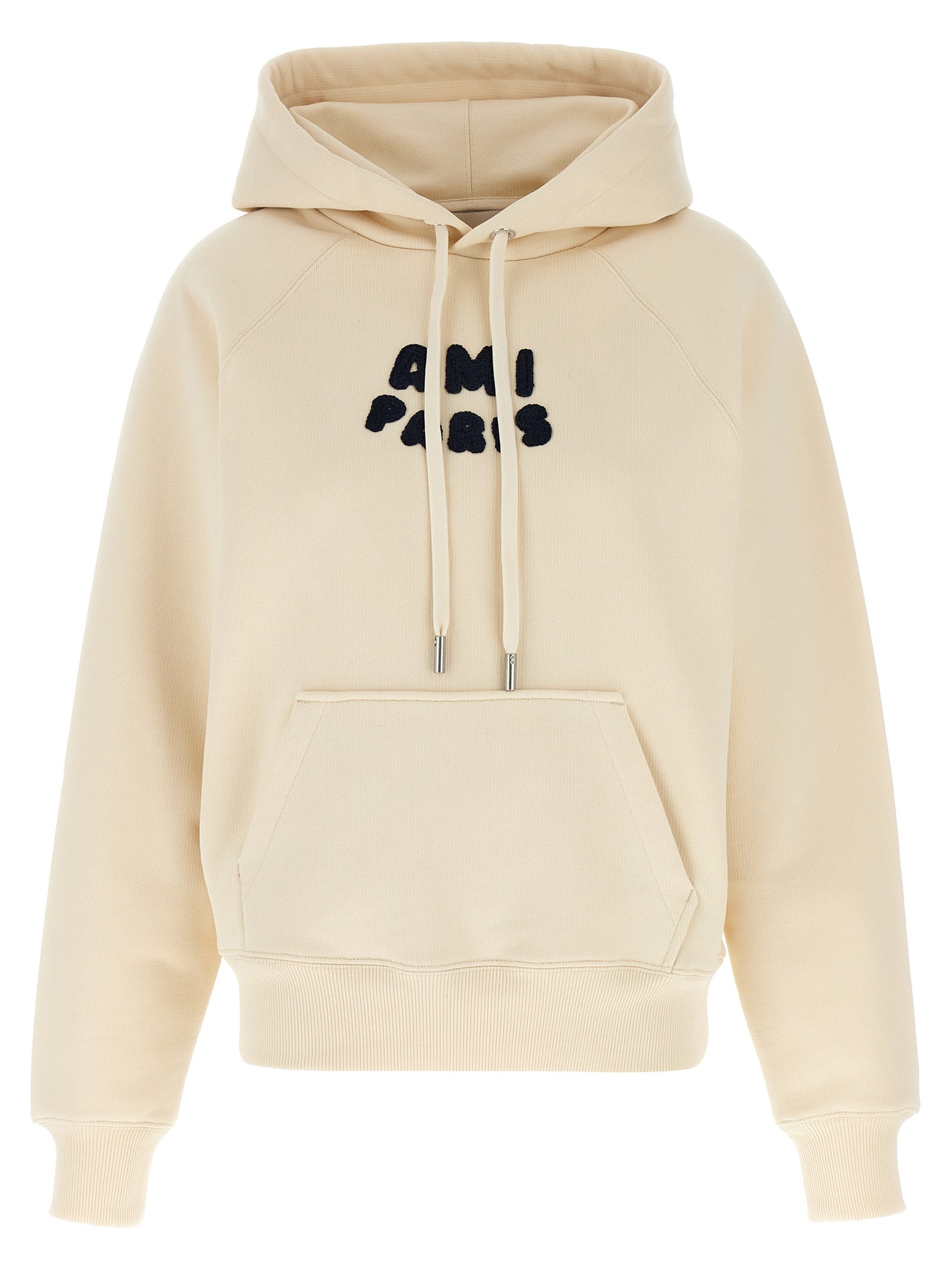 Pesante felpa con cappuccio di cotone spazzolato con ricamo "Ami Paris" in rilievo sul davanti, tasca del canguro, maniche a confusione lunghe.