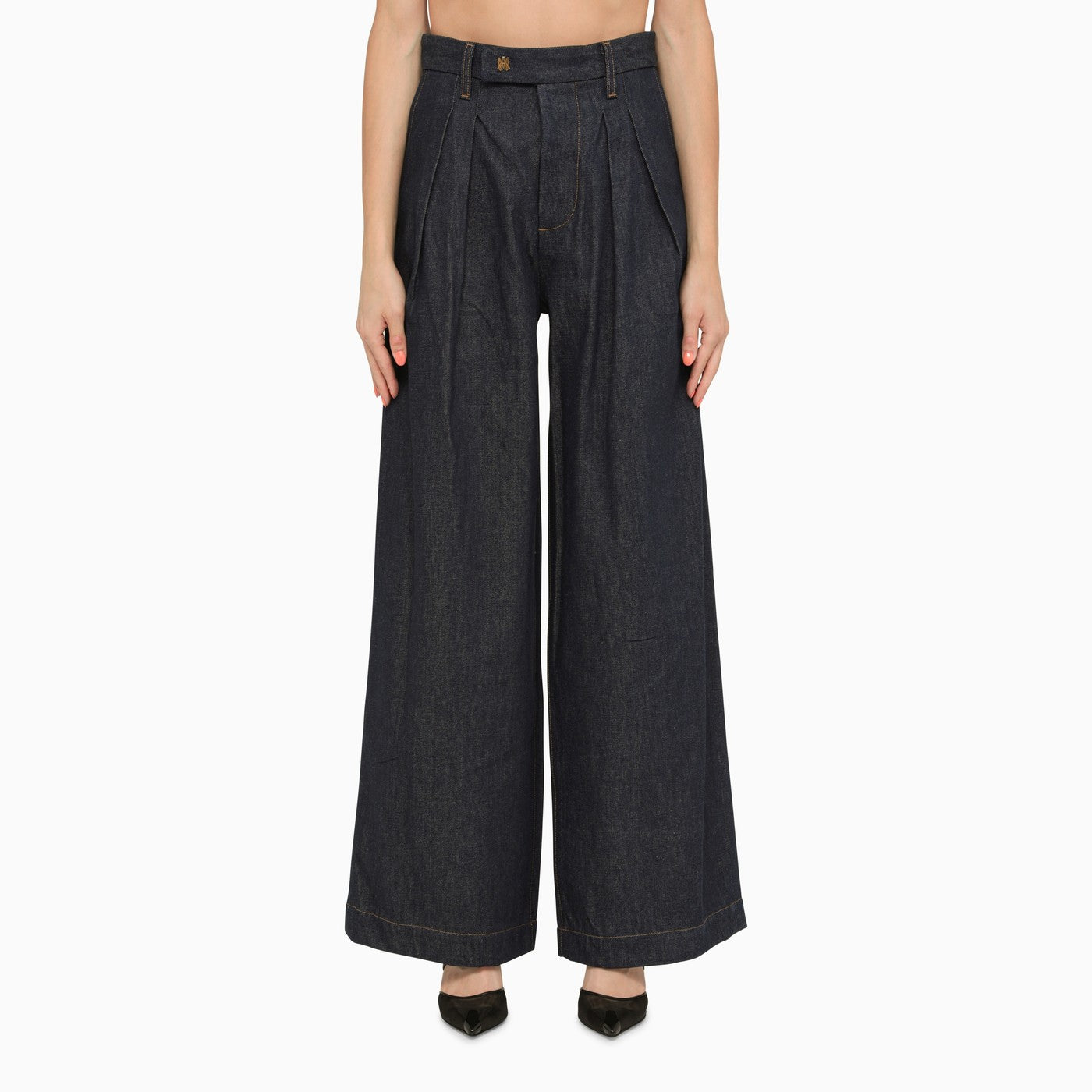 Jeans in denim di cotone blu di Amiri, con una vita alta, due tasche sui lati, due tasche Welt sul retro e un fissaggio nascosto.