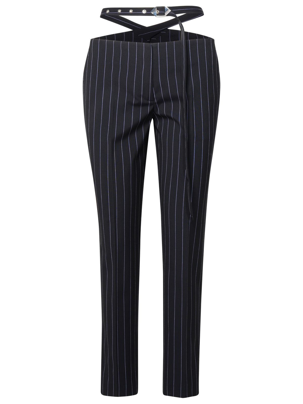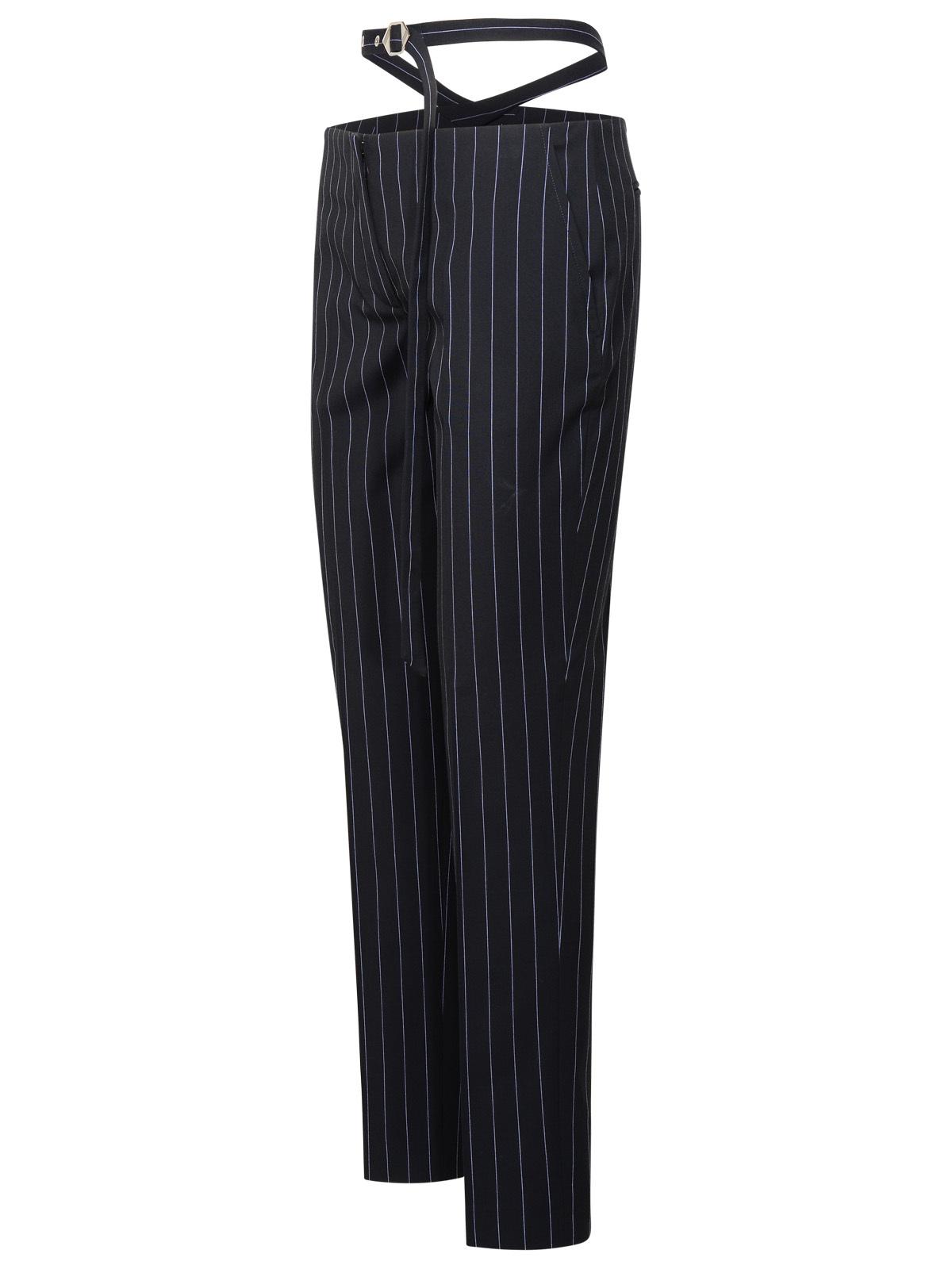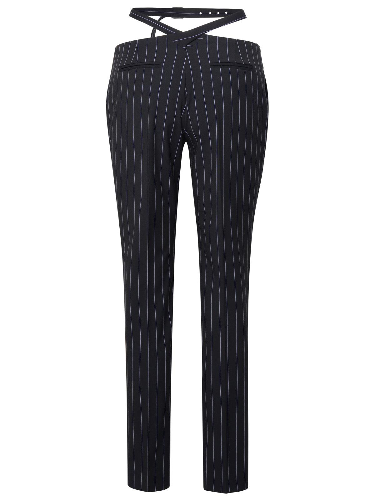 Pantaloni gessati su misura suonarditi a vita bassa con ritaglio in vita, cintura incrociata con fibbia logo, gancio anteriore e chiusura a zip, tasche a fessura late