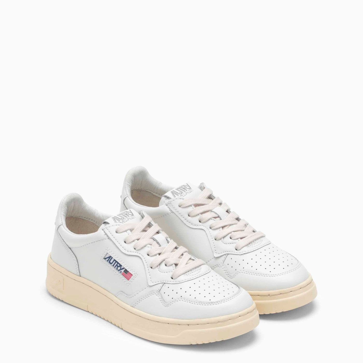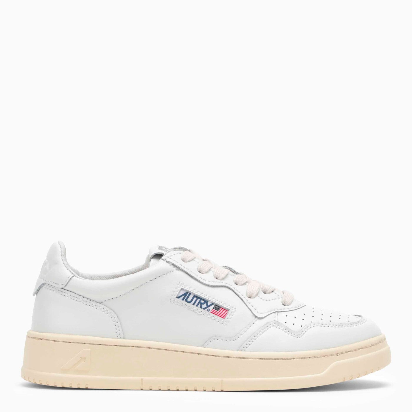 Sneaker a basso contenuto di medaglie da parte di AUTRY in tomaia in pelle bianca con punta perforata, fissaggio in pizzo anteriore, etichetta tonale cucita su una lingua in pelle, caviglia imbottita, patch posteriore abbinato a colori ionici con logo in rilievo e suola in gomma crema con logo.