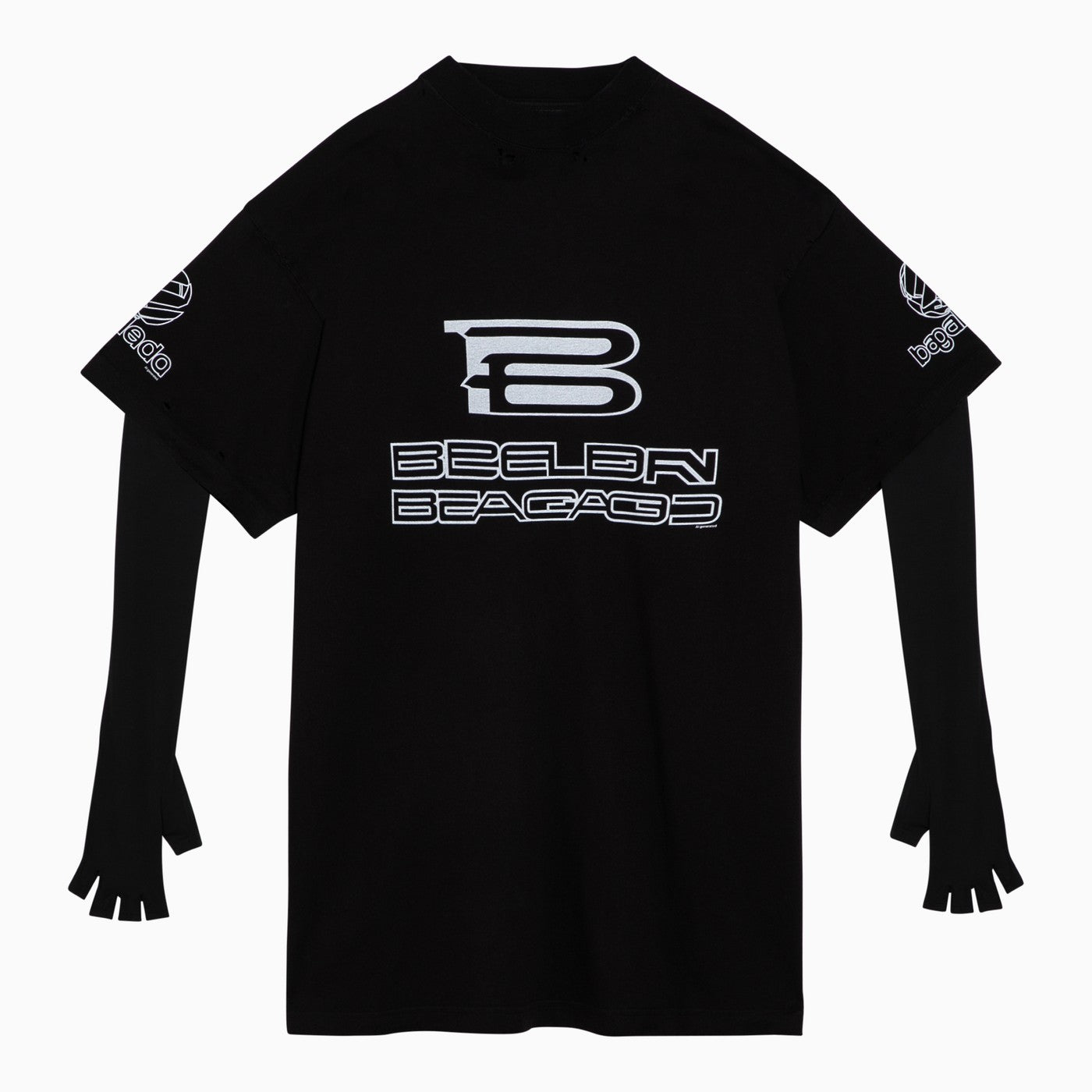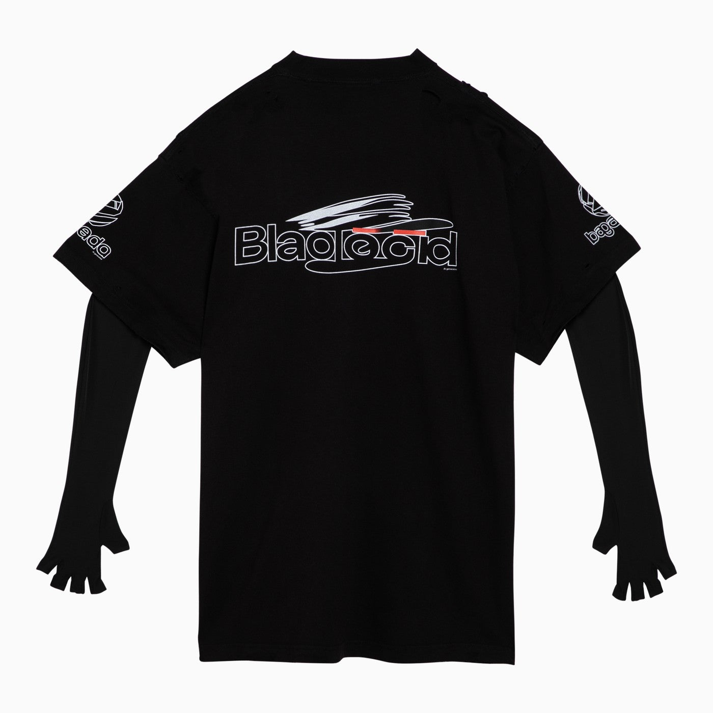 T-shirt in maglia di cotone in bianco e nero lavata da Balenciaga con maniche lunghe aderenti con guanto, motivi logo generati dall'IA stampati sul davanti, schiena e maniche a colori contrastanti, usura localizzata, orlo dritto e in forma.