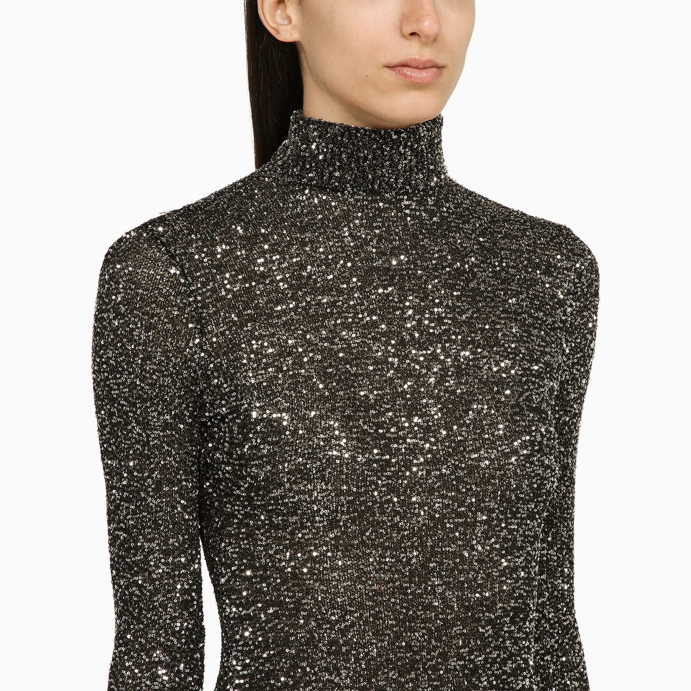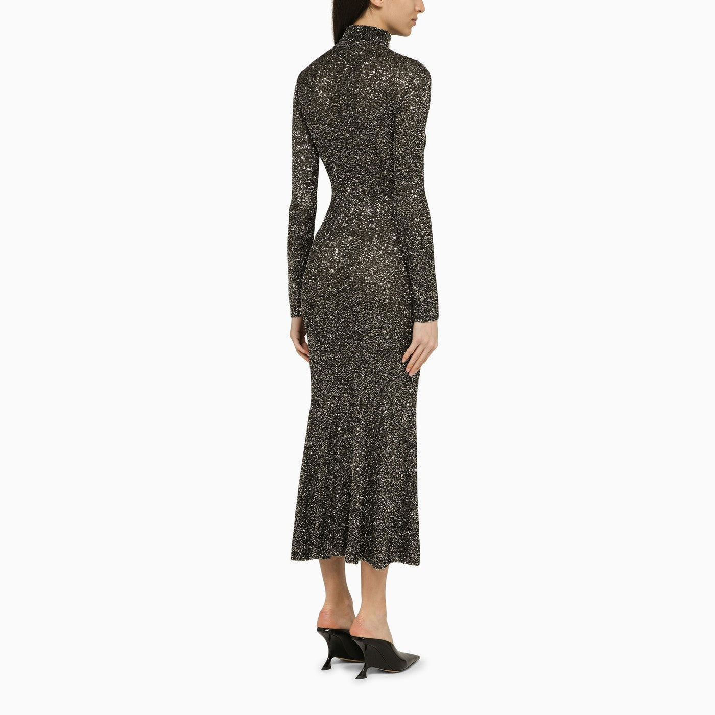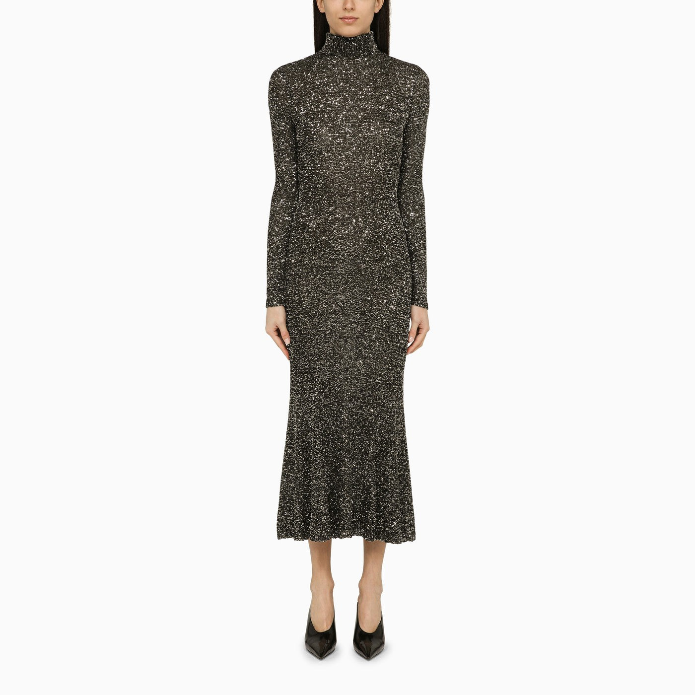 Nero e argento abito midi di paillettes di Balenciaga con un collo alto, maniche lunghe, un orlo svasato e una vestibilità sottile.
