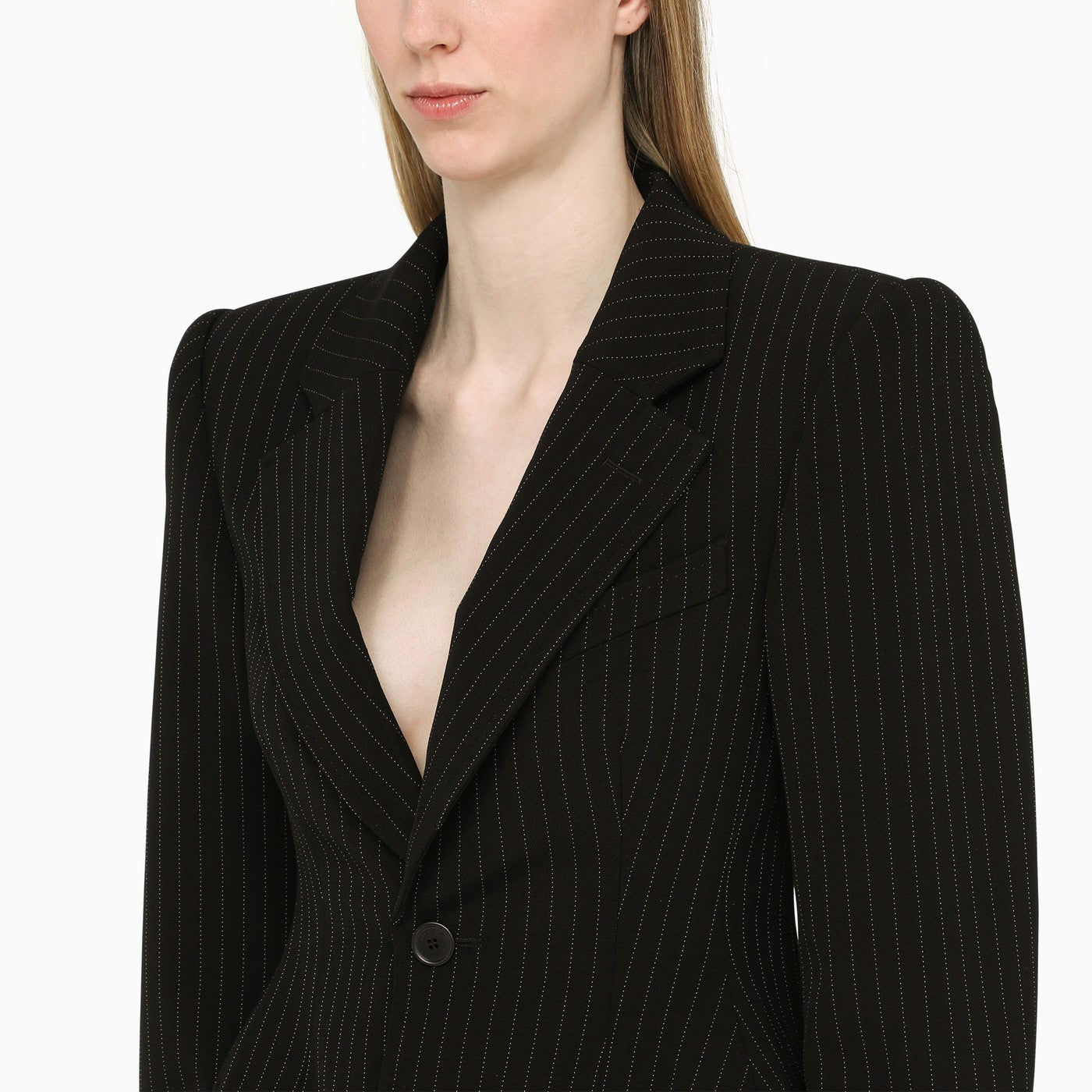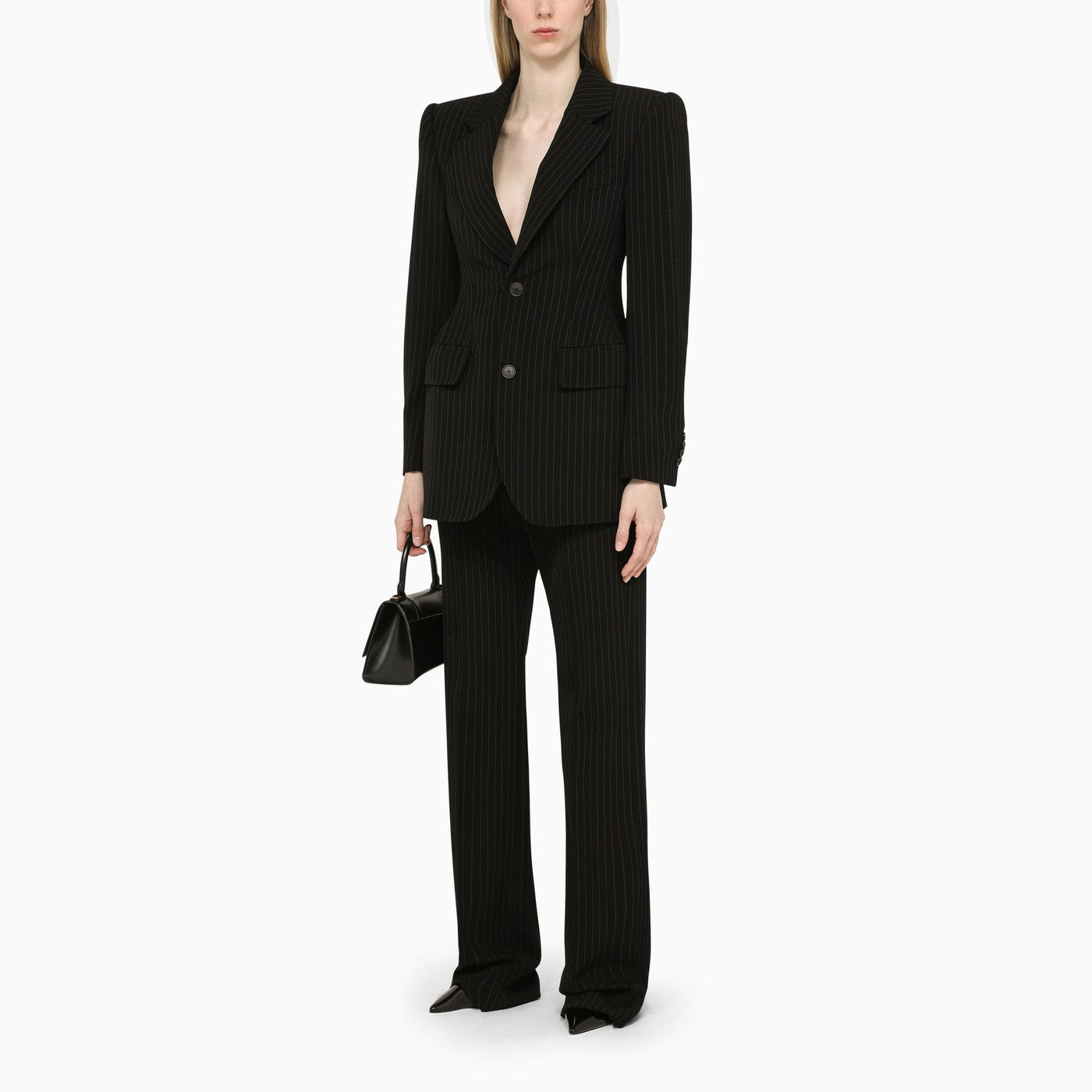 La giacca a petto singolo di lana nera di Balenciaga con motivo a gesso, con un fissaggio a bottone, due tasche a flap sul davanti, maniche lunghe ed epaulette imbottite.