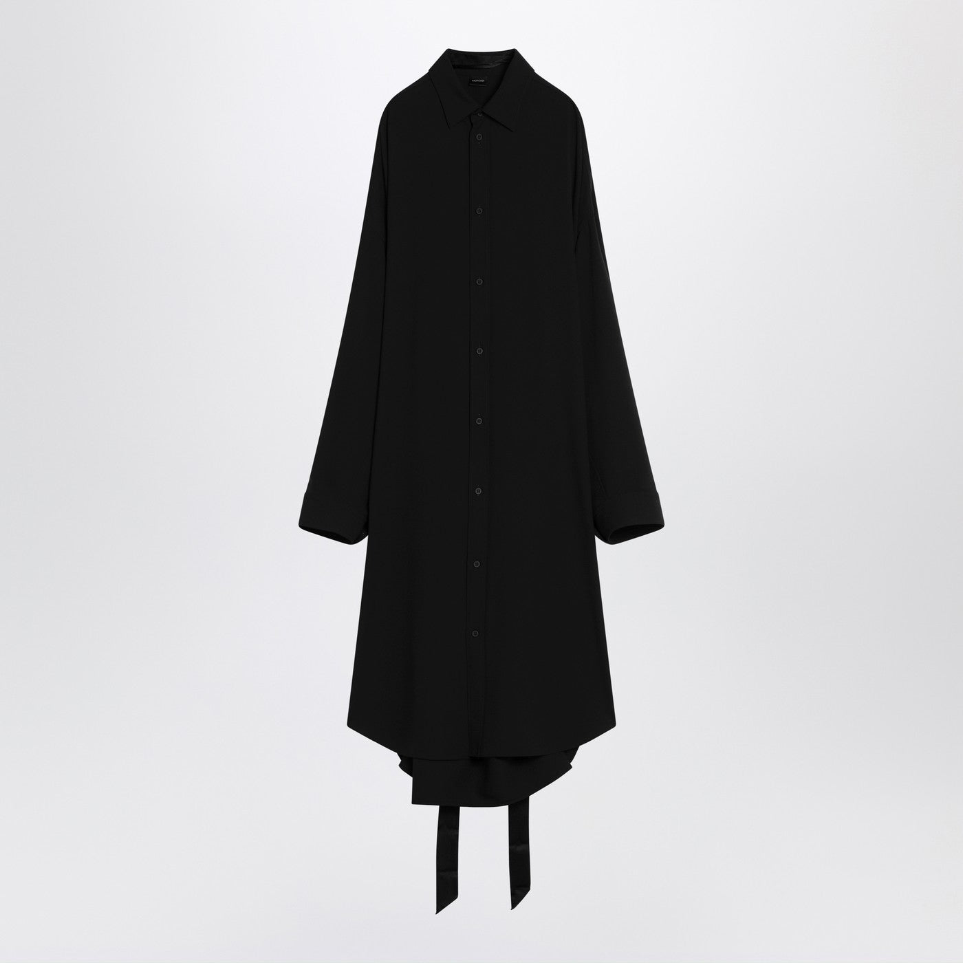 Abito da camicia Balenciaga nero, caratterizzato da abbottonatura anteriore, maniche lunghe con polsini abbottonati, colletto classico e lacci sul retro con nastri incrociati.