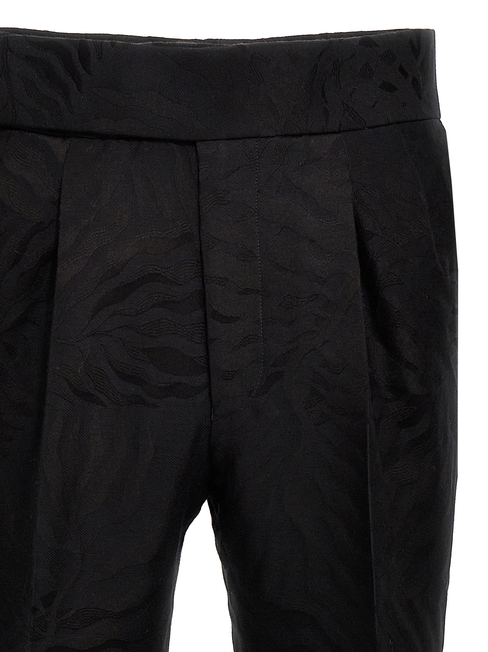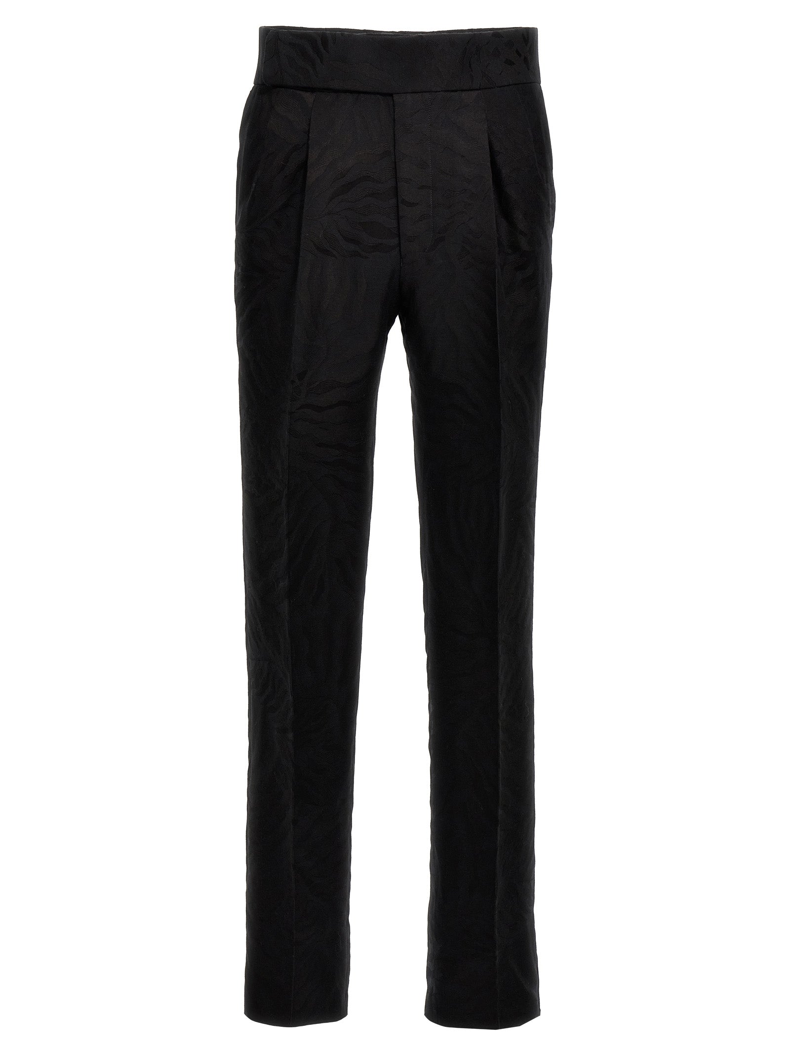 Pantaloni di cotone a miscela di lana con tessuto jacquard, modello con pieghe, chiusura a zip e gancio.