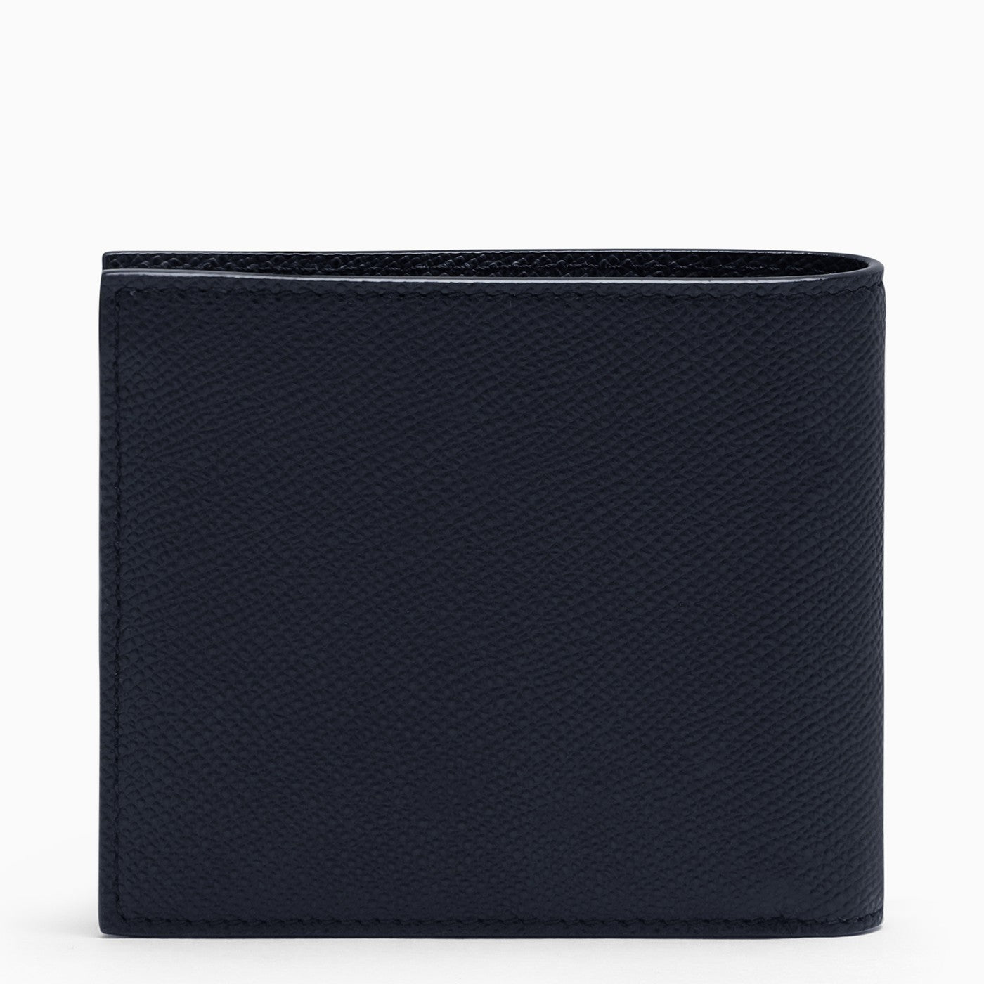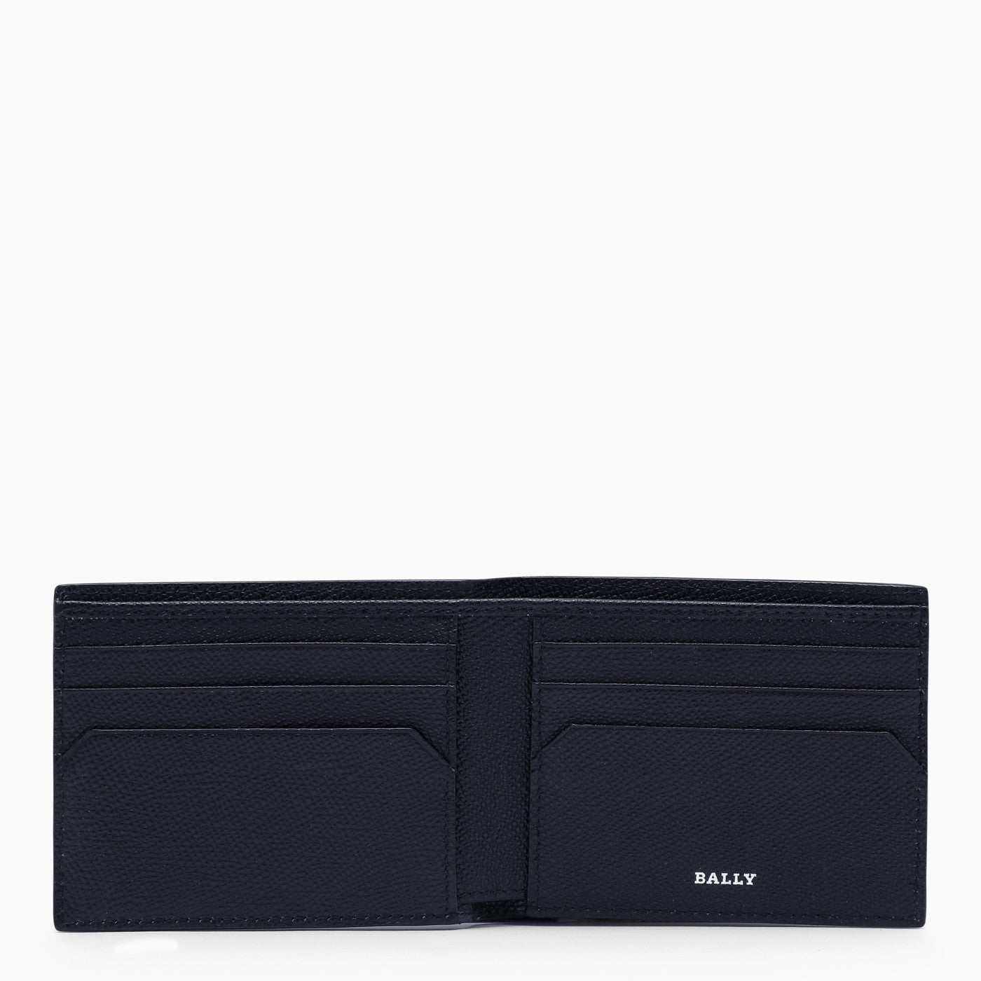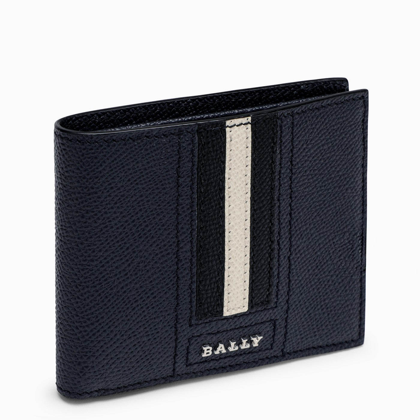 Billfold Wallet di Bally in pelle blu, con logo di lettere in metallo sul davanti, iconico nuovo blu e bianco Stripe Bally sulla parte anteriore, un vano fatture, slot a sei carte e uno scompartimento di badge.
