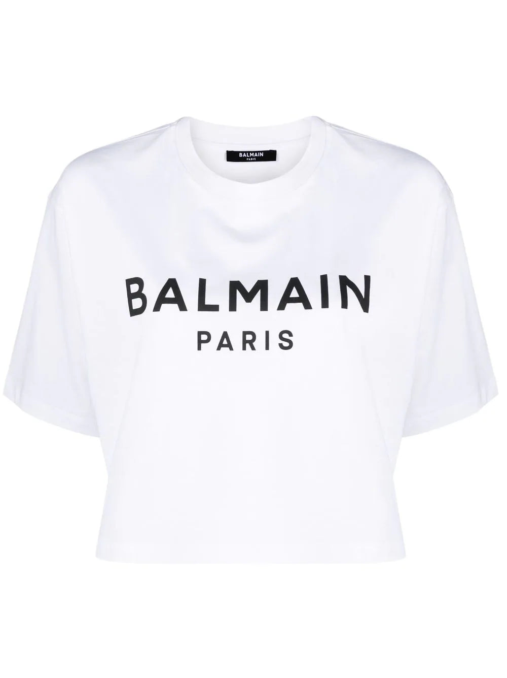 Cotton, front logo print, crew neck, short sleeves and crop design.