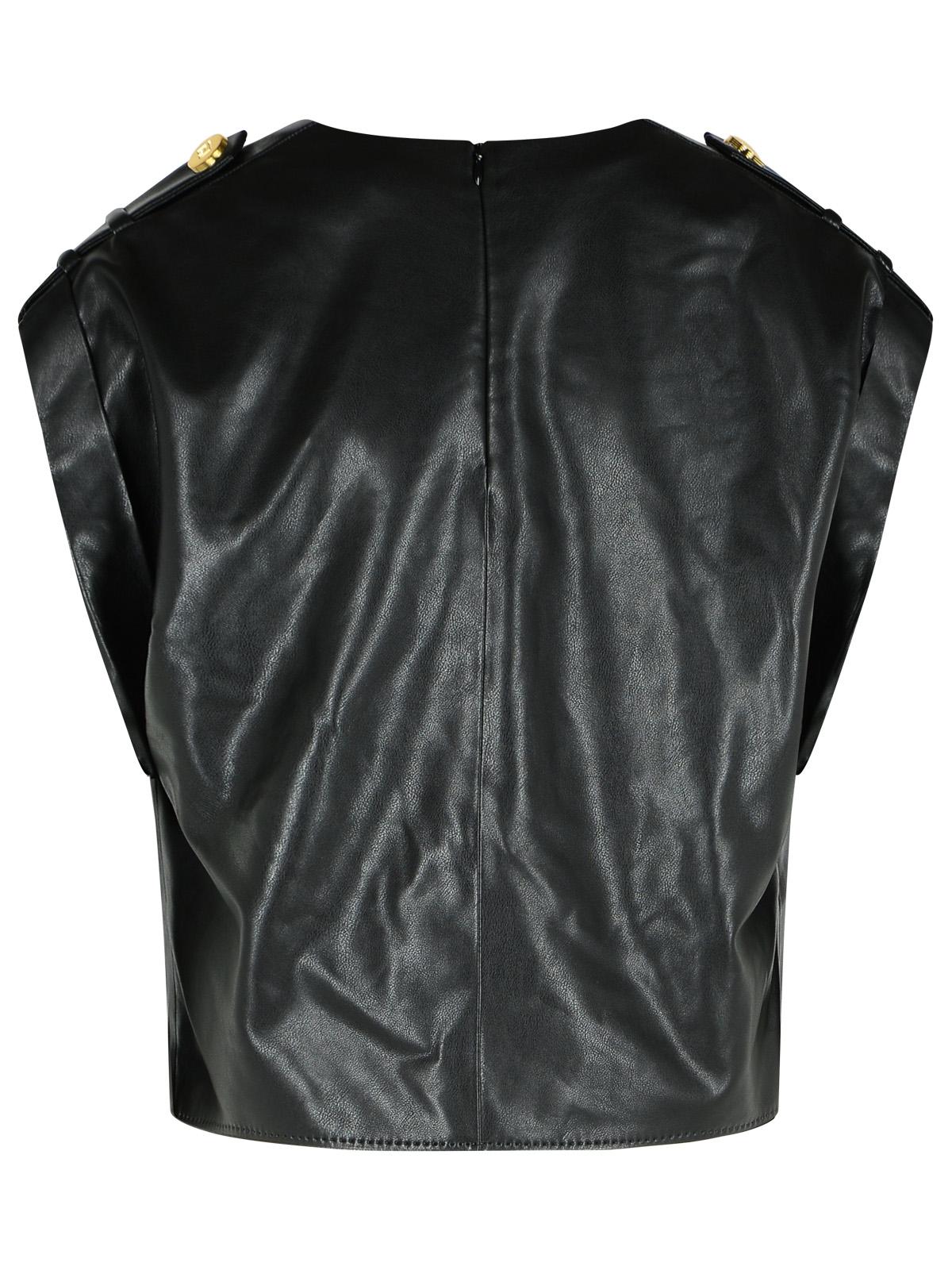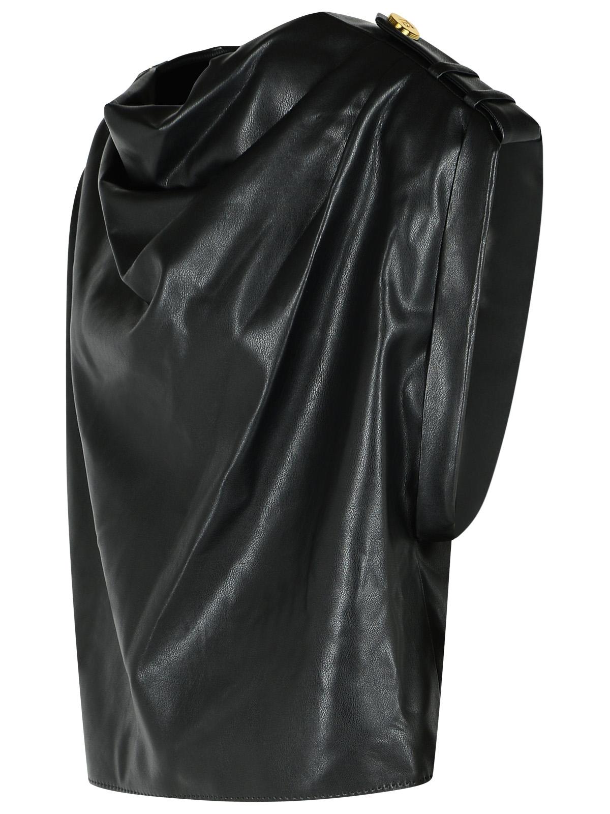 Scollatura drappeggiata, spalle strutturate, cinturini in metallo dorato con anelli e bottoni PB, maniche corte con risvolto, chiusura invisibile con zip sul retro, fodera "crêpe" miscela di seta, vestibilità casual