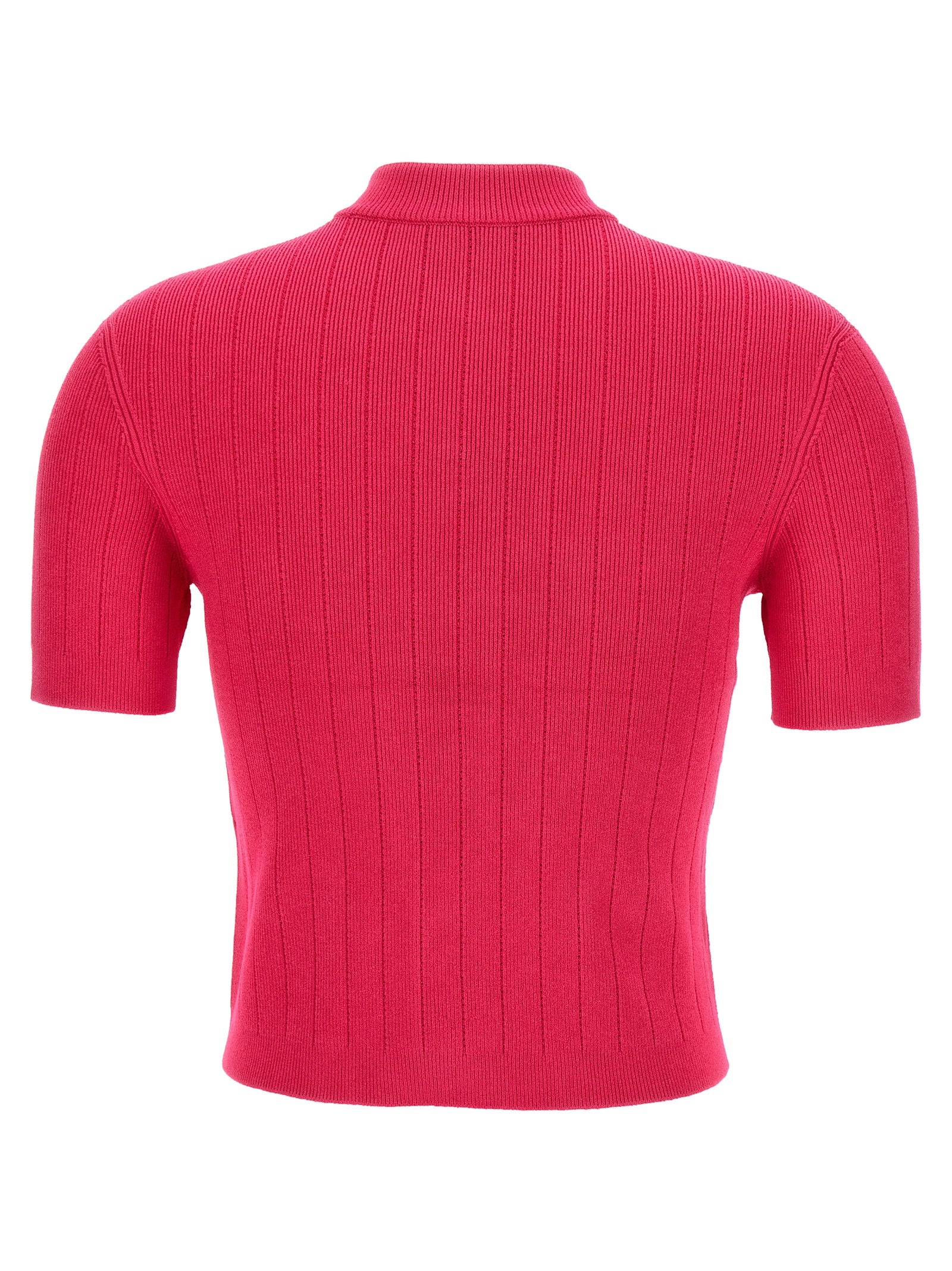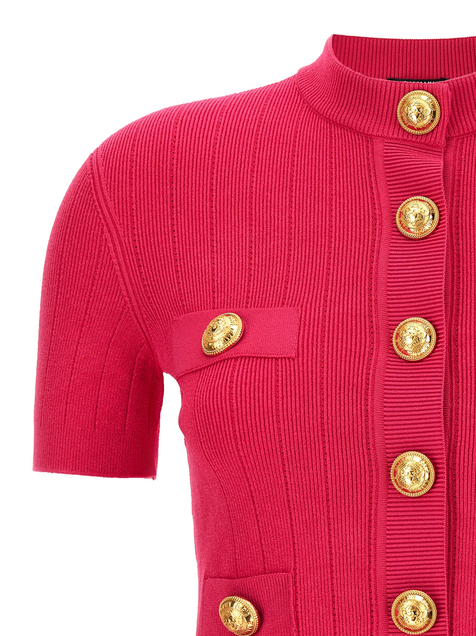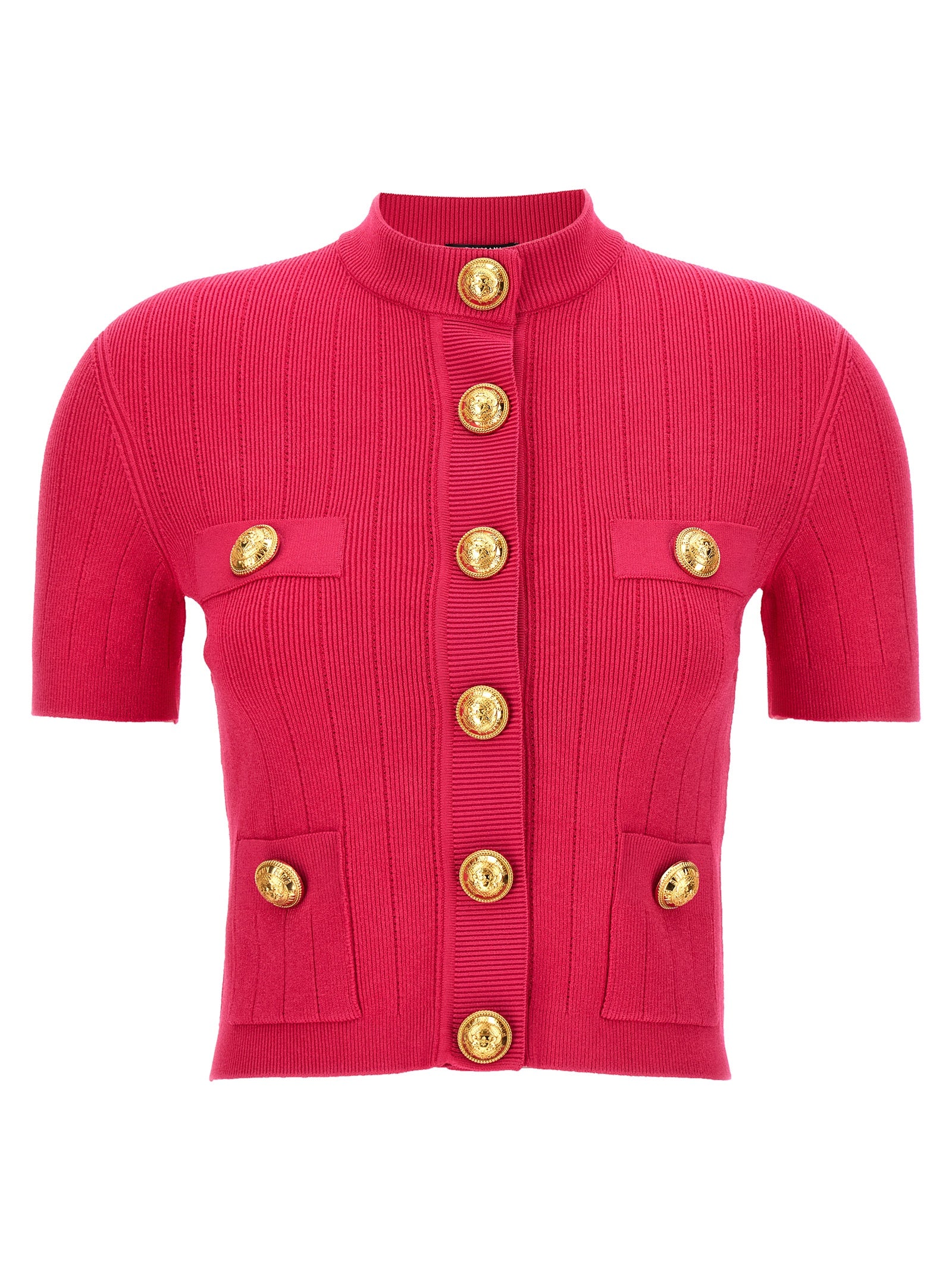 Cardigan a maglia in miscela di viscosa, appliqué a pulsanti logo, chiusura dei pulsanti e maniche corte.