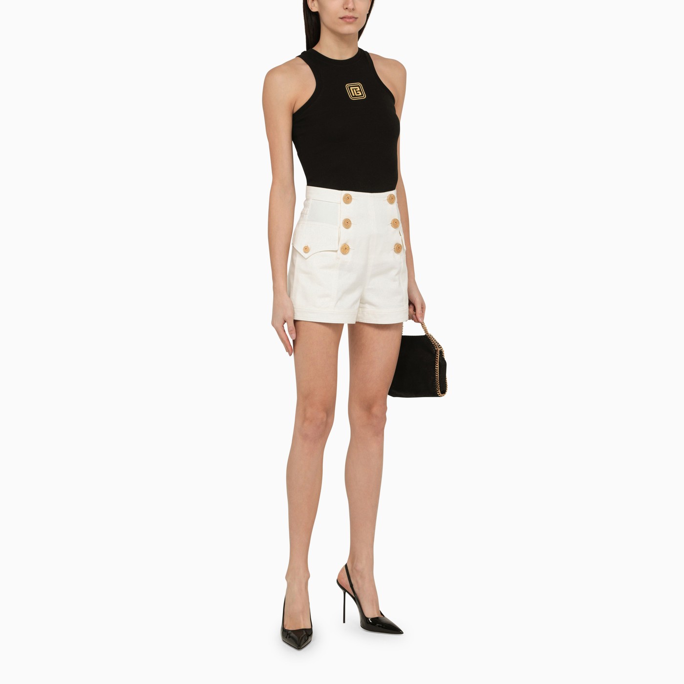 Shorts di denim in cotone bianco di Balmain con una vita alta, due tasche lampeggiate e bottoni decorativi in oro.