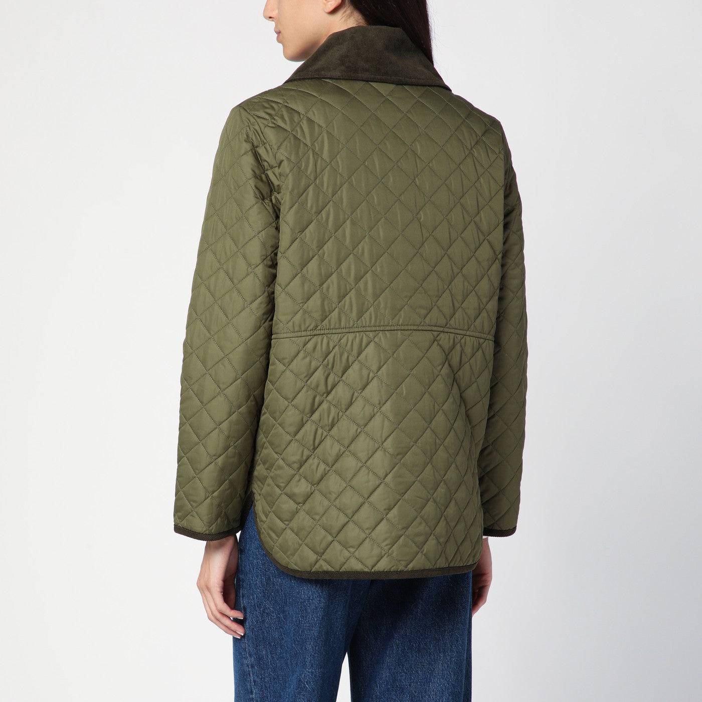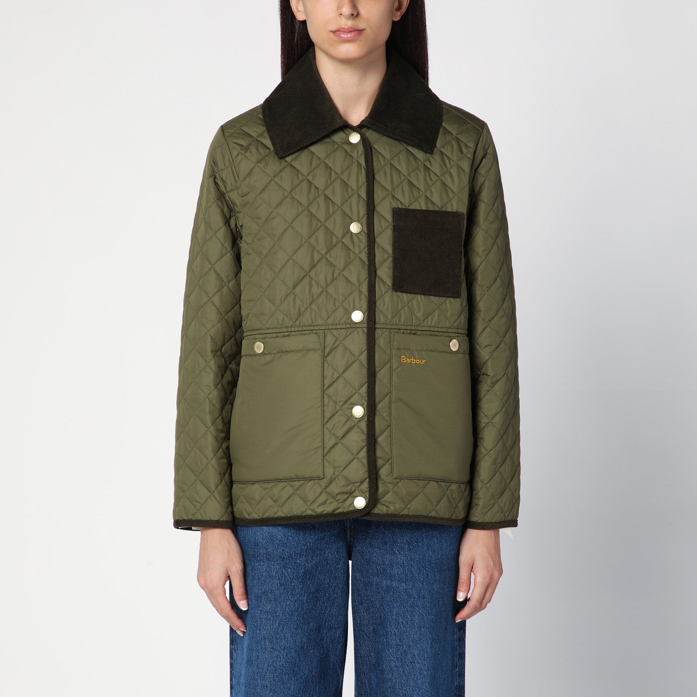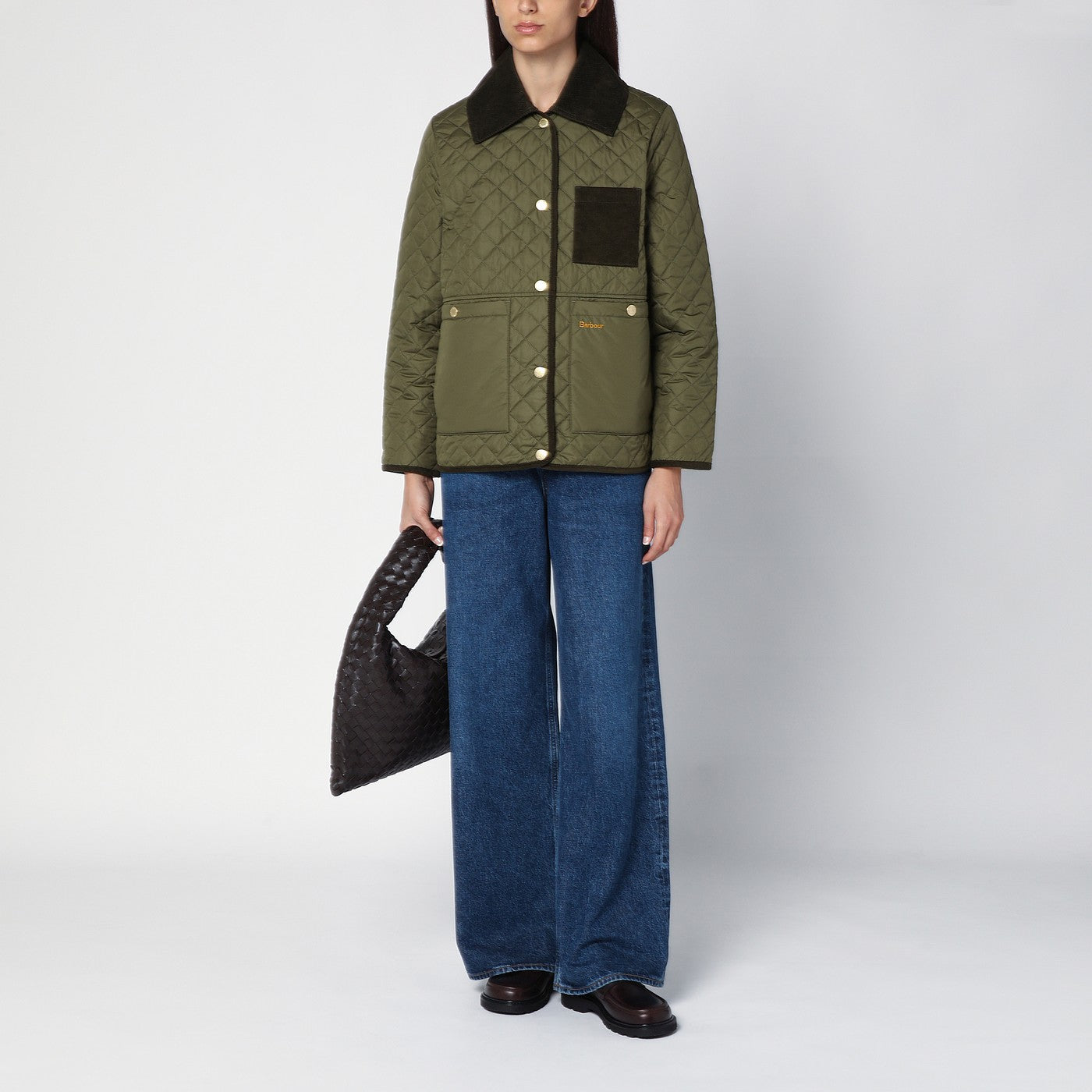 Giacca trapuntata in poliestere riciclata di muschio di Barbour, con un colletto di velluto a coste marrone scuro, tasca per la patch di tubazioni e petto, due tasche anteriori con prigionieri di stampa e ricami a contrasto di logo, chiusura anteriore con prigionieri di stampa logo e maniche lunghe.