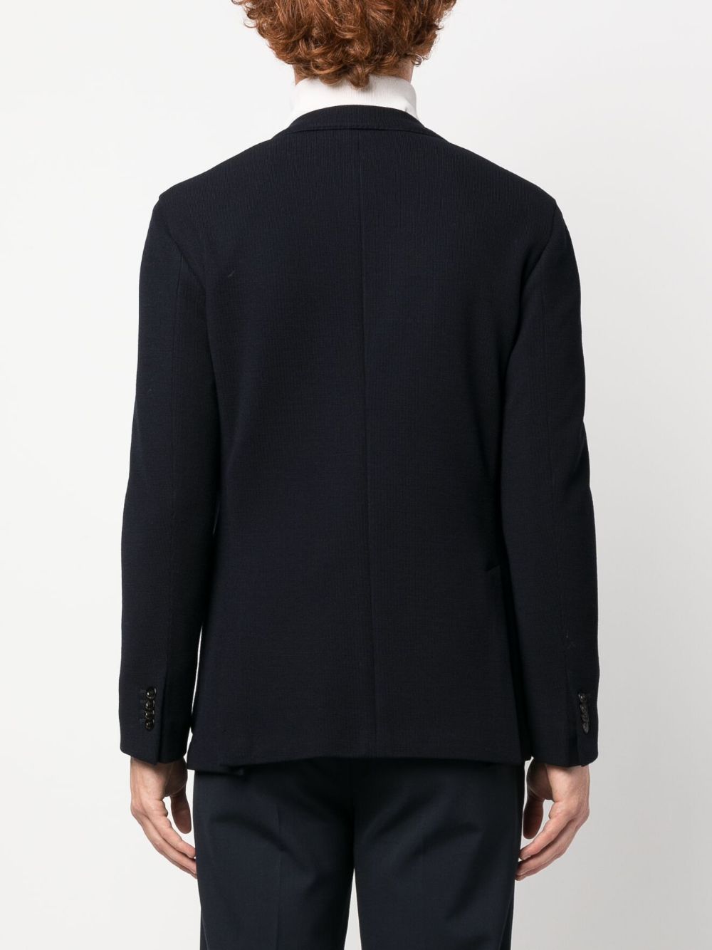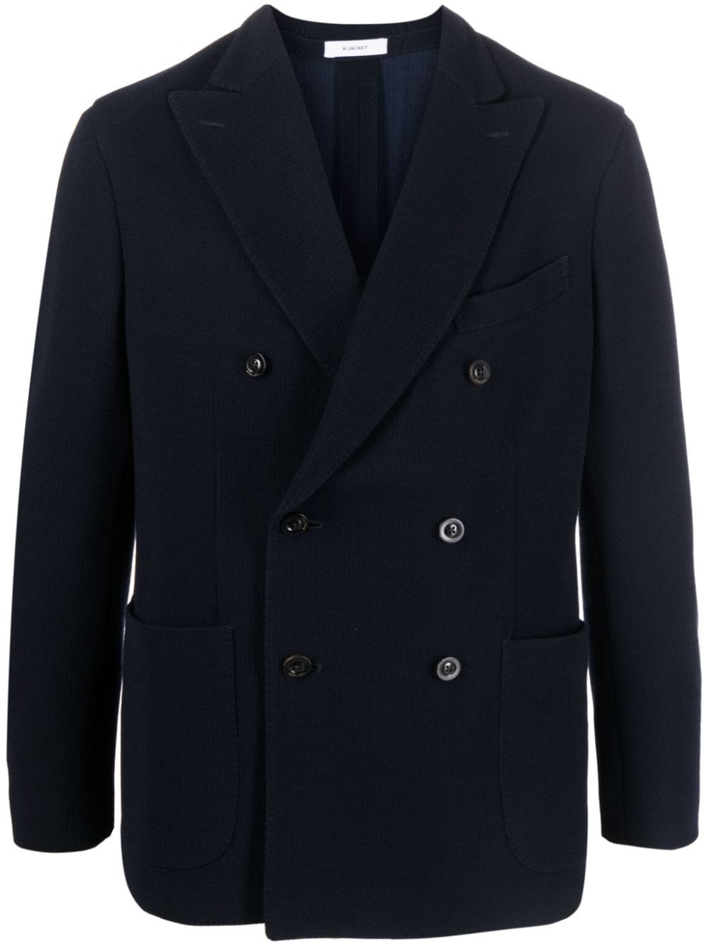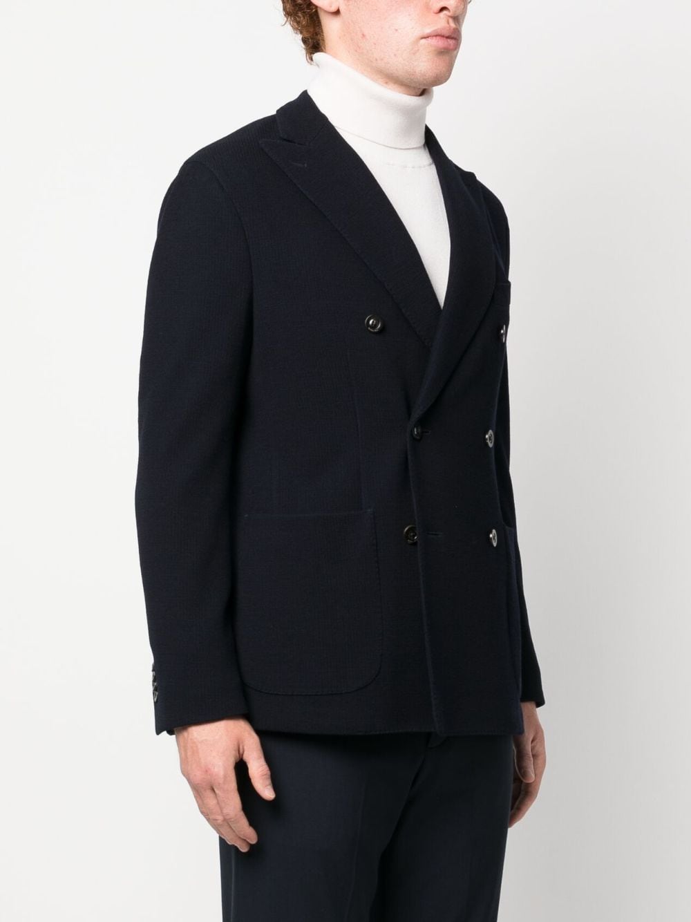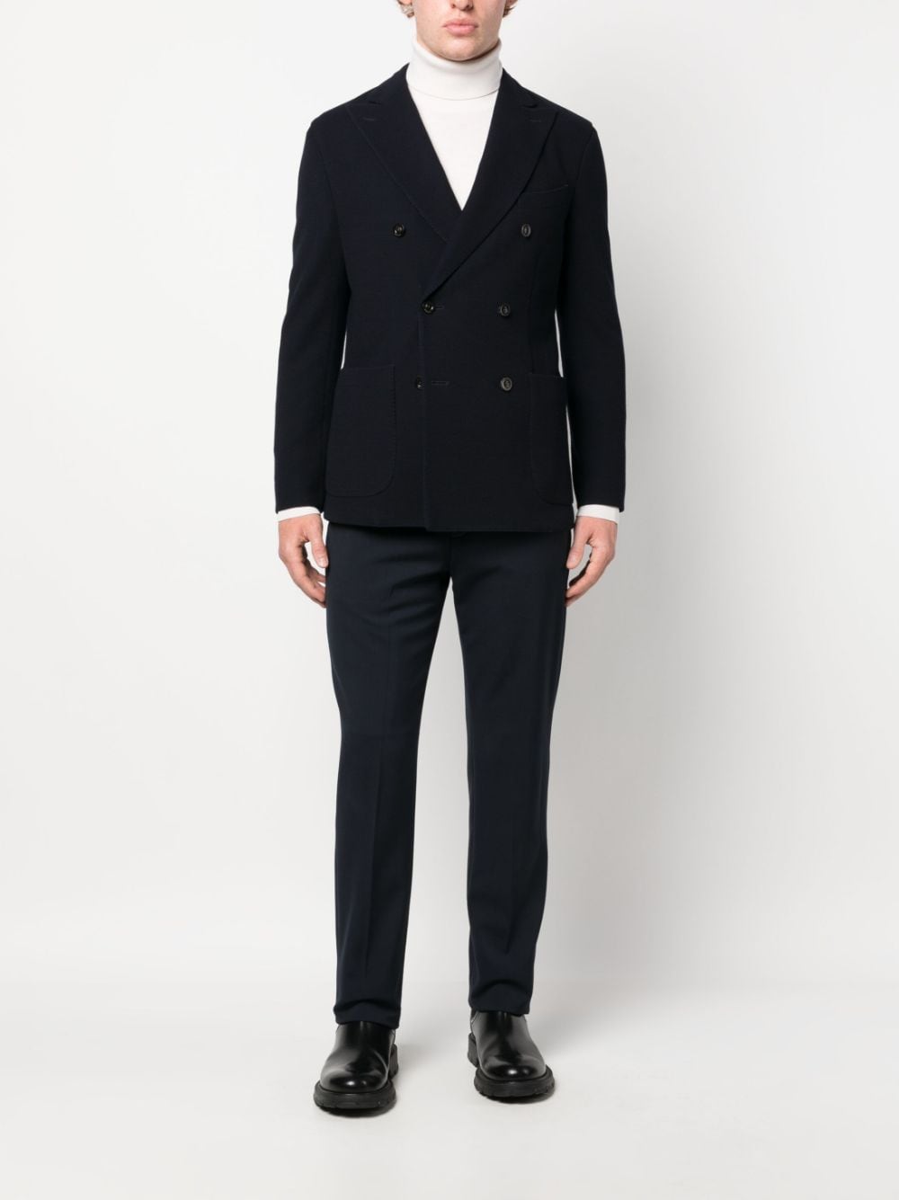 midnight blue virgin wool blend peak lapels double-breasted button fastening long sleeves buttoned-cuff sleeves chest welt pocket two side patch pockets straight hem