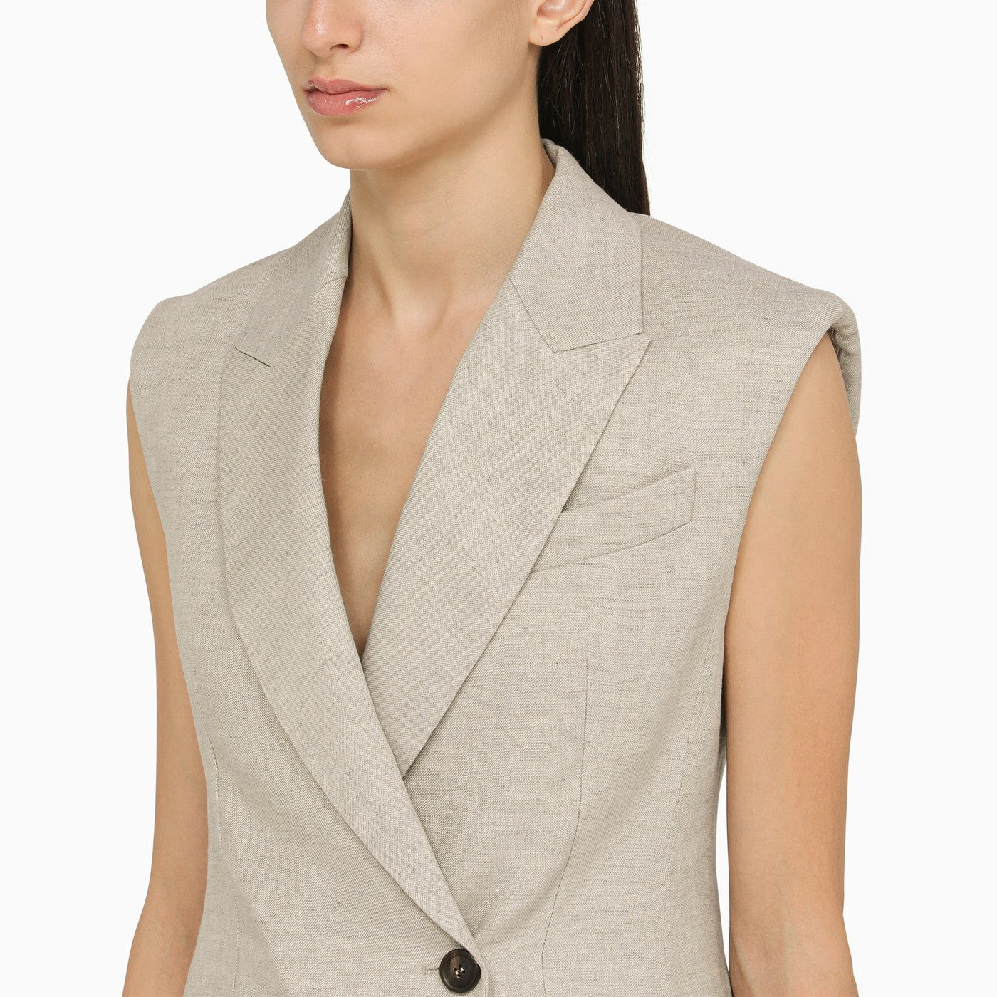 Gilet di lino grigio chiaro di Brunello Cucinelli con risvolti a punta, un fissaggio sul pulsante anteriore, due tasche a flap, una tasca a goccia sul petto e un singolo sfiato sul retro.