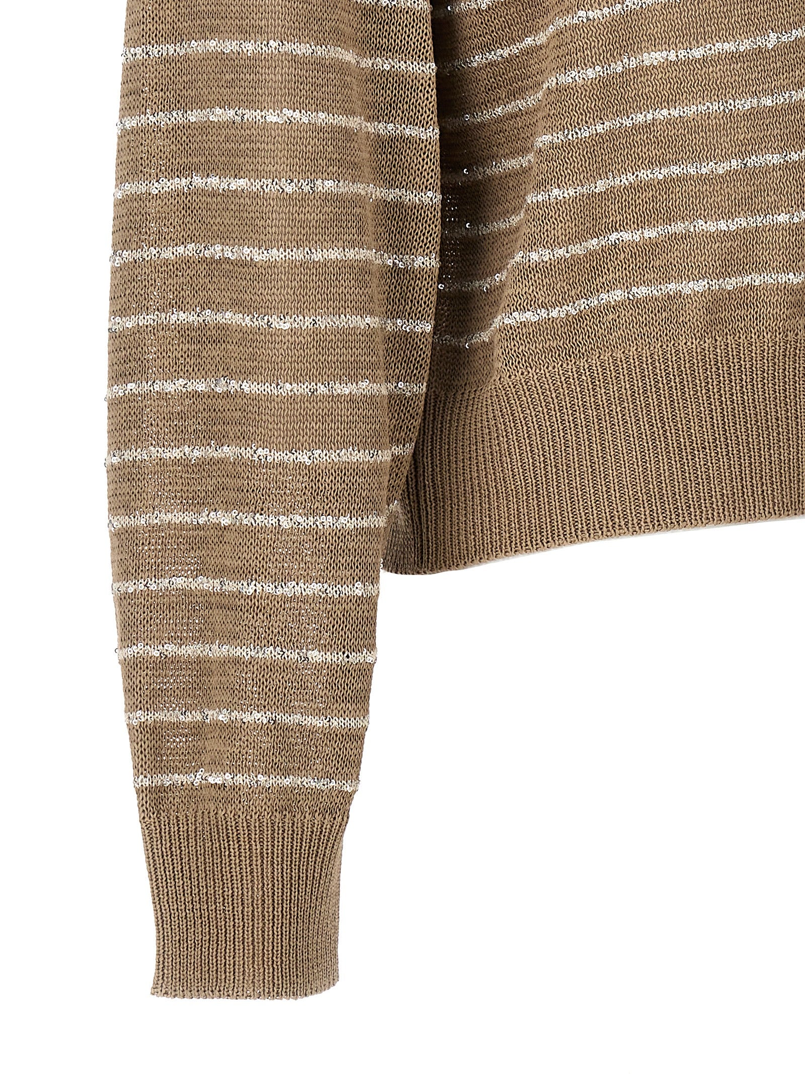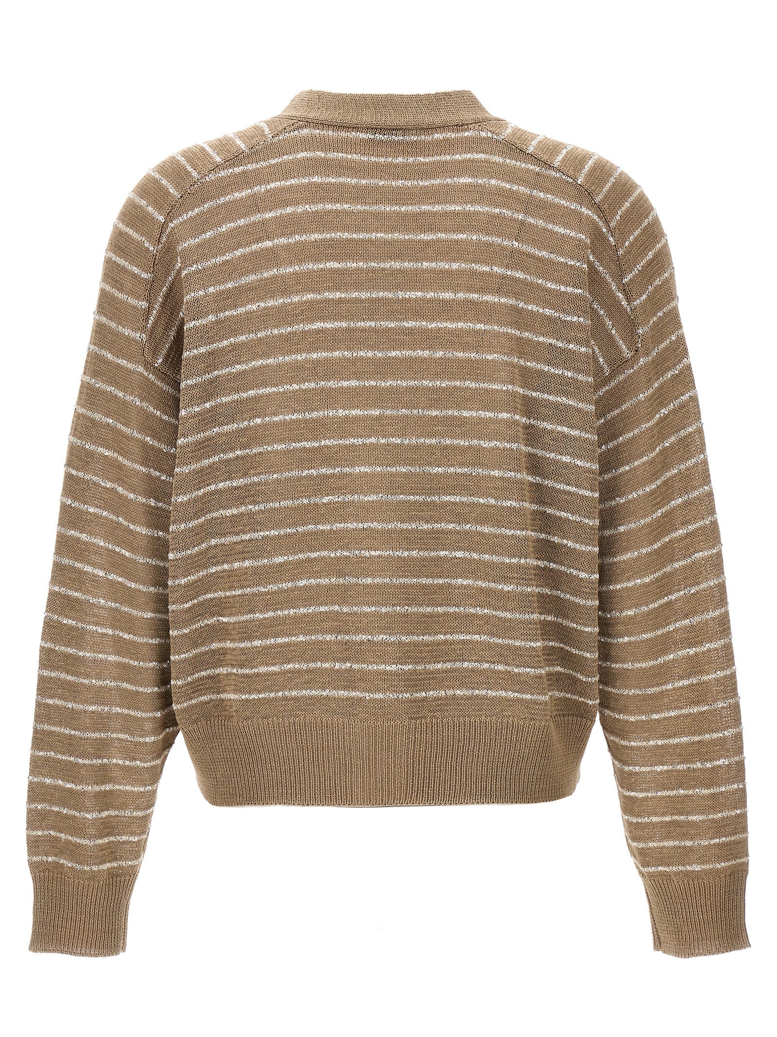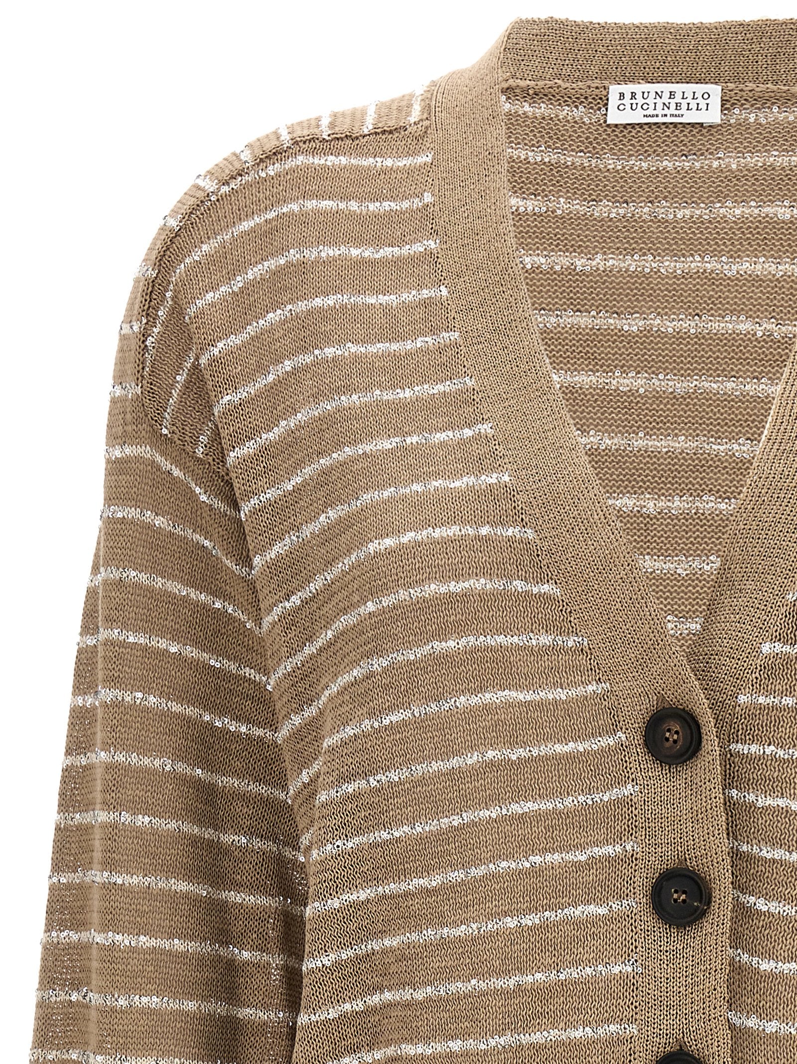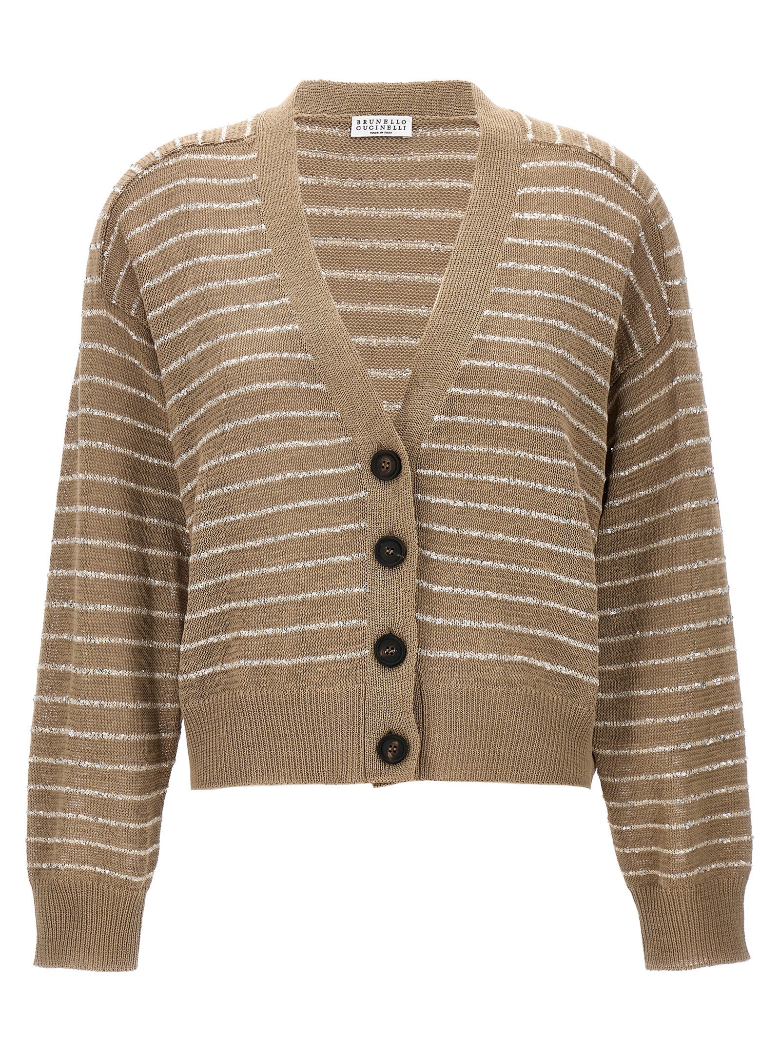 Cardigan di cotone a strisce con appliqué con paillettes all-over, chiusura a bottone, maniche a fanatico lungo.