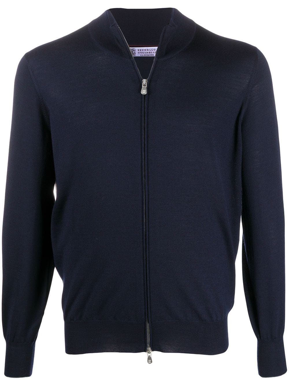 Il maglione a taglio di lana di lana virgin navy si fonde con un maglione con zip-through di Brunello Cucinelli con costruzione a maglia, bordo a coste a coste, collo alto, maniche lunghe e fissaggio a zip anteriore.