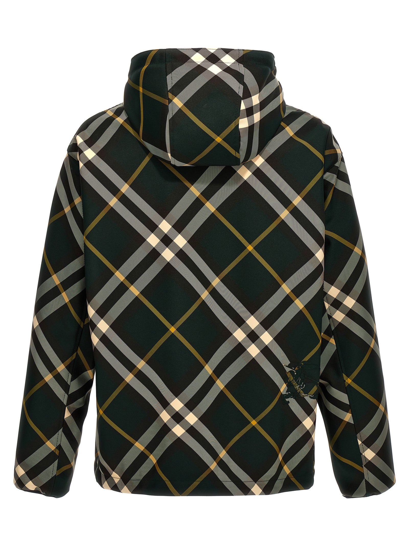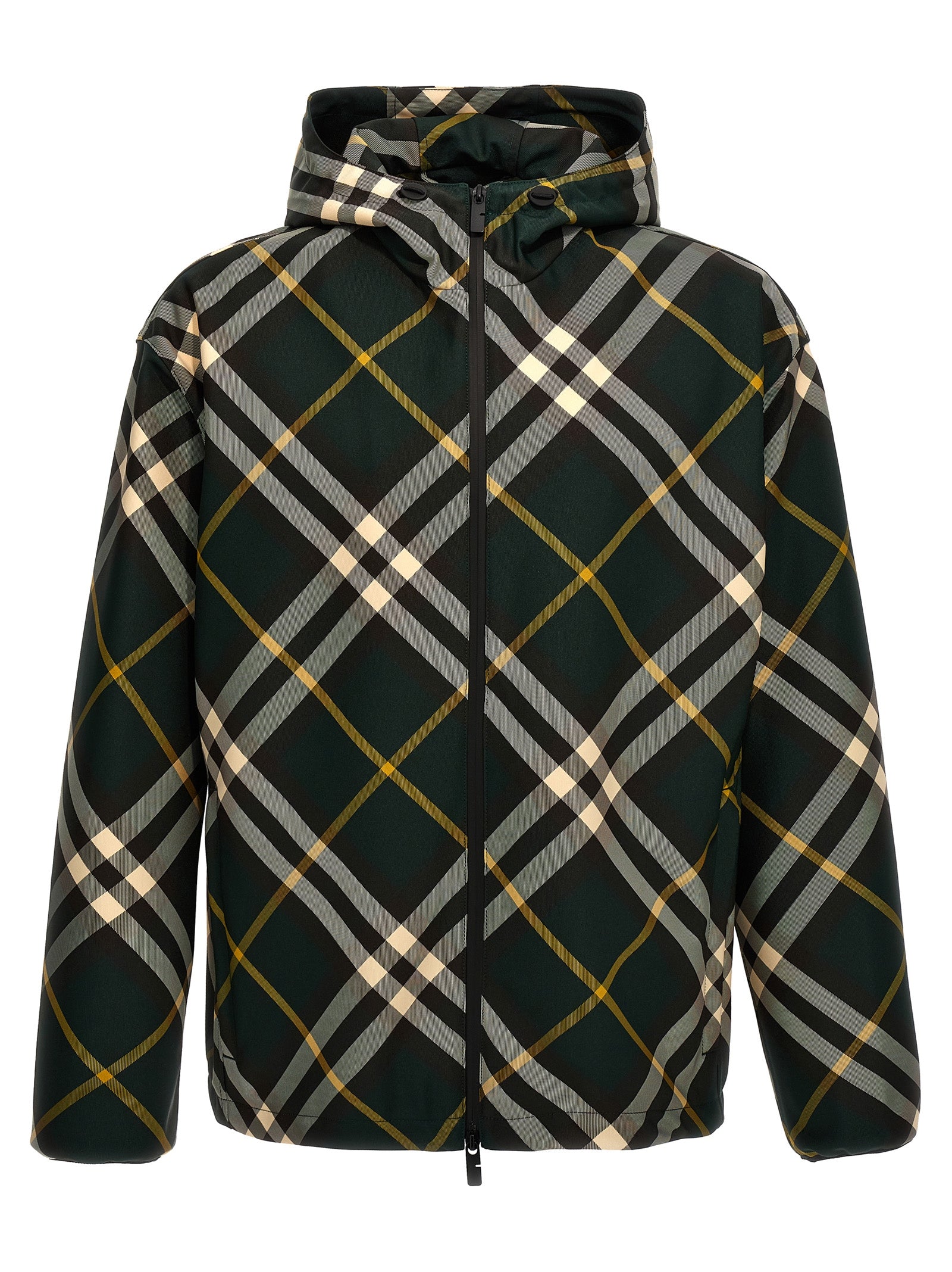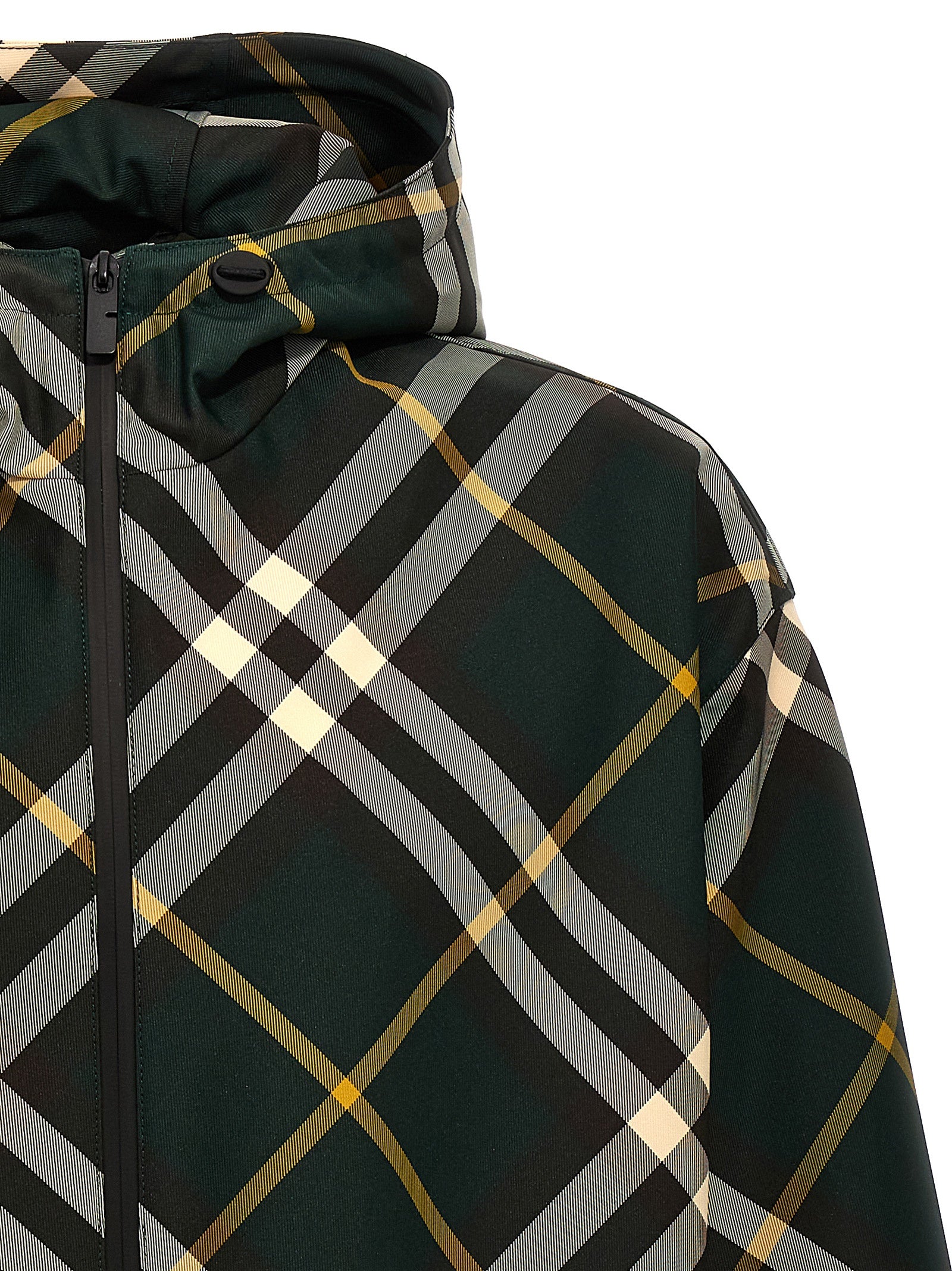Giacca in tessuto tecnico con motivo a controllo, cappuccio e chiusura con zip. Tasche con zip laterali.