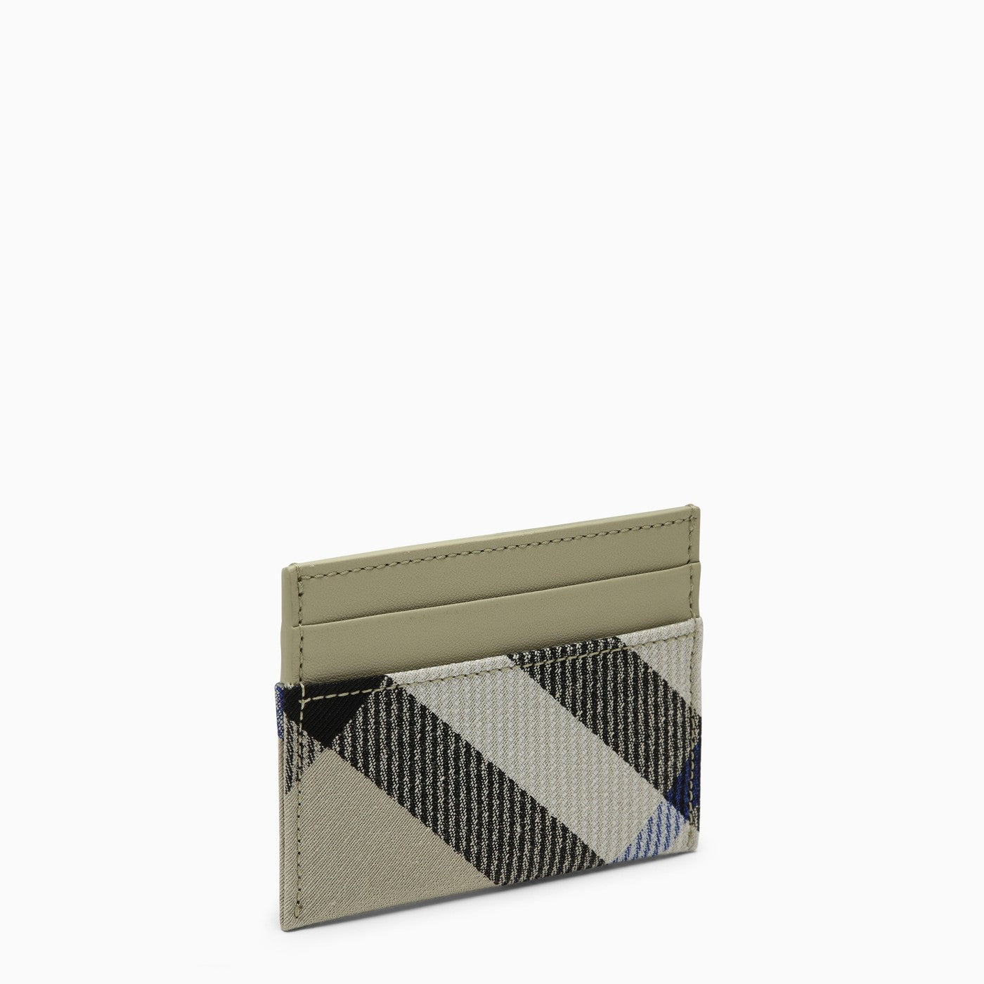 Titolare della carta di credito di Burberry in controllo Jacquard tessuto e pelle color lichen, con quattro slot di carte di credito e uno slot centrale.