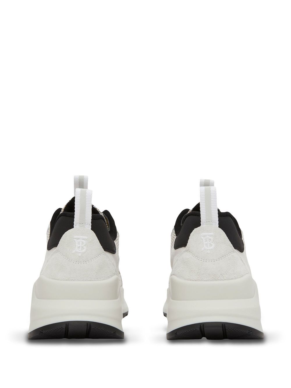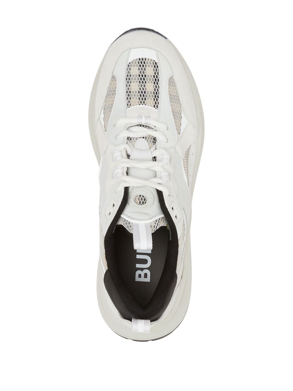 Controllare gli addestratori a basso contenuto di mesh da Burberry con linguette bianche, doppie pull all'apertura, inserti in mesh, pista di marca, lingua in rilievo con logo, fissaggio a pizzo anteriore, punta rotonda e suola in gomma.
