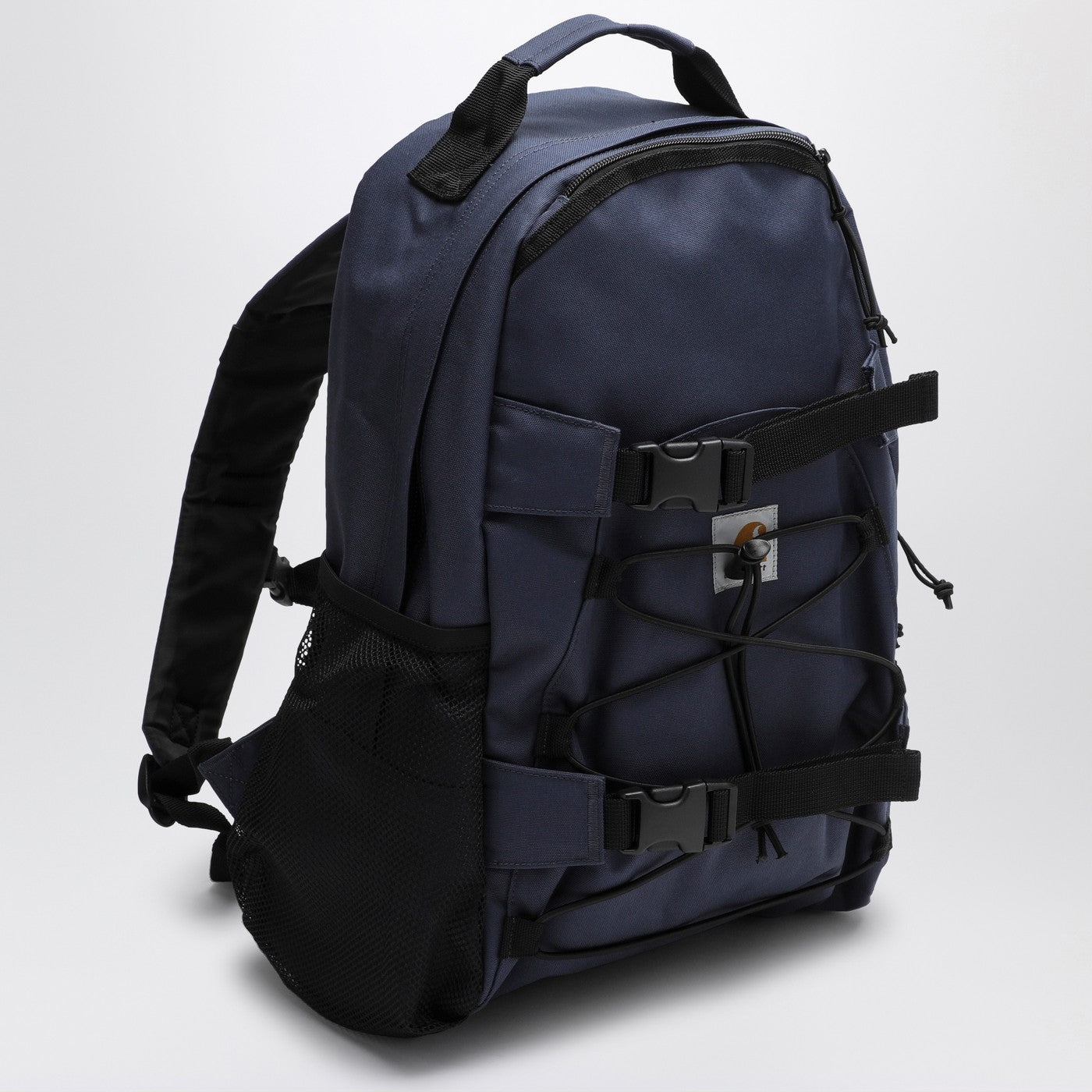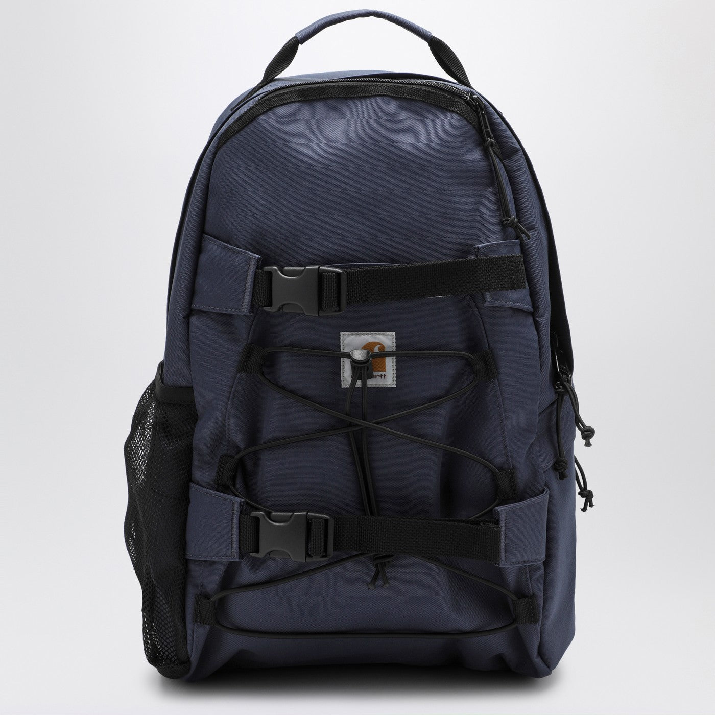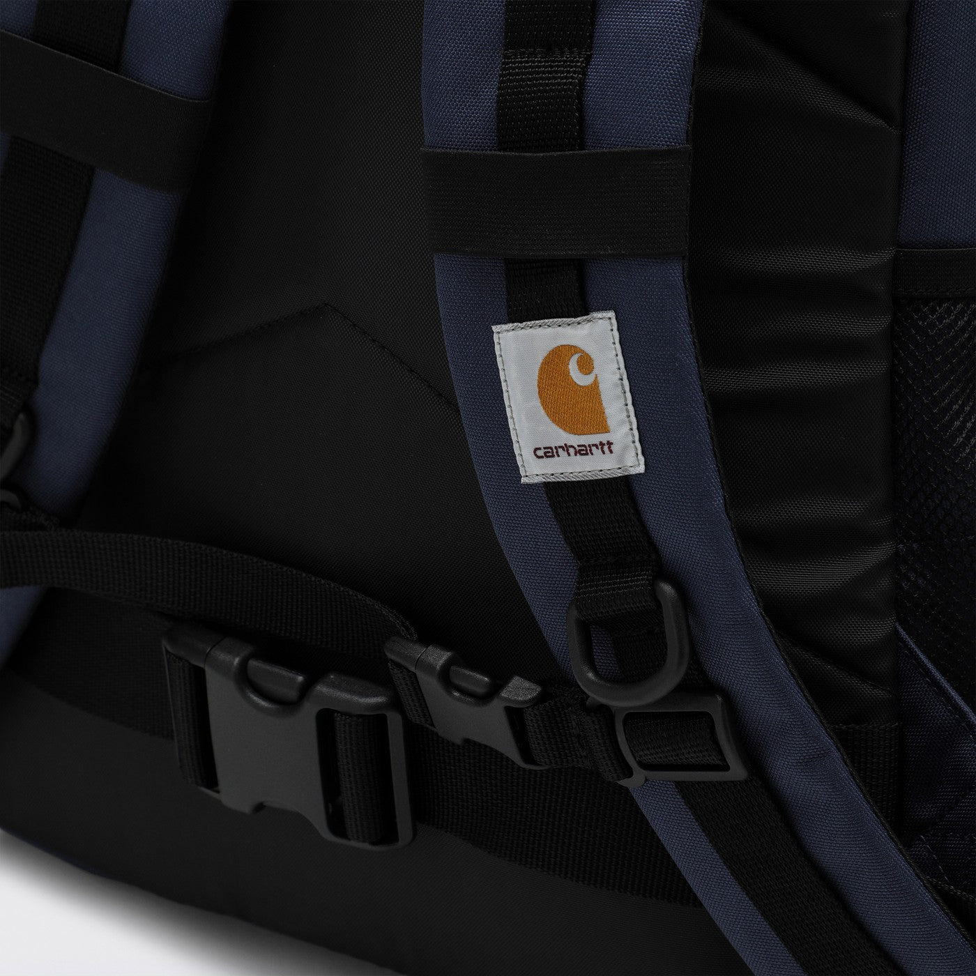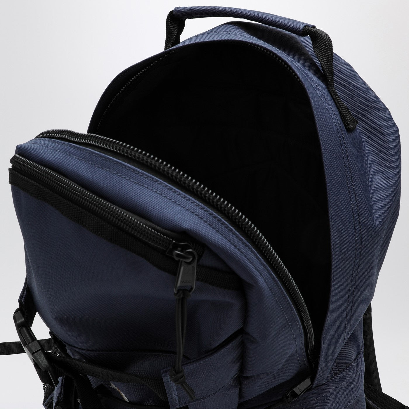 Lo zaino di Carhartt Wip in tela di miscela in poliestere riciclata resistente all'acqua blu, con tasche laterali con mesh e zip, a doppia cerniera a zip, spalline imbottite e schiena per l'effetto ammortizzante, fibbie e cinghie anteriori per attacco skateboard e etichetta logo quadrata cucita sulla parte anteriore.