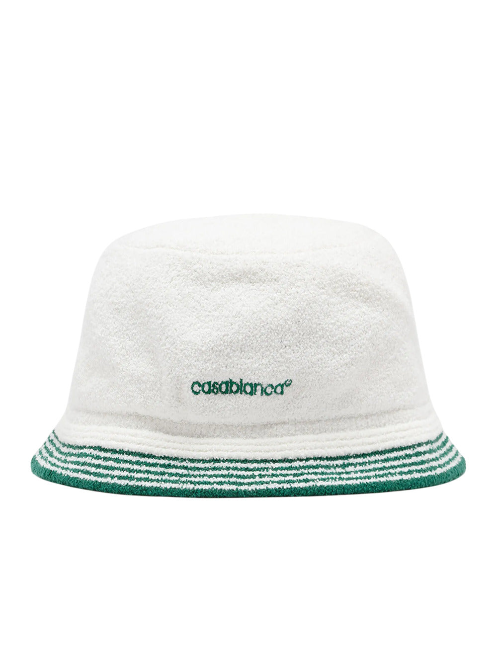 Il cappello da secchio White Casablanca è realizzato in cotone Terry e presenta ricami di logo verde e un design a strisce sull'orlo.