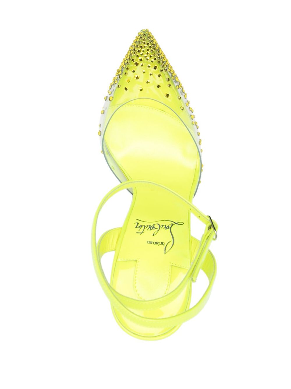 Spikaqueen da 100 mm pompe in pelle di brevetto di Christian Louboutin (VIP) con giallo al limone, pelle di vitello, finitura brevettata, design trasparente, punta puntata, cinturino alla caviglia alla cabina, a pista di marca, suola rossa firmata, tacco a filo di fiocco alto e abbellimento di rinestone.