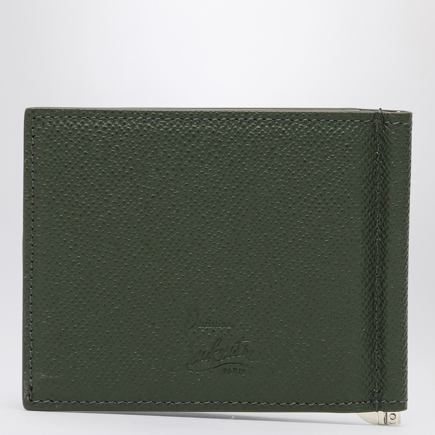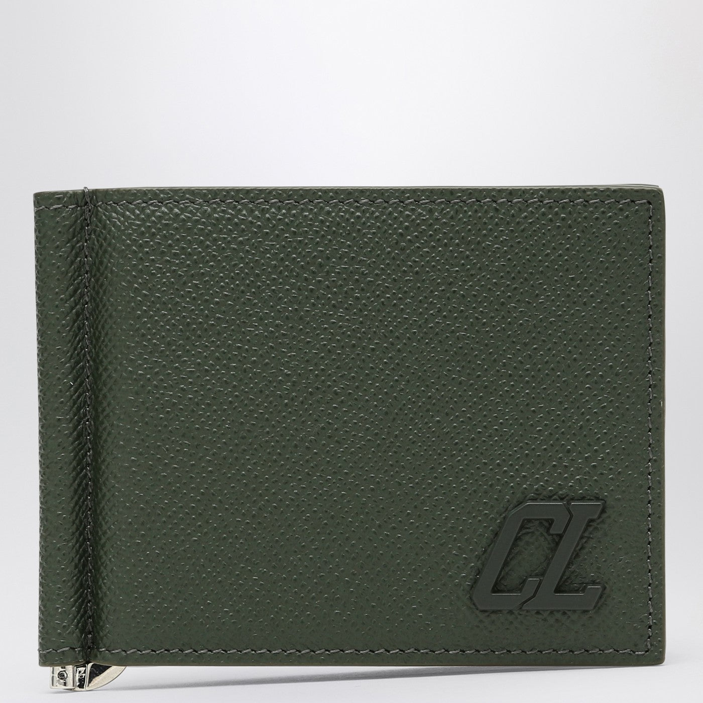Portafoglio in cuoio a grana verde scuro di Christian Louboutin, con diversi slot di carte interni, una targa logo sul davanti, un compartimento di banconote interni e un clip di denaro.