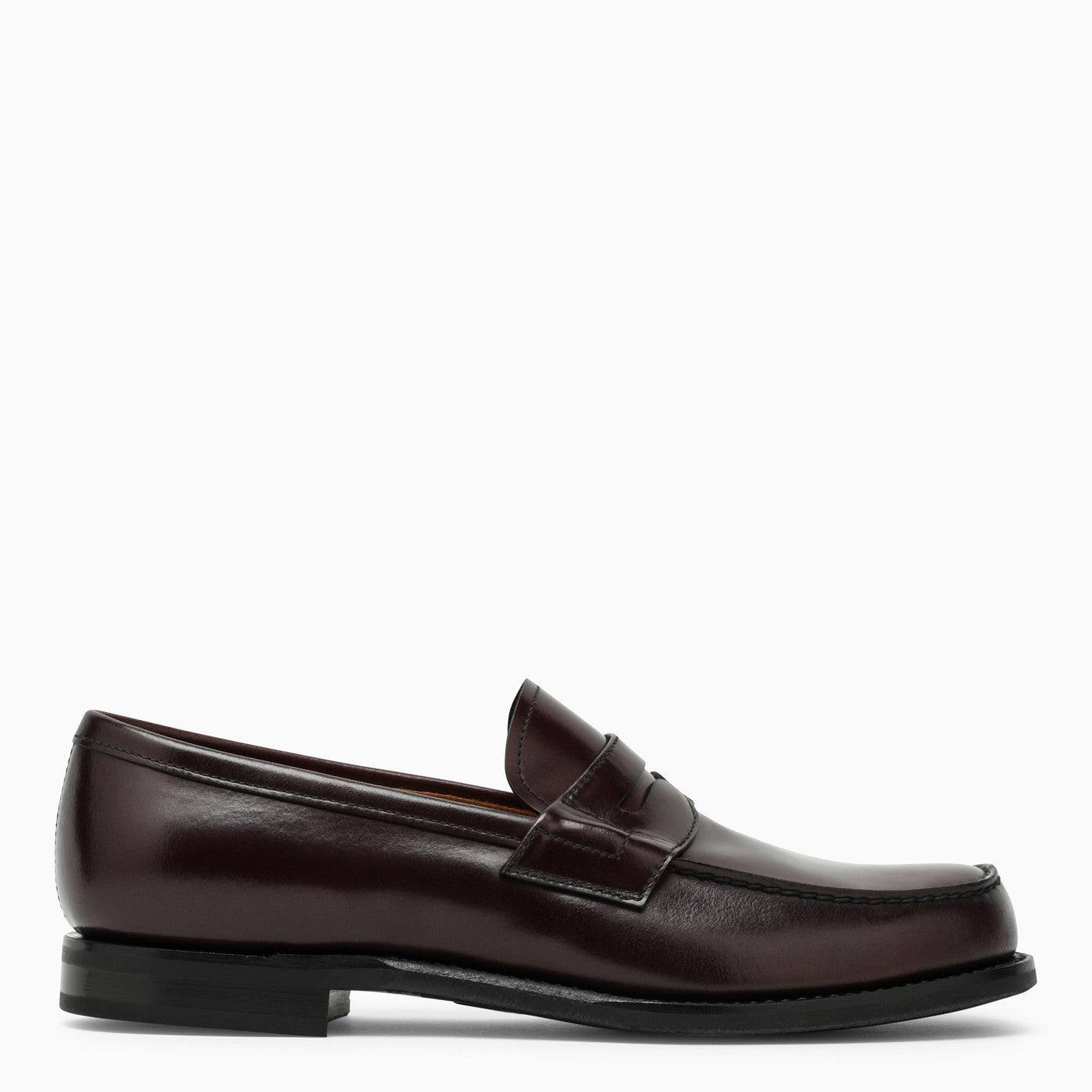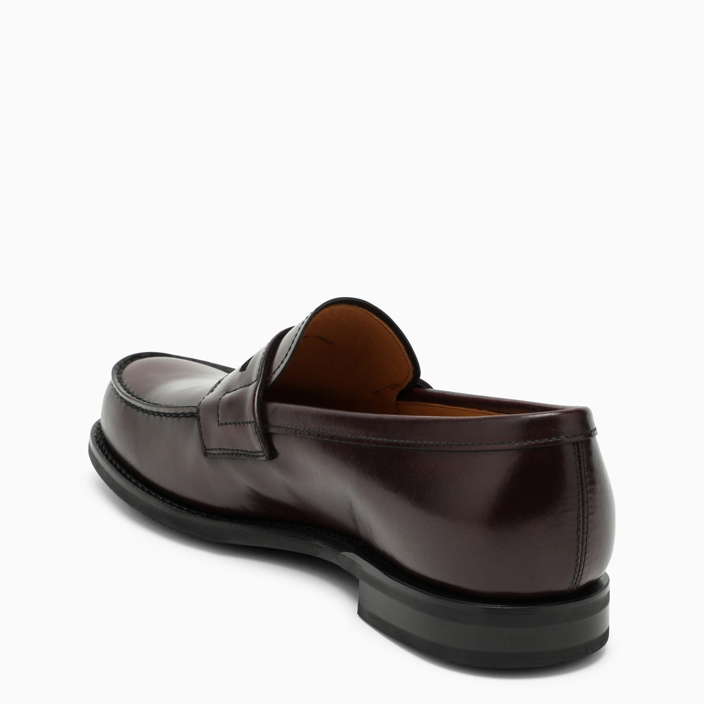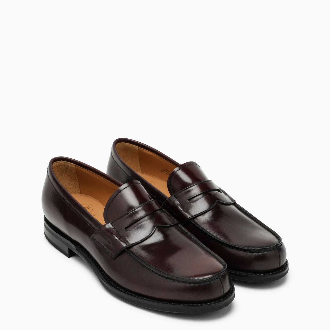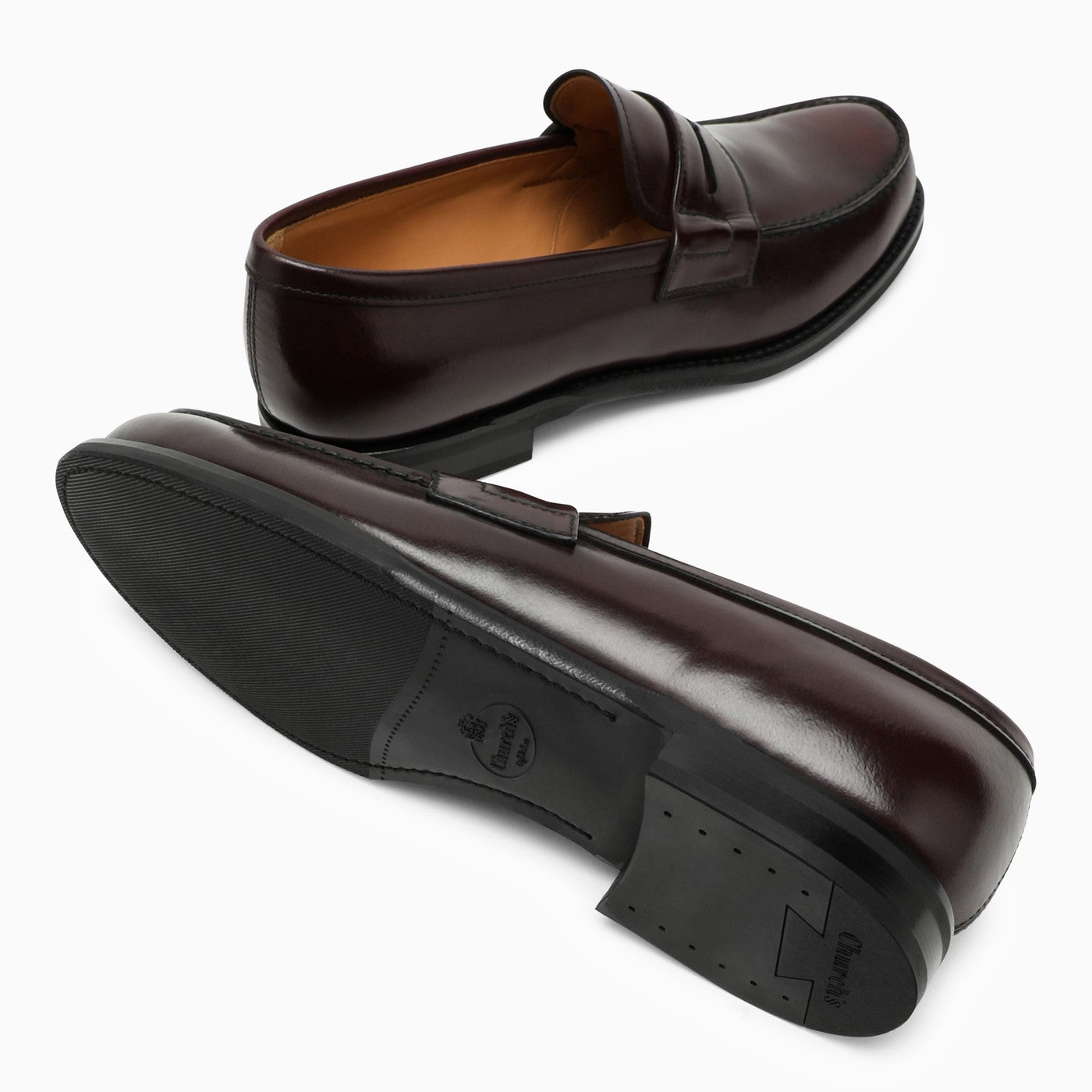 Il mocassino della classica chiesa in pelle bordeaux liscia, con maschera tono su tono, punta arrotondata e suola in gomma.
