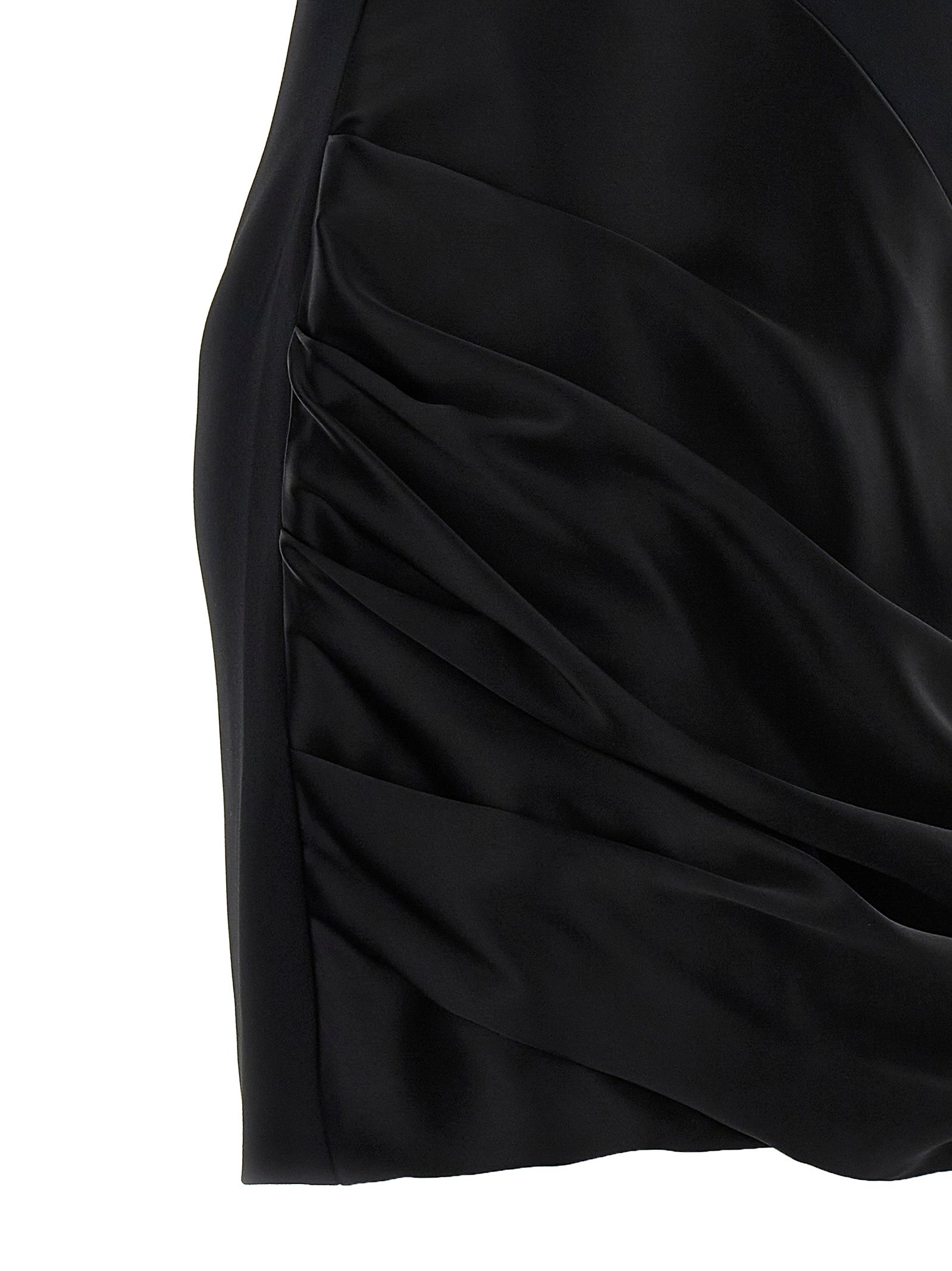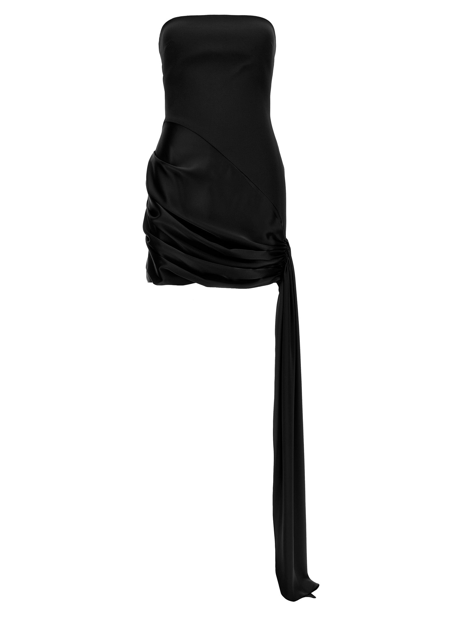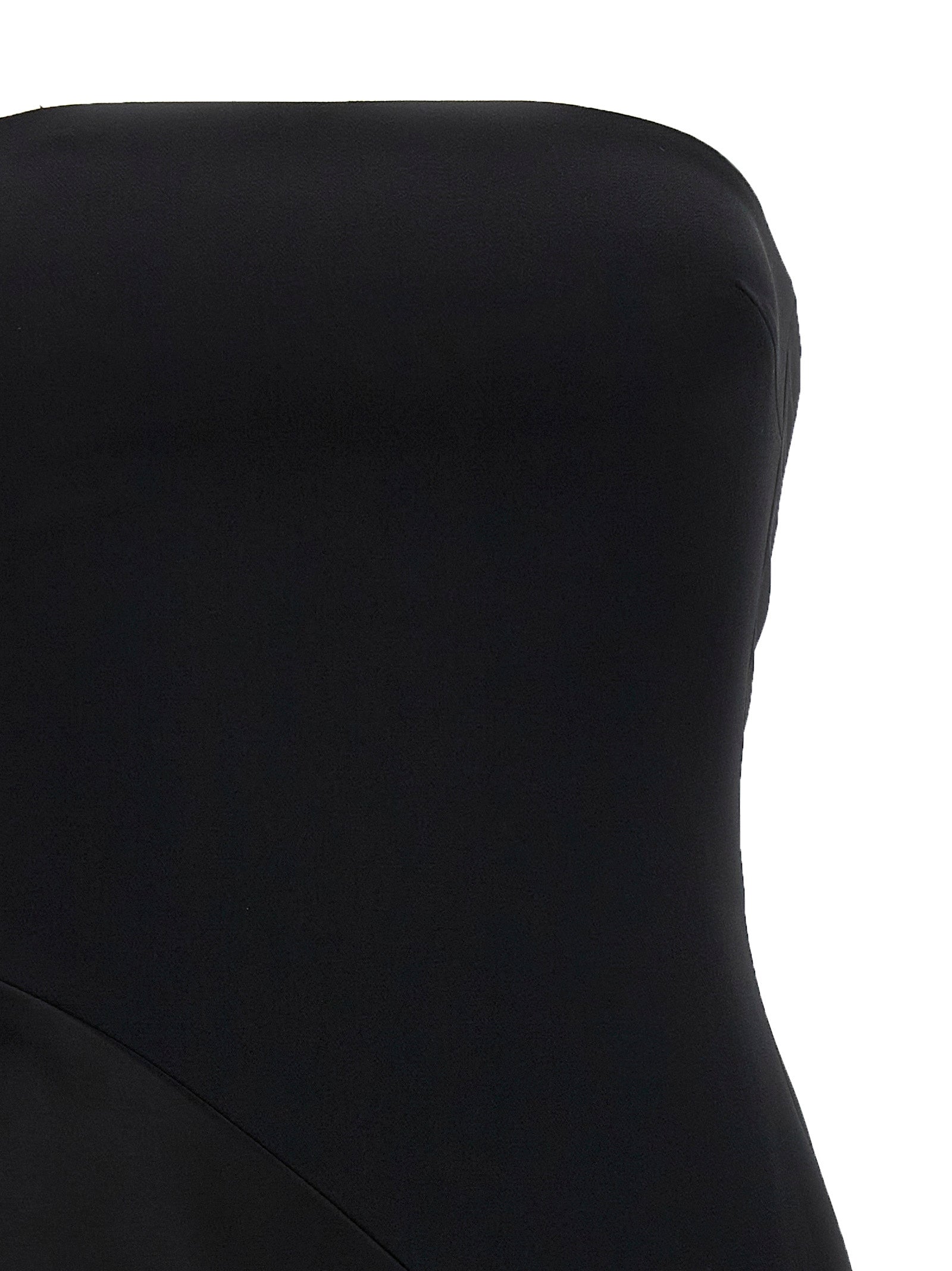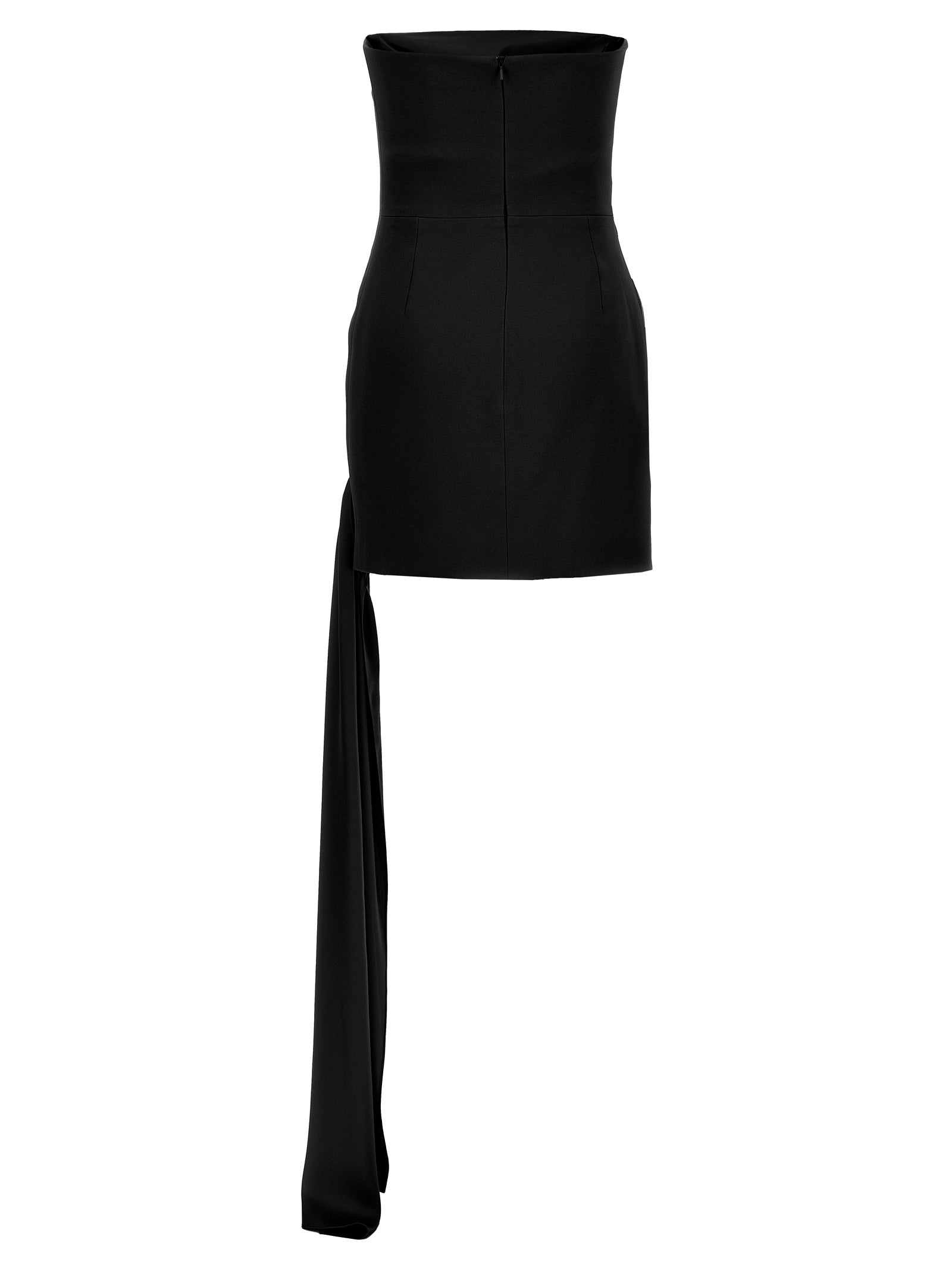 Abito da mini mini senza spalline "asimmetrico in tessuto elastico cady e raso, modello di spalla, dettaglio del treno anteriore, chiusura a zip posteriore.