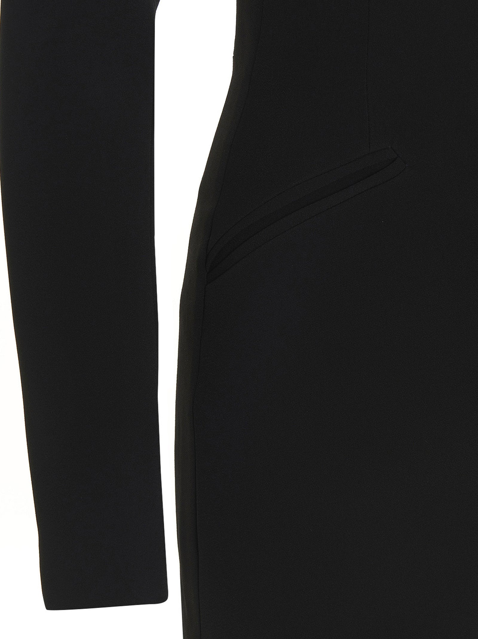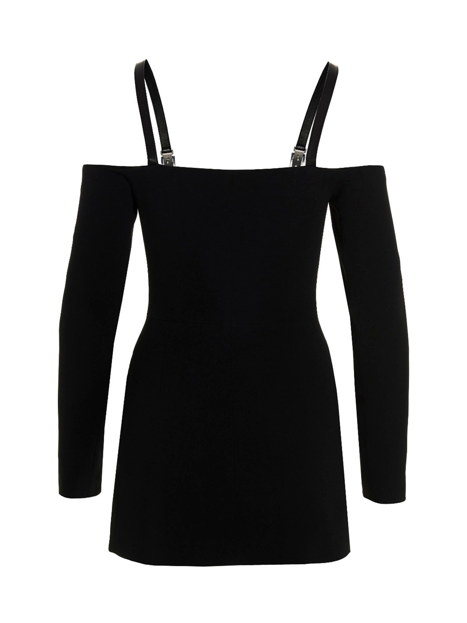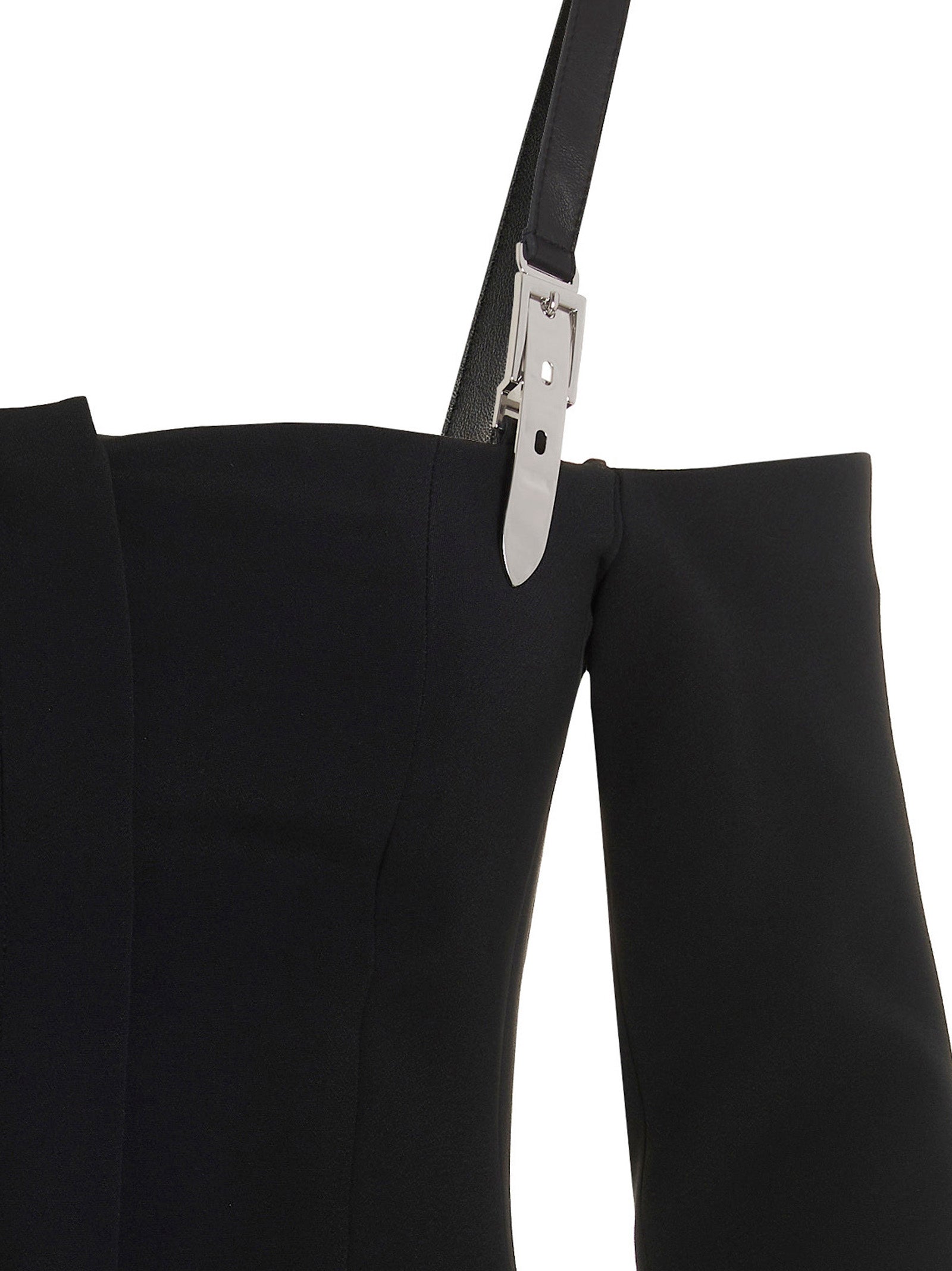 La miscela viscosa con la fibbia della fibbia della cintura si miscela fuori dalla spalla con maniche lunghe, spalle in pelle incrociate sul retro con dettagli di fibbie di metallo, una chiusura a bottone con zip e anteriore, tasche e un dettaglio ritagliato sulla parte anteriore sul lato.