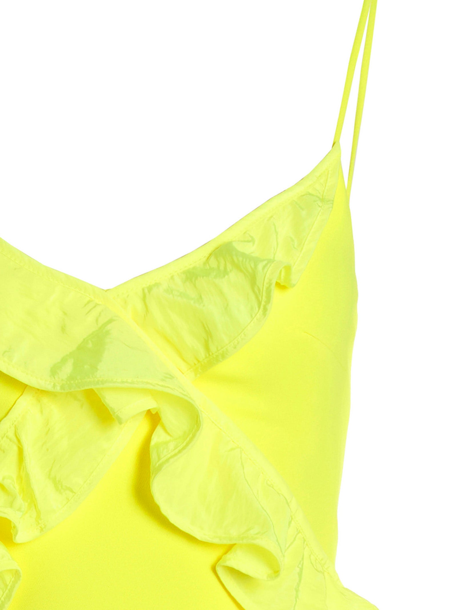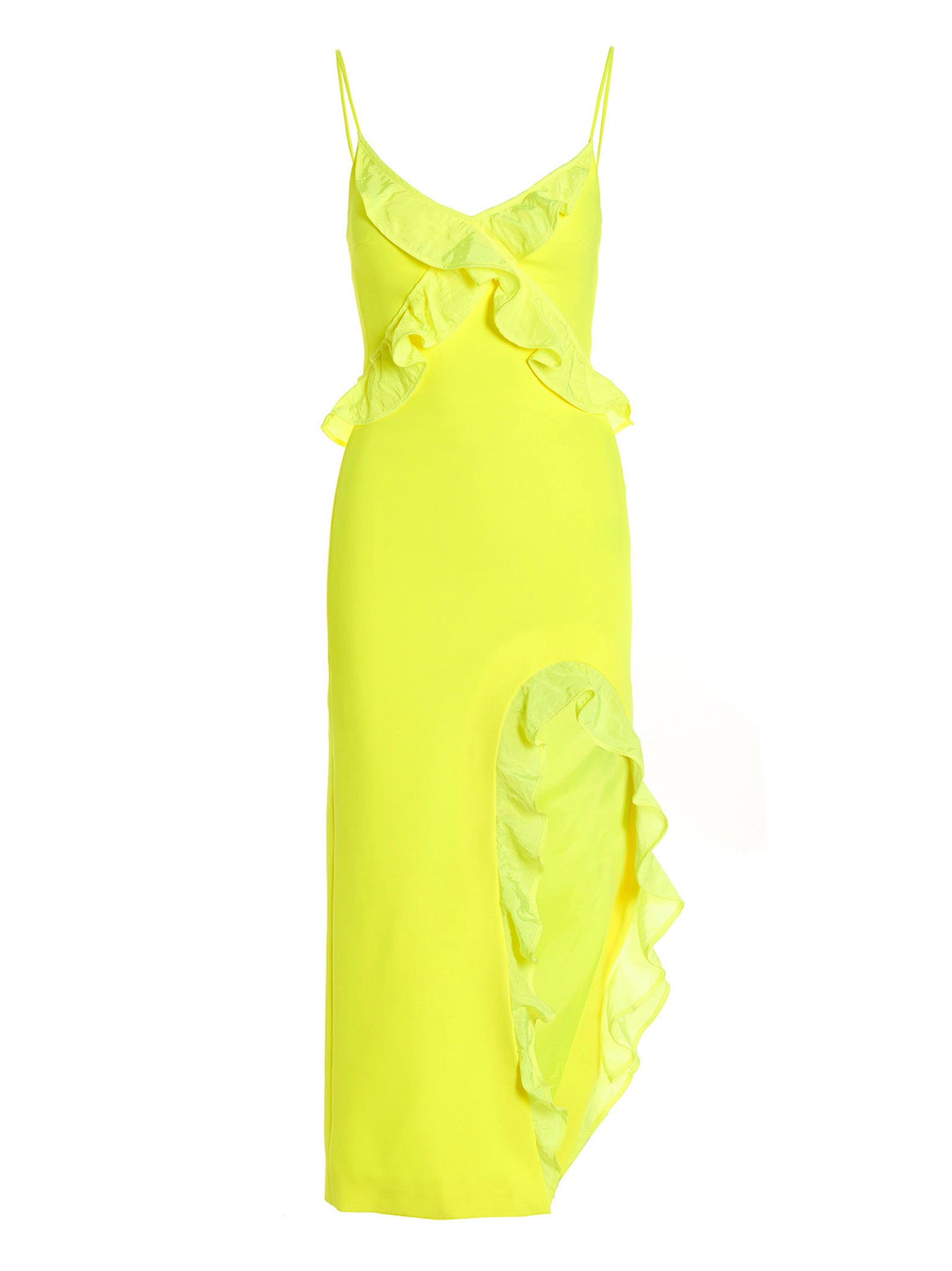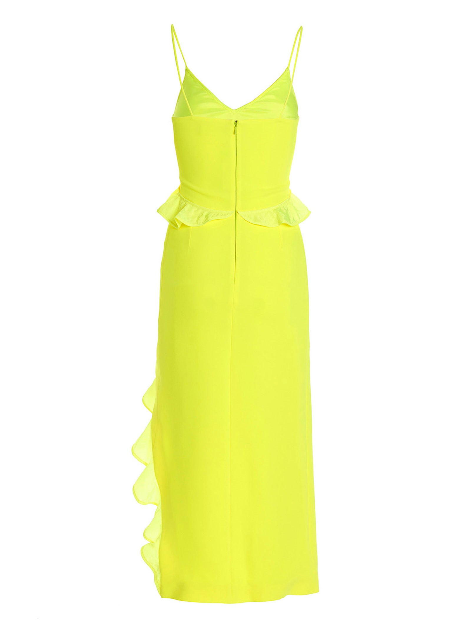 Abito per miscela viscosa di Crossbody & Open Leg Buffle con scollo a V, dettagli con volant LL-over, larga divisione anteriore, cinghie sottili e chiusura a zip posteriore.