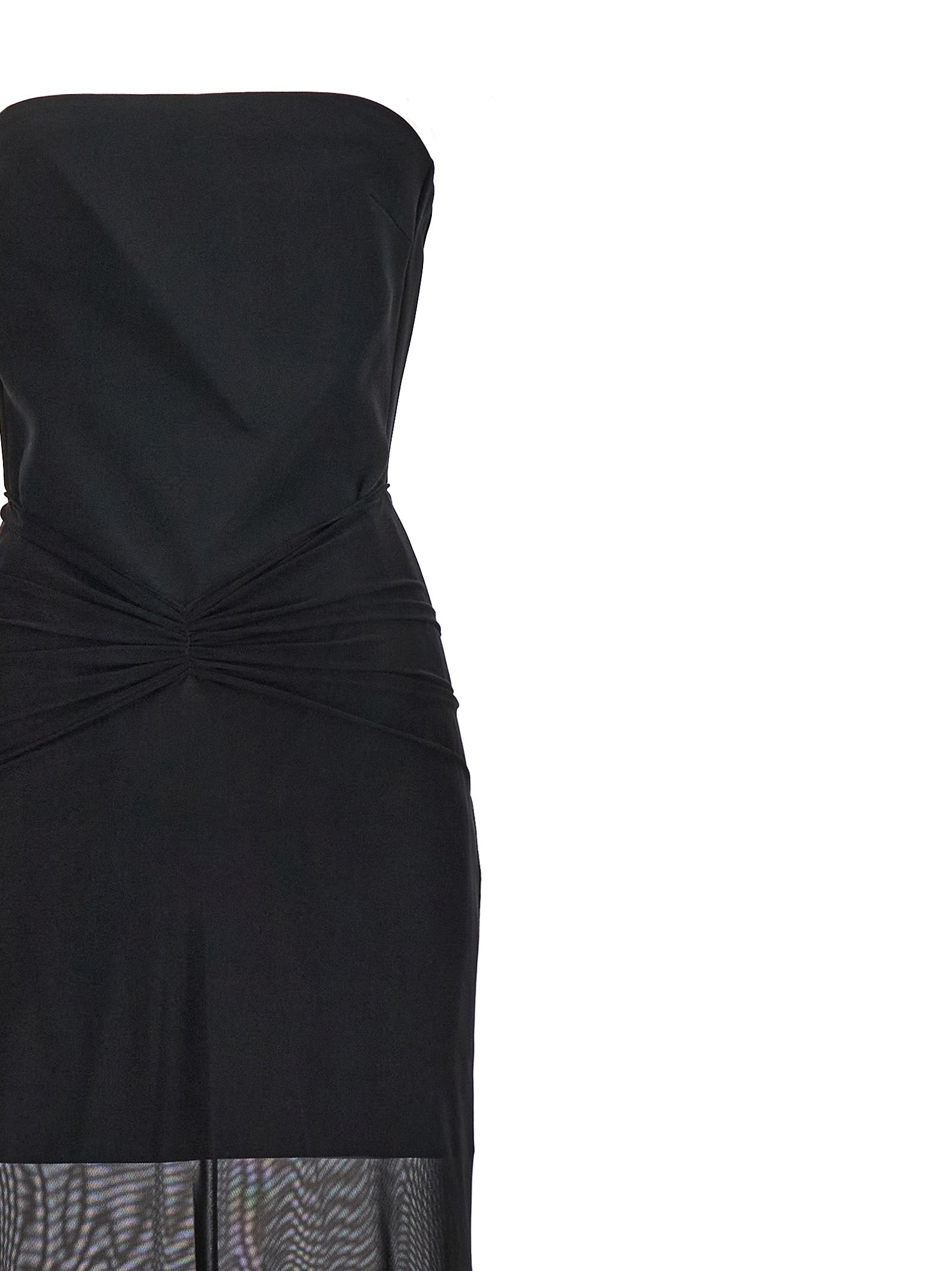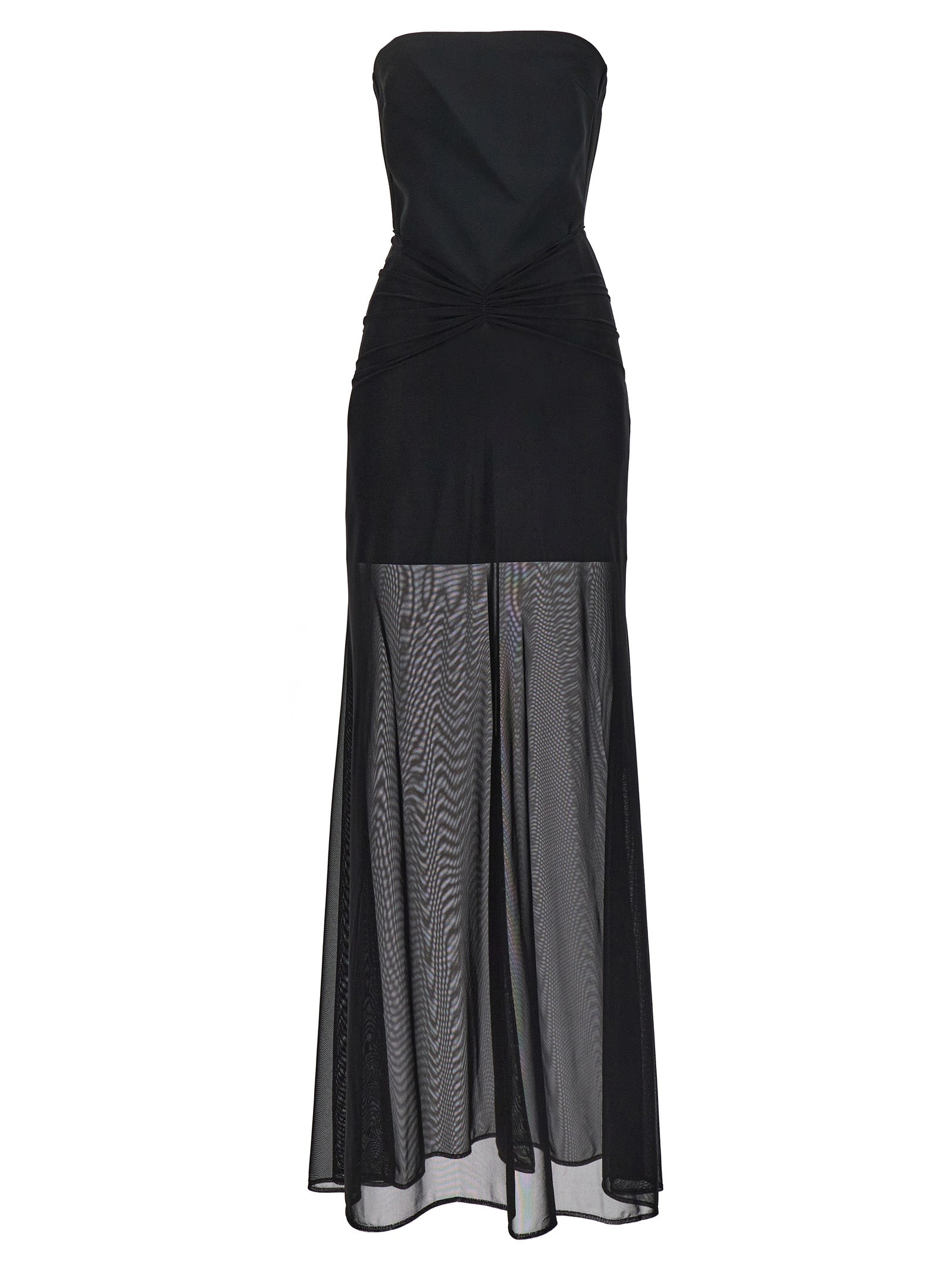 Abito senza spalline in tessuto allungato con drappeggio in vita, gonna lunga con effetto trasparente.