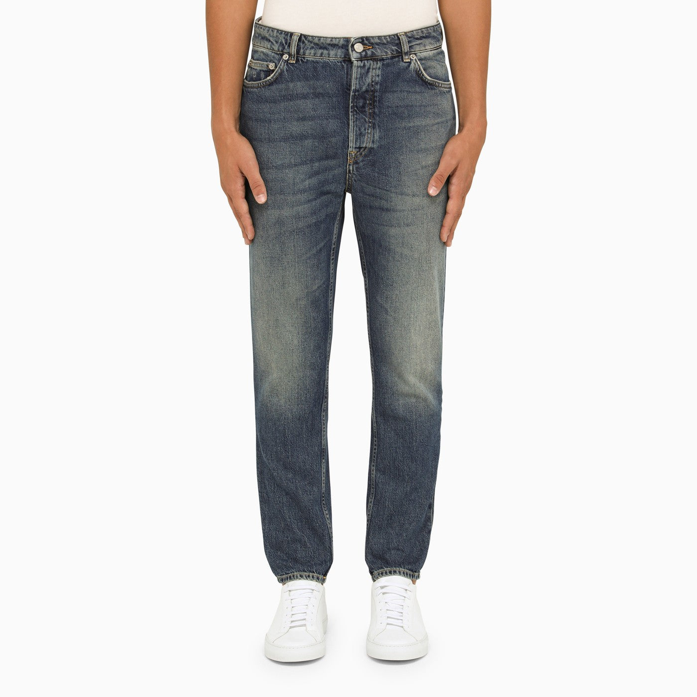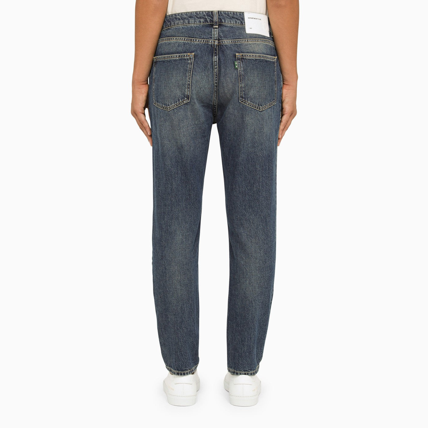 Jeans slim Department 5 in denim di cotone blu, caratterizzati da tre tasche sul davanti, due tasche sul retro e patch logo sul retro.