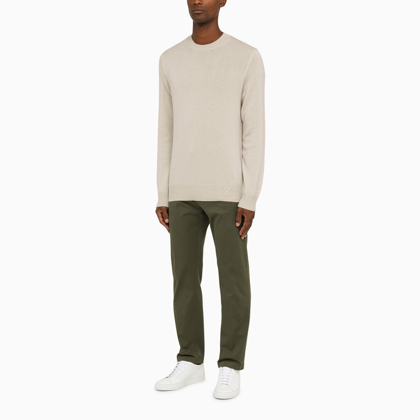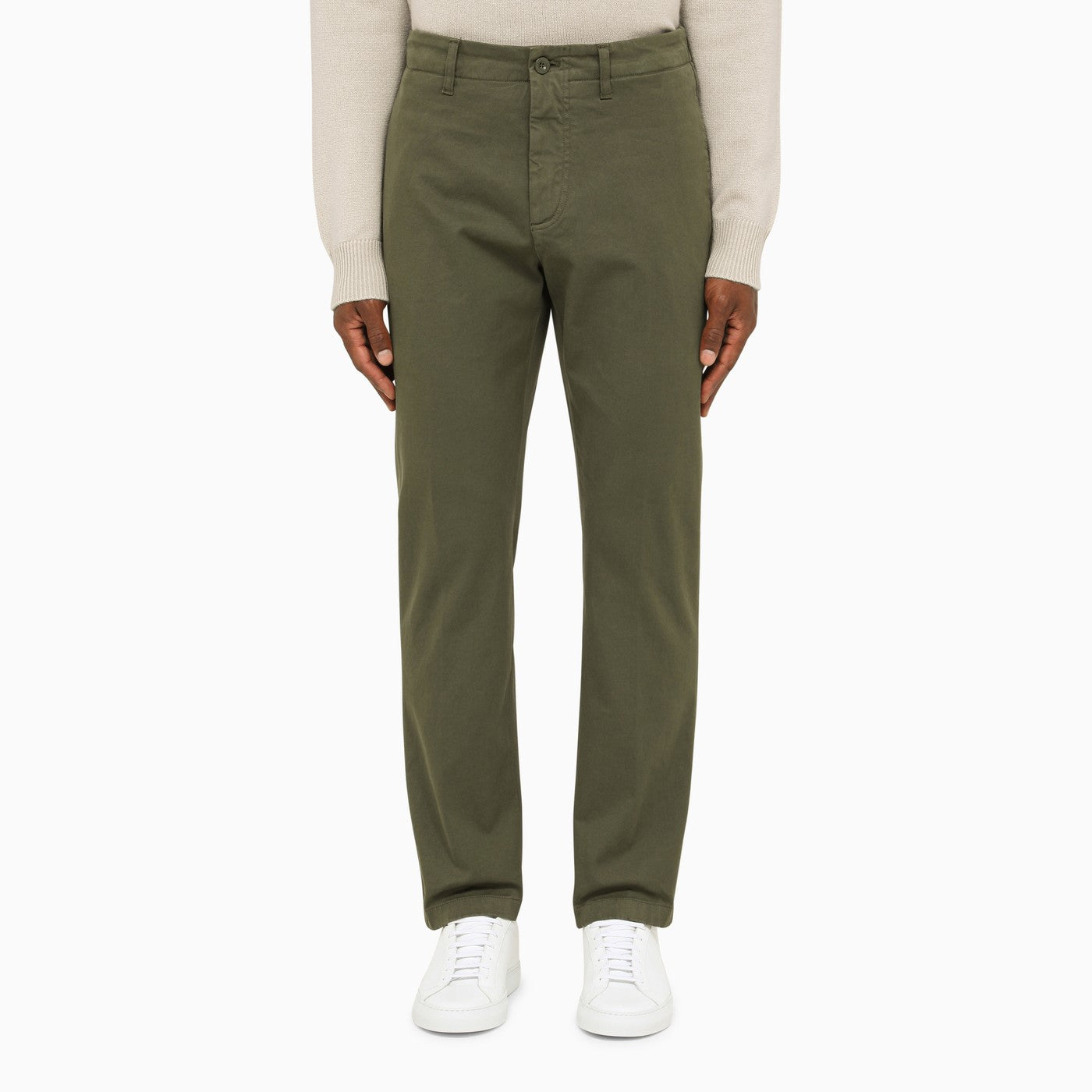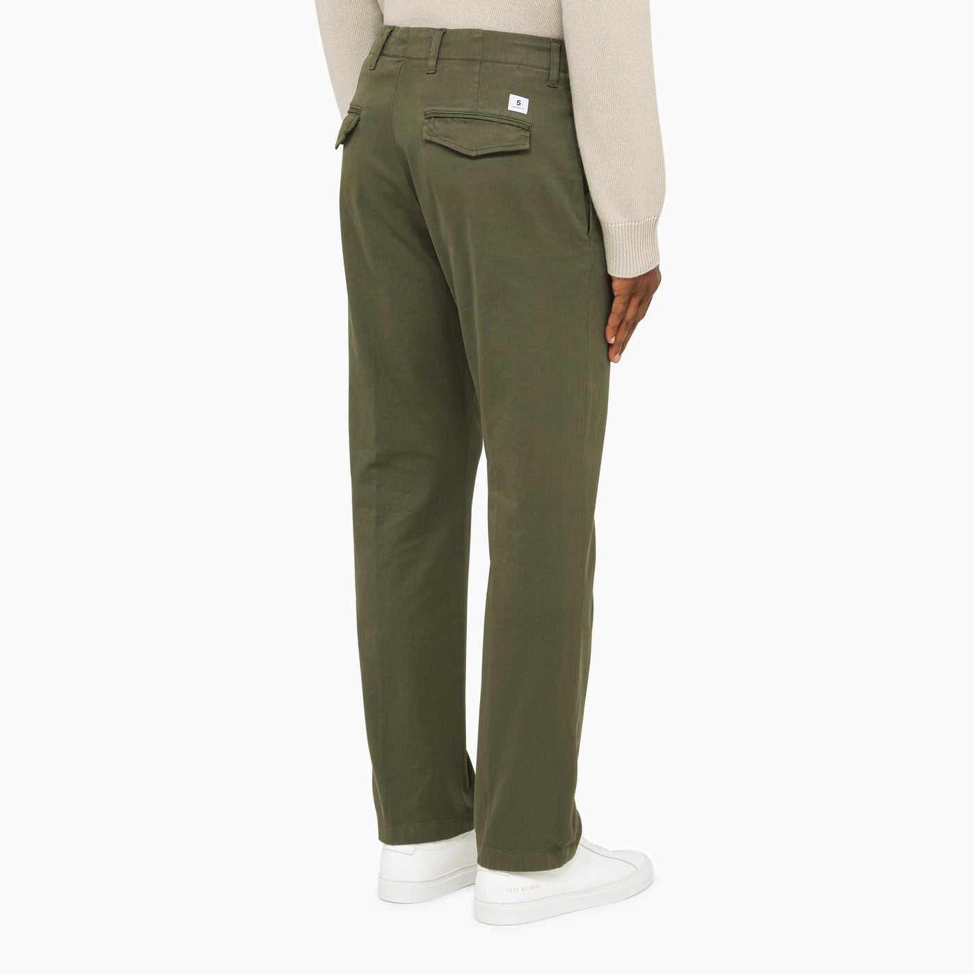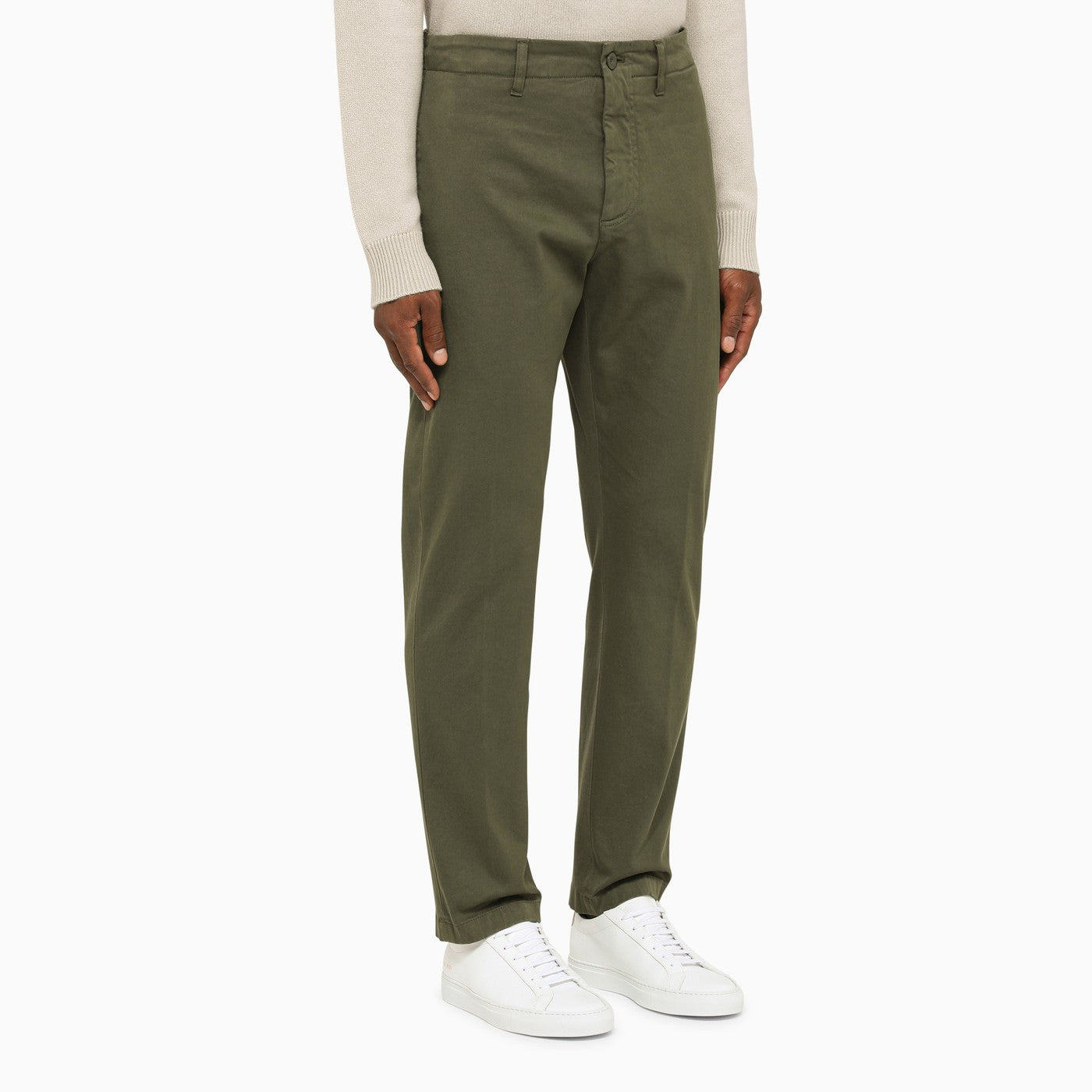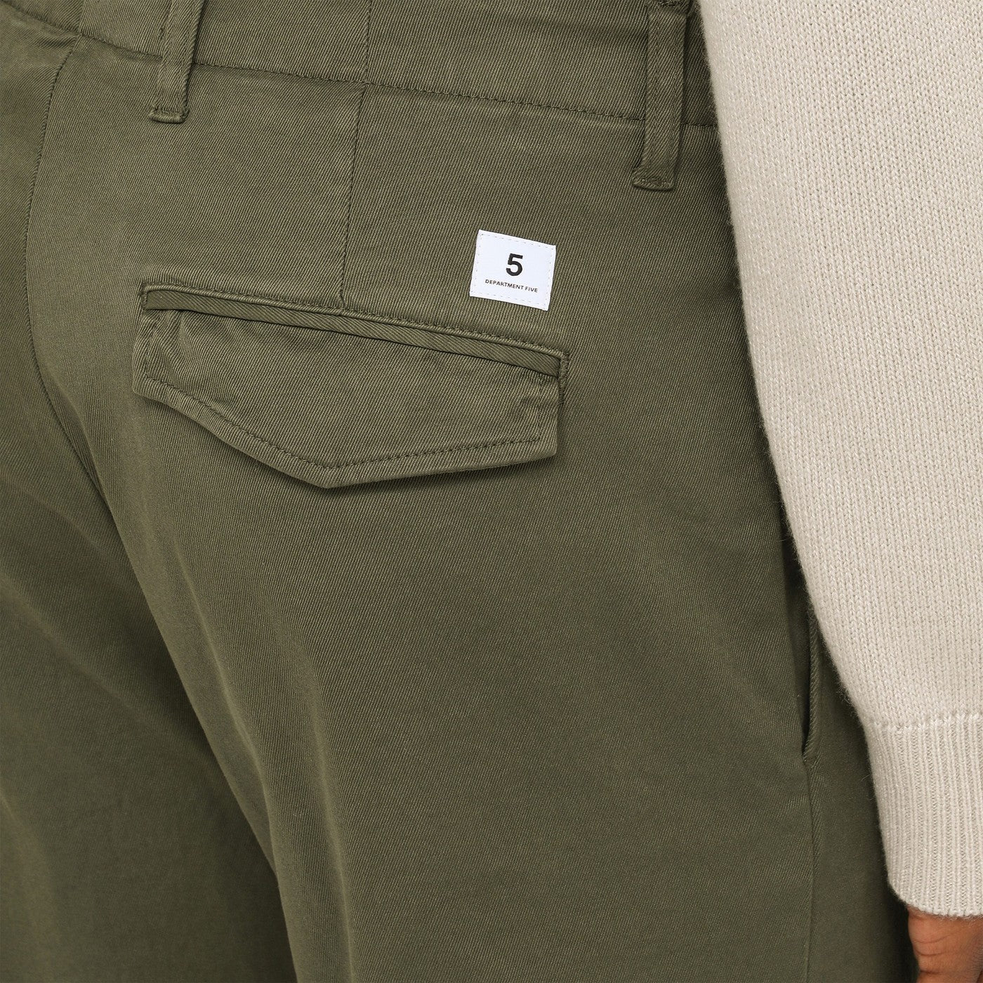Pantaloni del dipartimento 5 in tela di cotone di colore militare, con una cintura con anelli, due tasche a soffietto sui lati, due tasche a flap sul retro e una piccola patch di logo sul retro.