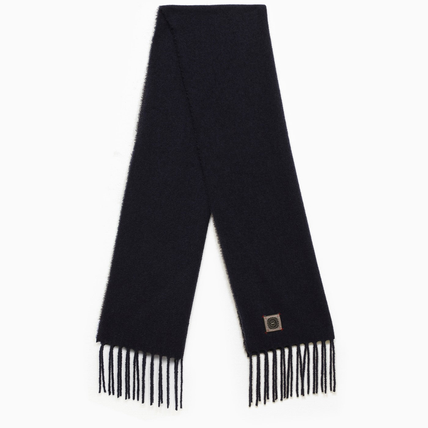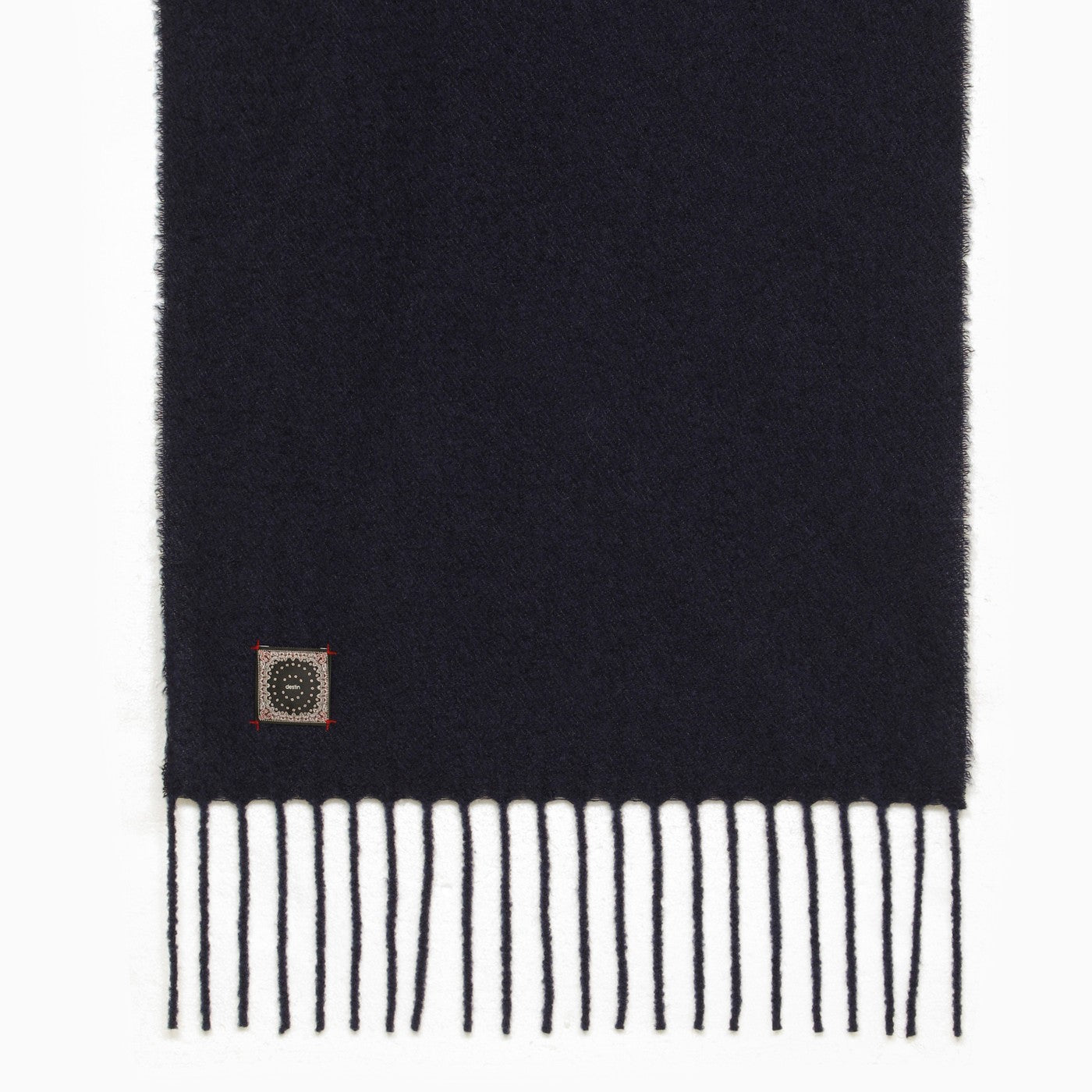Lana blu di Destin Surl e sciarpa in cashmere con frange e macchie decorative.