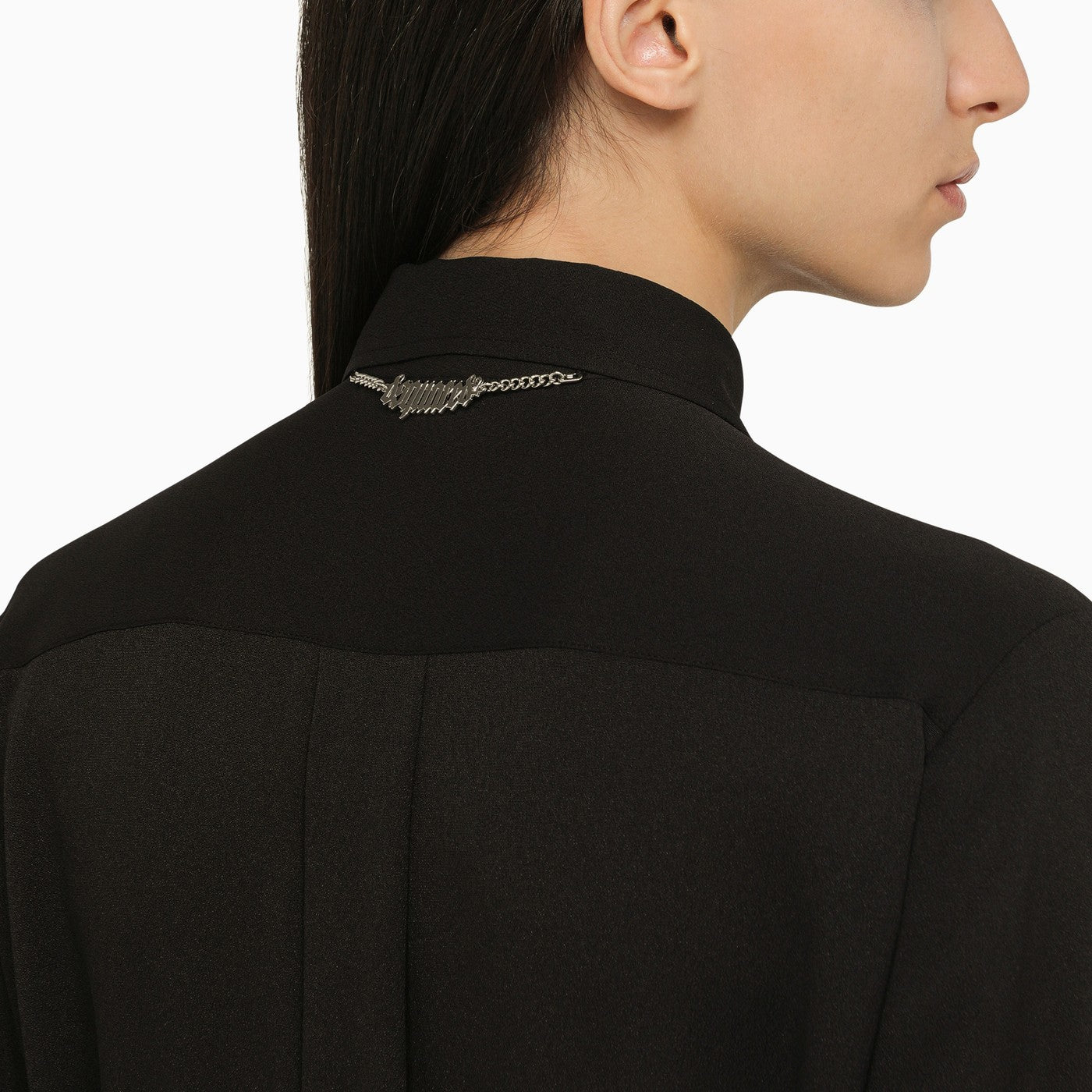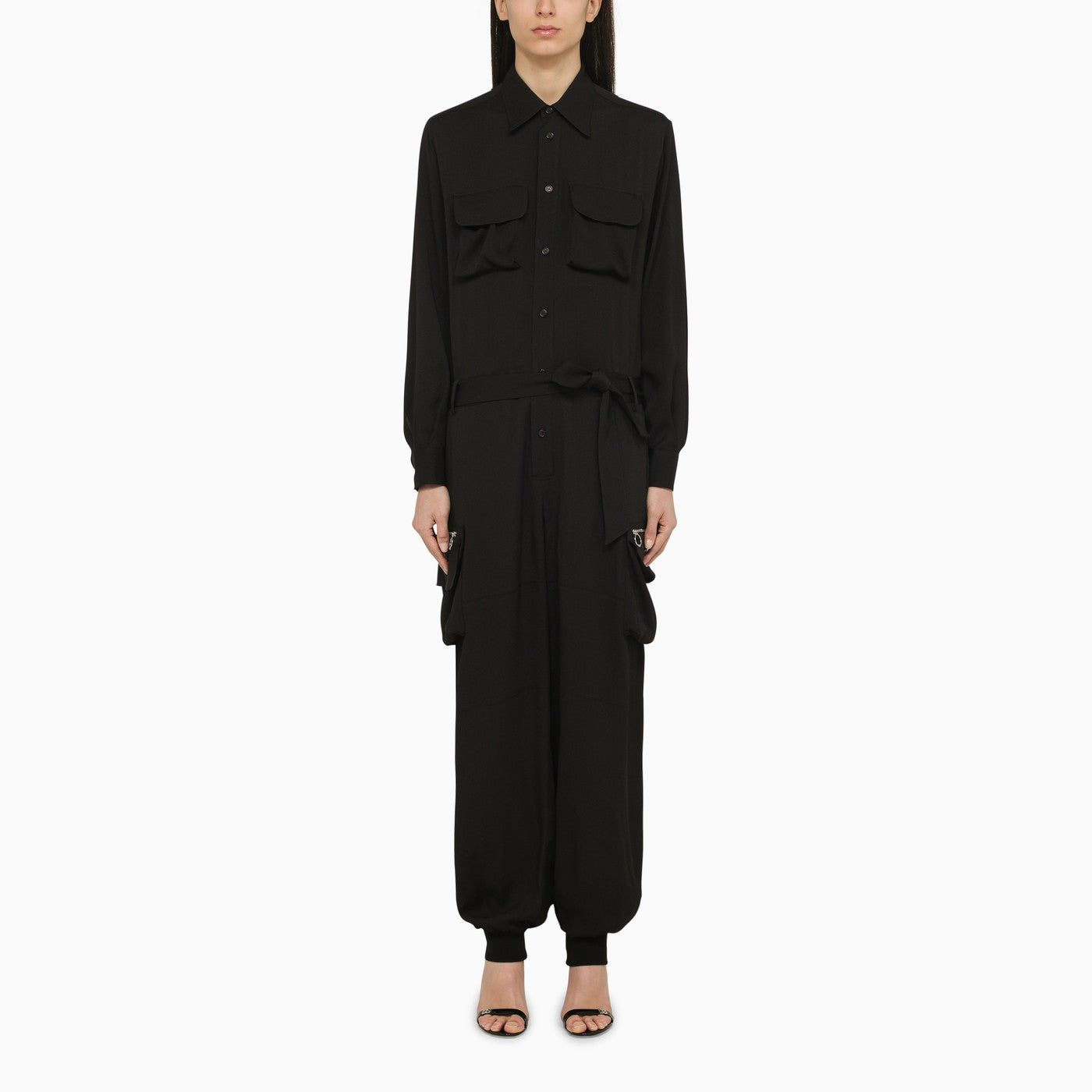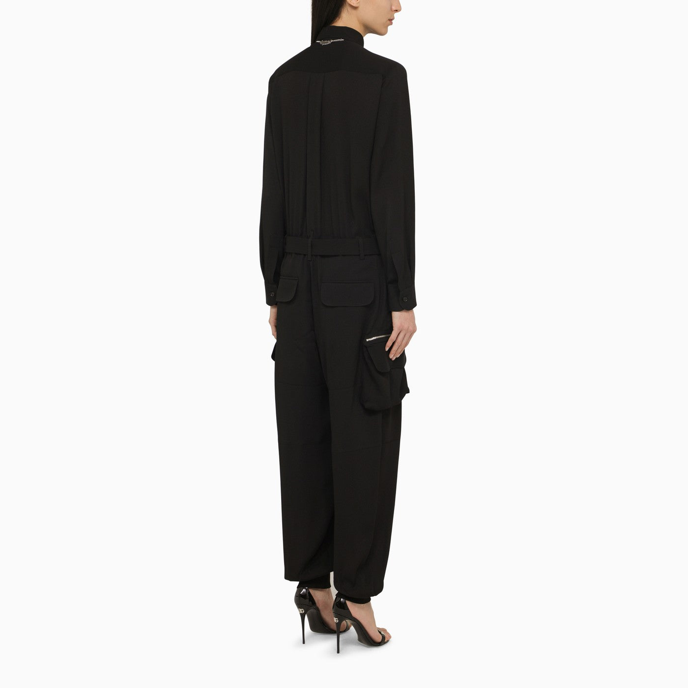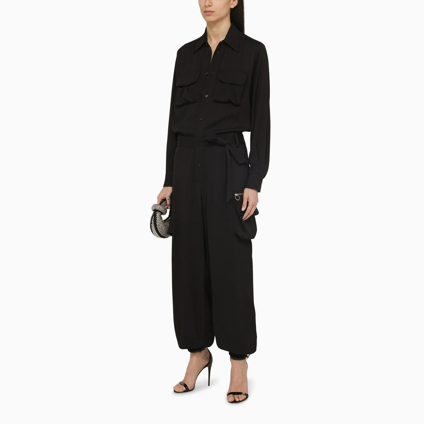 Black Silk Blend Cargo Abito da DSQuered2 con un colletto appuntito, maniche lunghe, due tasche a flap per patch anteriori, una vita corretta per coulisse, un dispositivo di fissaggio del pulsante anteriore, due tasche a lembo con cerniere laterali, una catena di logo posteriore e una vestibilità di grandi dimensioni.
