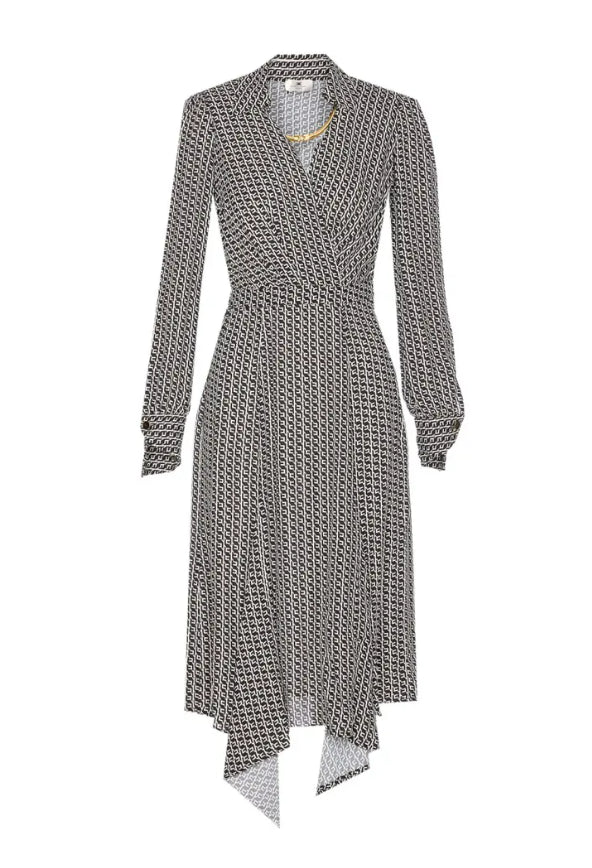Abito Slim-Fit Georgette Chemisier. L'abito ha un colletto a camicia con una linea a V incrociata, maniche con polsini asimmetrici e una gonna con spicchi per migliorare la linea svasata. La collana rimovibile con elementi tubolari con logo e stampa geometrica dà luce e movimento.