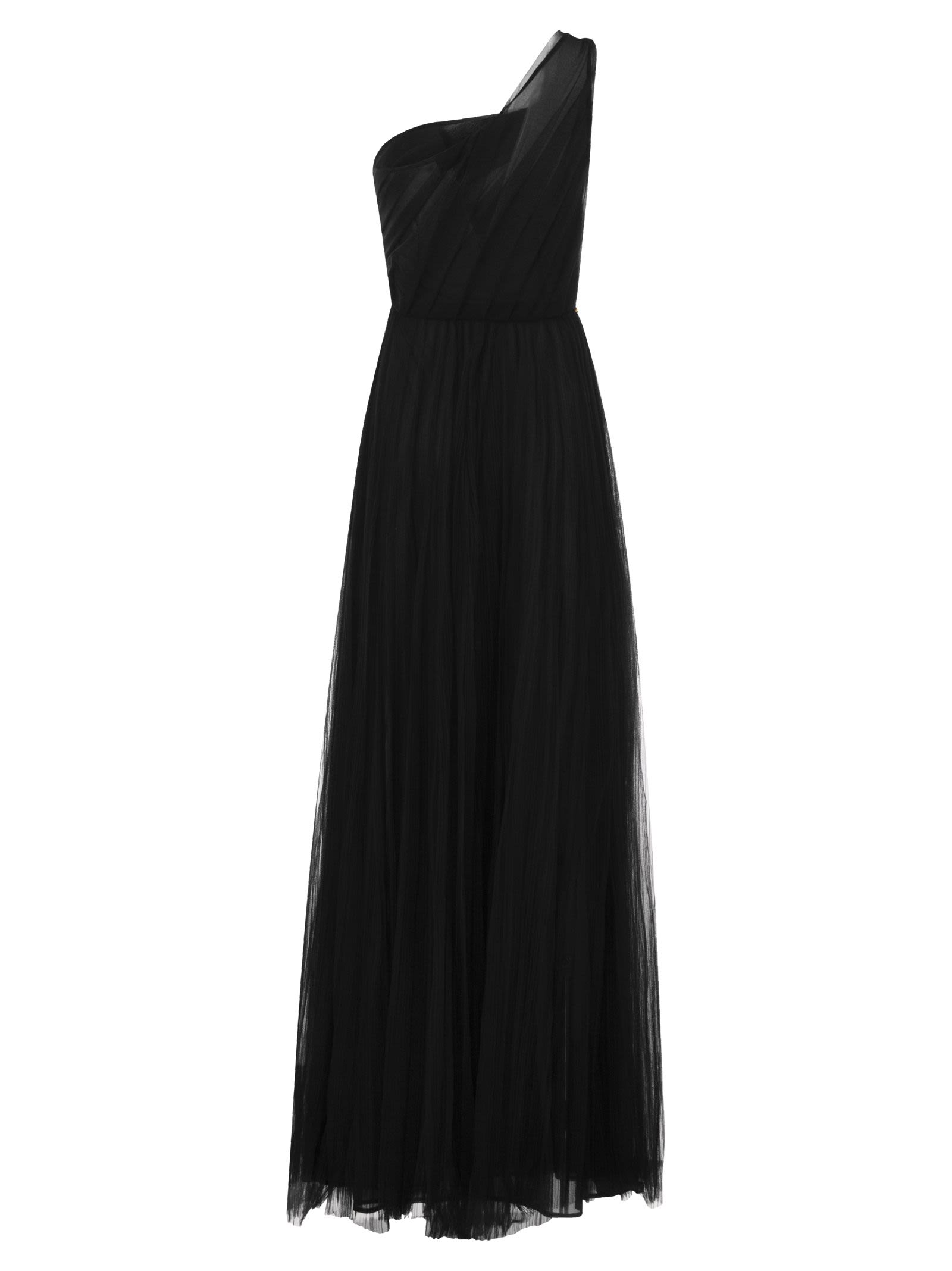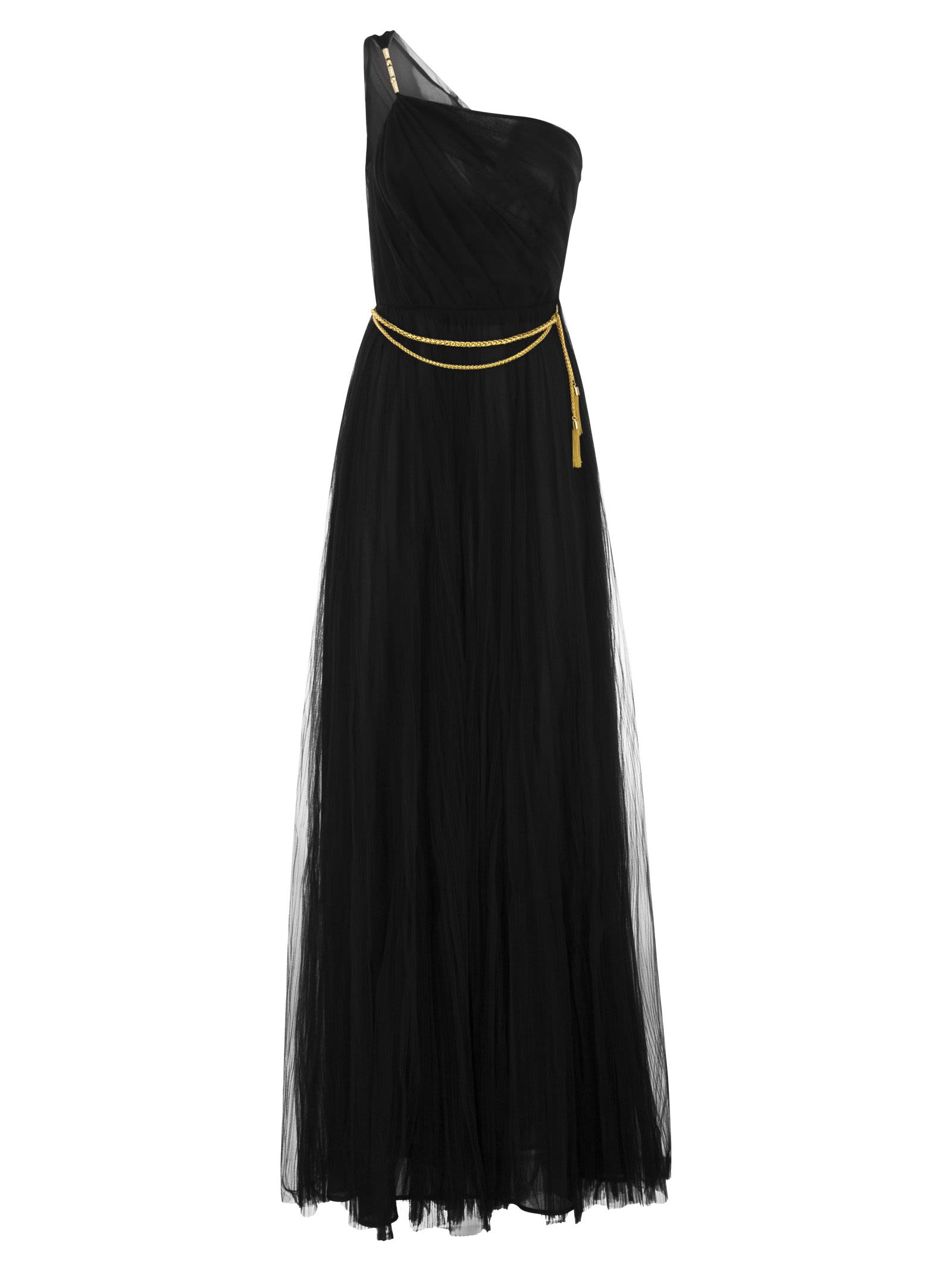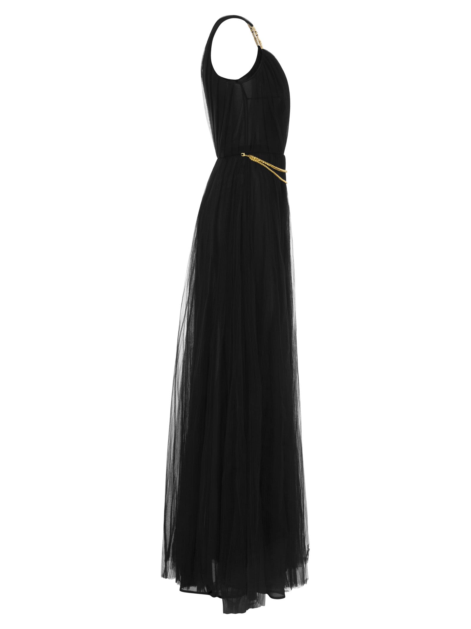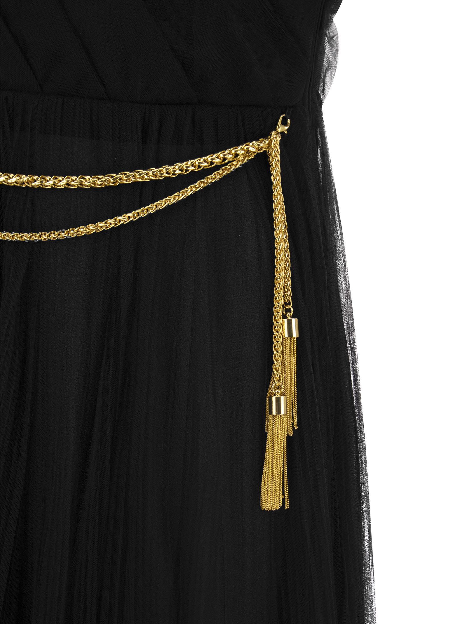 Un lungo abito in tulle con una cima a una spalla strabiliante che converge in una serie di anelli in metallo dorato. La gonna ha un ampio volume grazie a diversi strati di tulle, in due diverse combinazioni di colori. L'accessorio logo appeso dalla vita è rimovibile. - abito lungo - tulle - top asimmetrico - gonna raccolta - accessorio logo rimovibile appeso all'ID di design della vita: AB46332E2 110