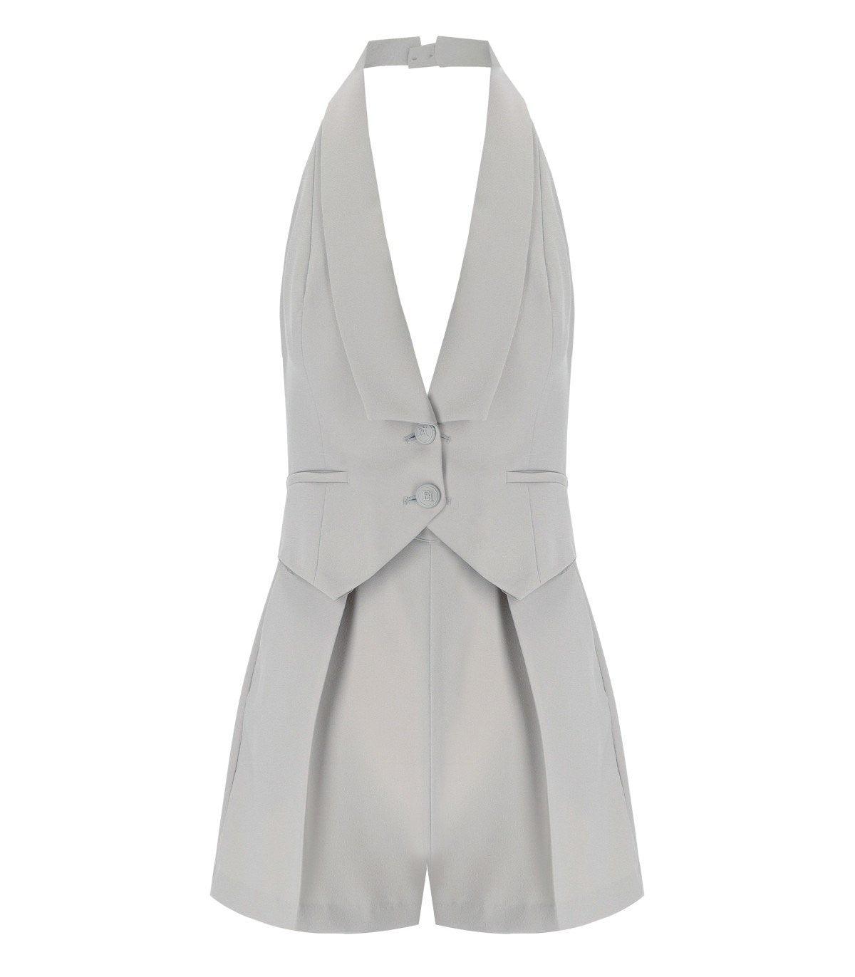 La tuta di Elisabetta Franchi fatta di crepe grigio perla, con un giro per petto singolo e pantaloncini a gamba larga. I dettagli includono i pulsanti del logo, una scollatura posteriore profonda con chiusura dei pulsanti al collo e una chiusura a zip. Slimt fit. Il modello è alto 177 cm e indossa una taglia 40it. Composizione: 100% poliestere.