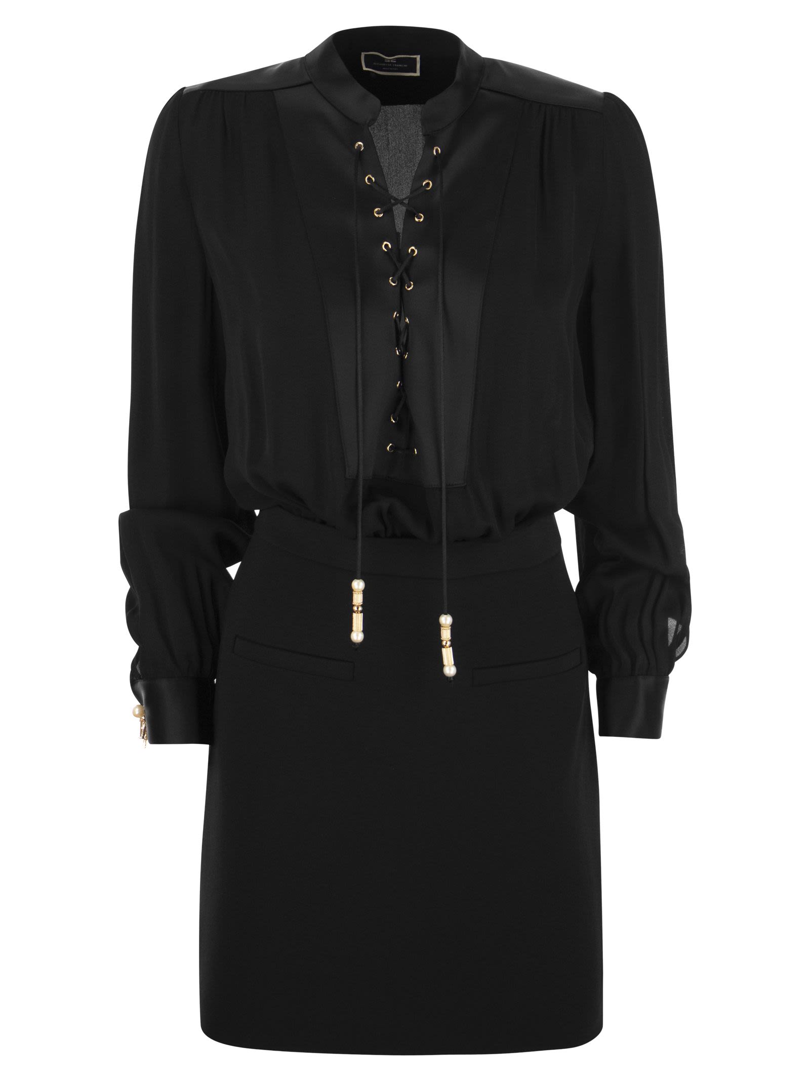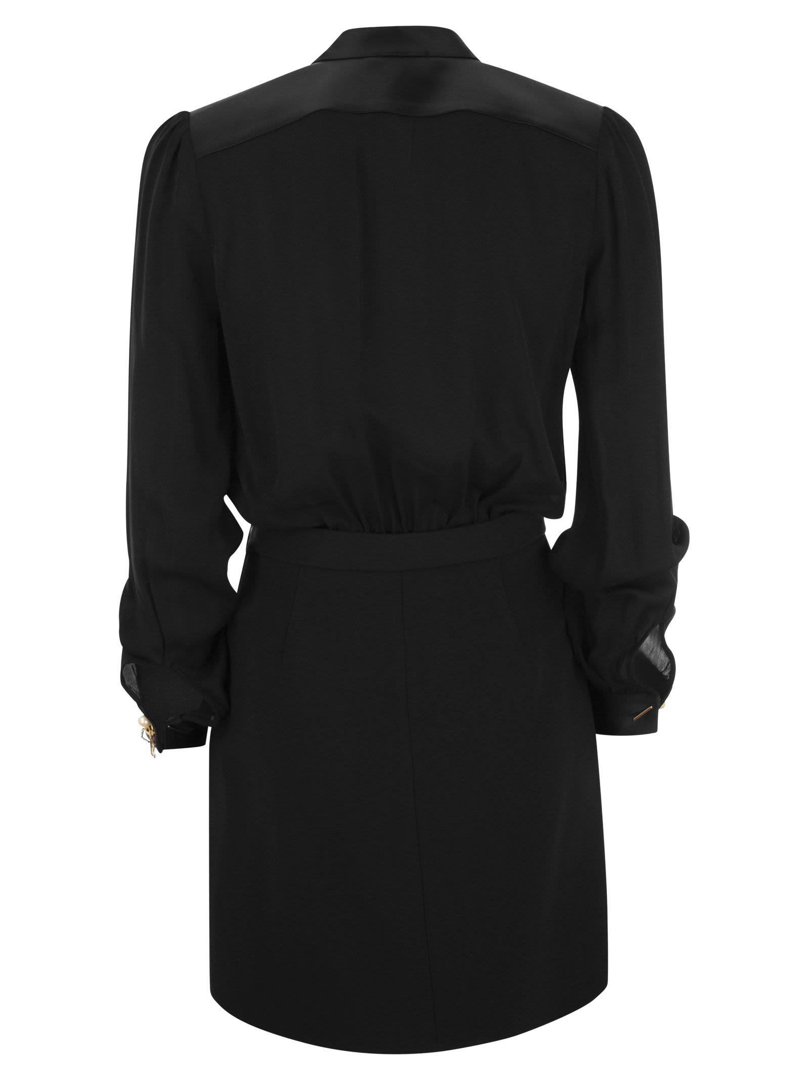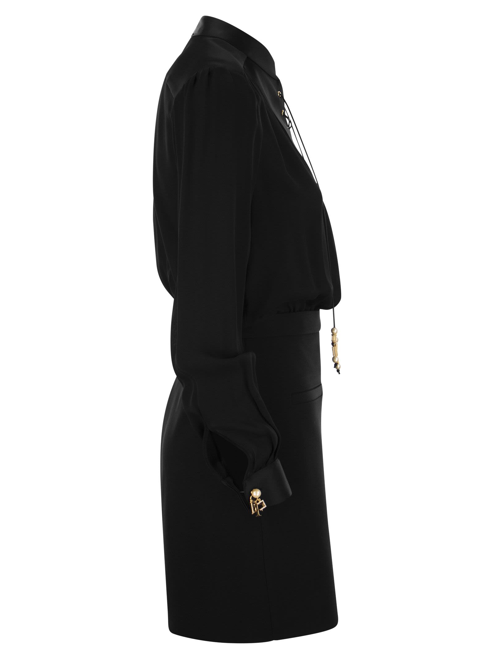 Mini-vestito con camicetta Georgette e gonna in crepe per viscosa allungata. È dotato di un colletto di mandarino con bavaglio della duchessa lucido e lacci incrociati rifiniti con finiture in metallo oro. - Zip invisibile sul lato - ID designer di accessori in metallo oro: AB53237E2 110