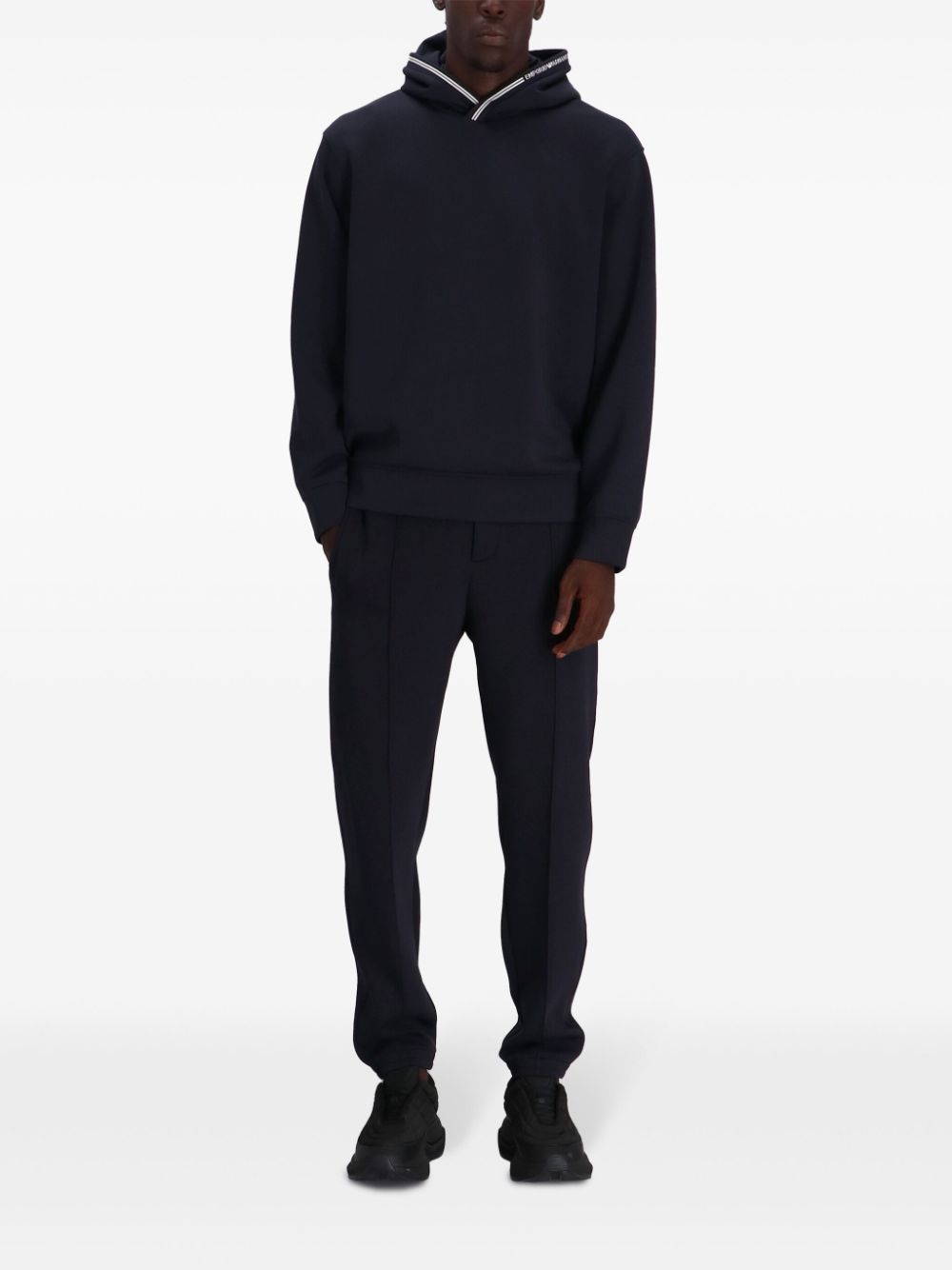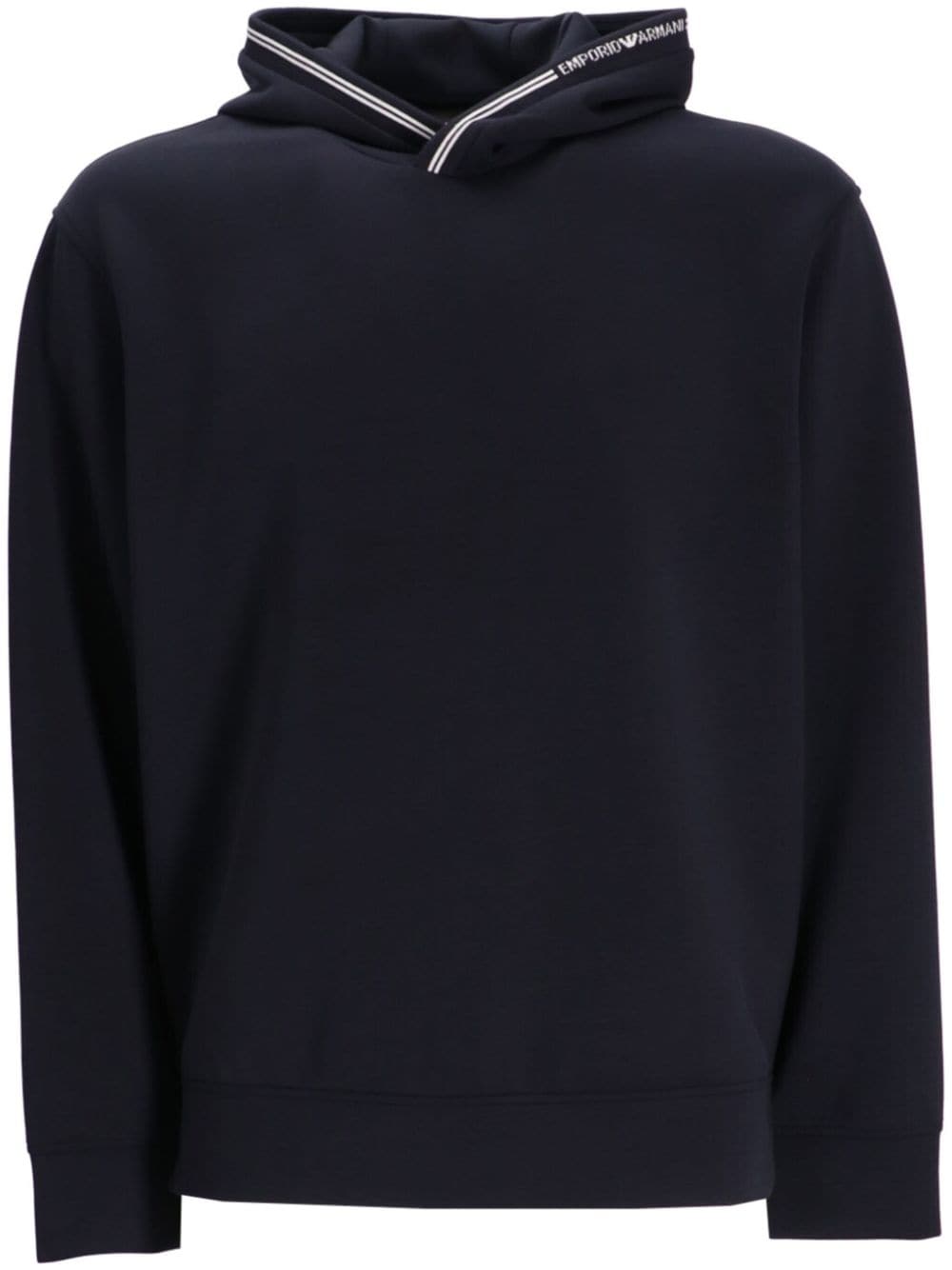navy blue modal blend stretch-design jersey texture slouchy hood stripe detailing jacquard logo motif drop shoulder long sleeves ribbed cuffs and hem