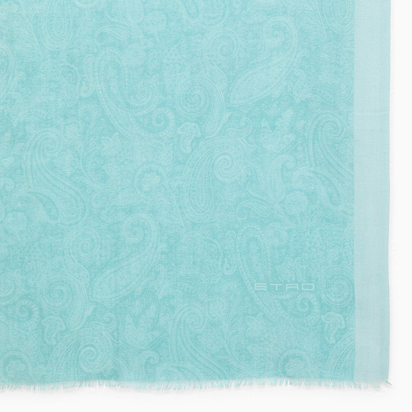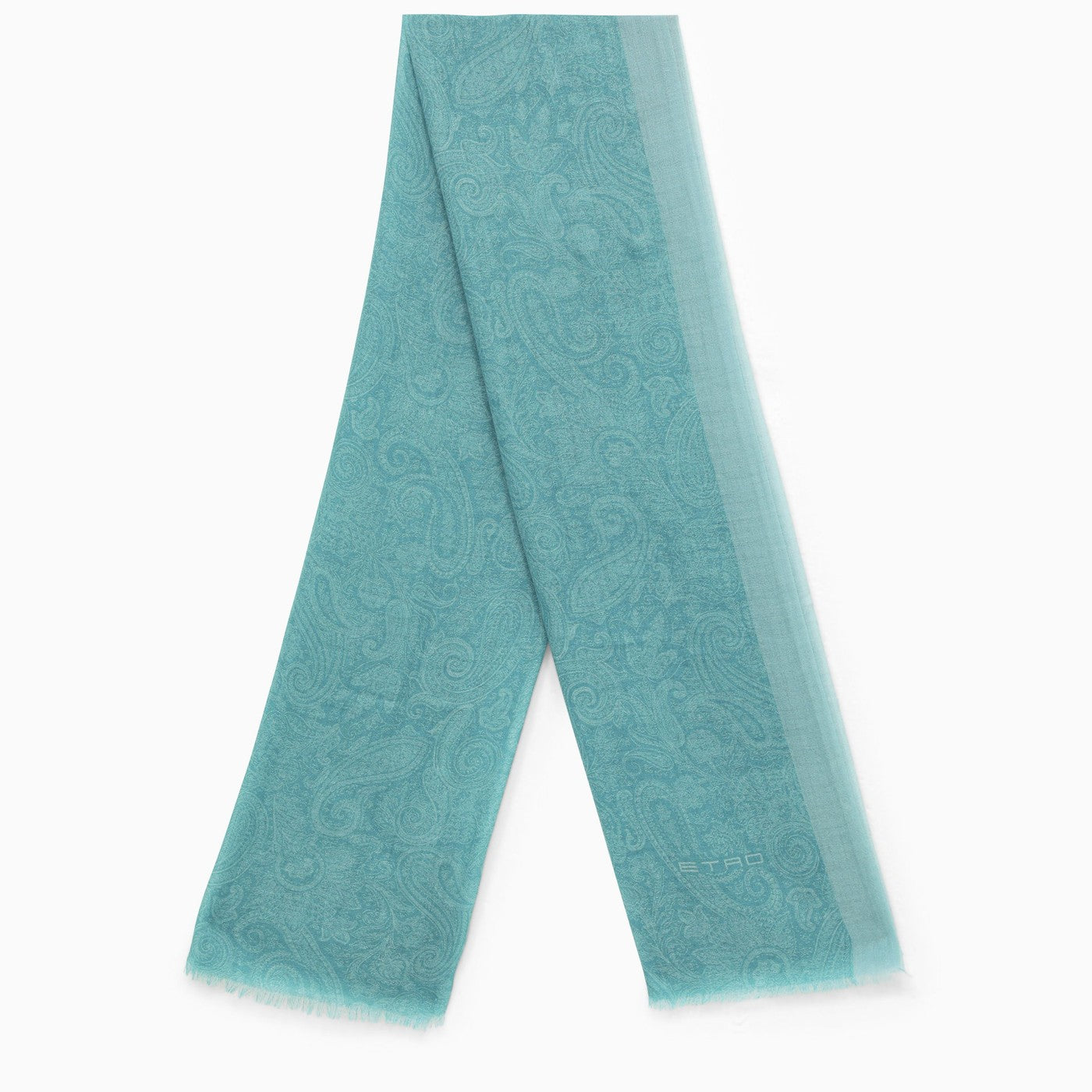 Sciarpa di cashmere blu leggera di Etro con bordi leggermente sfilacciati e un motivo Paisley all-over.