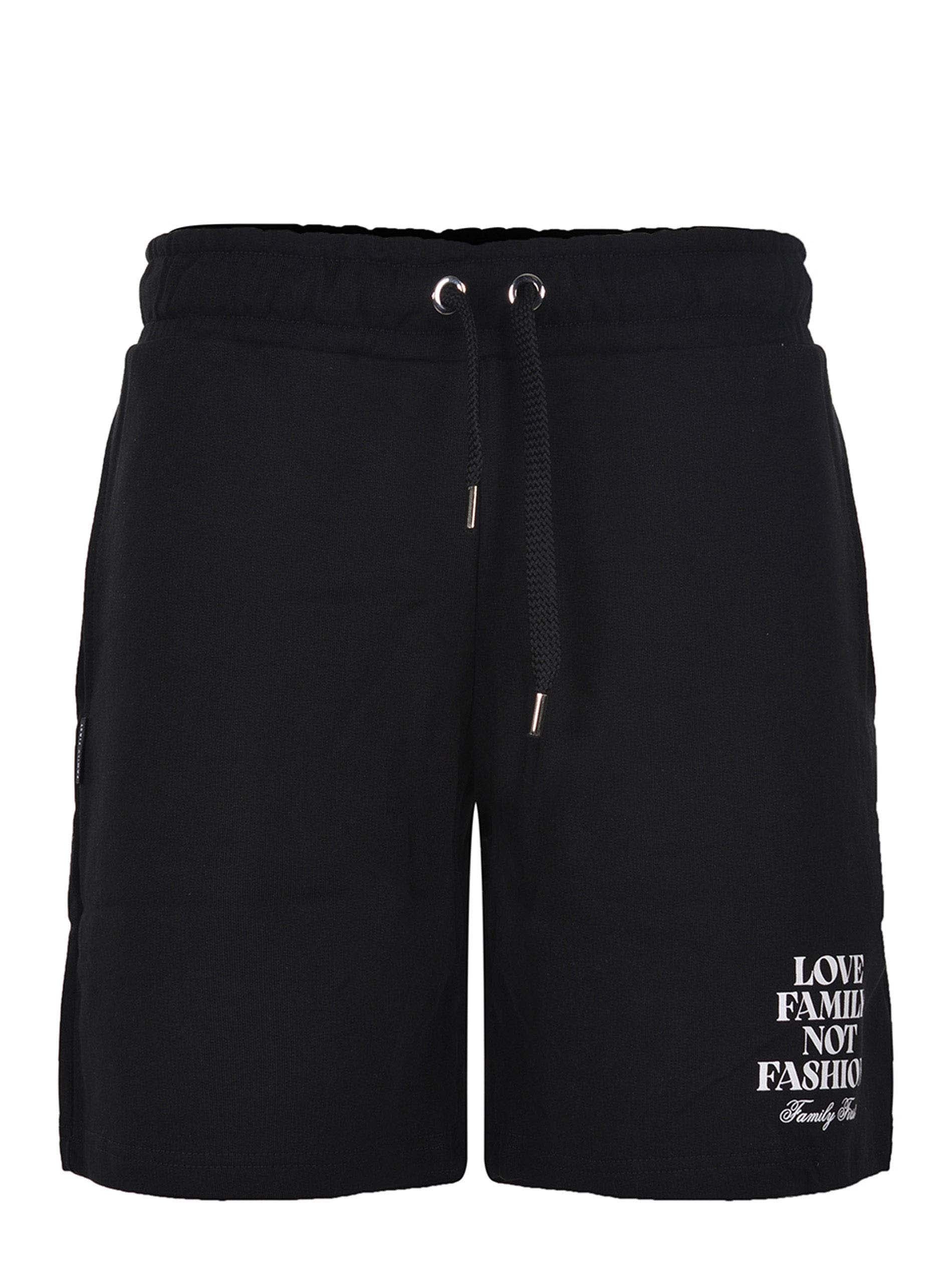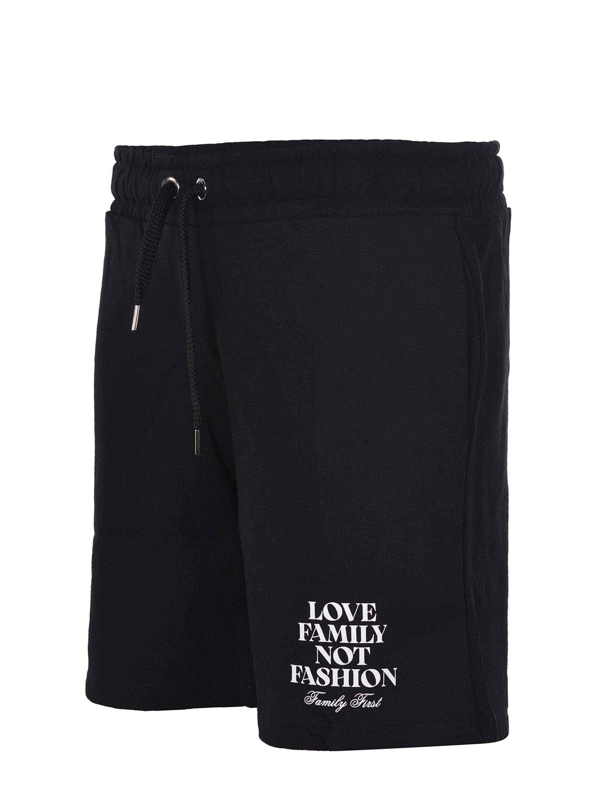 Primi pantaloncini familiari in nere di cotone colorato. Cullaggio elastico con coulisse. Tasche laterali Welt. Logo e lettere stampate sul lato sinistro per contrastare. 100% di cotone realizzato in Italia