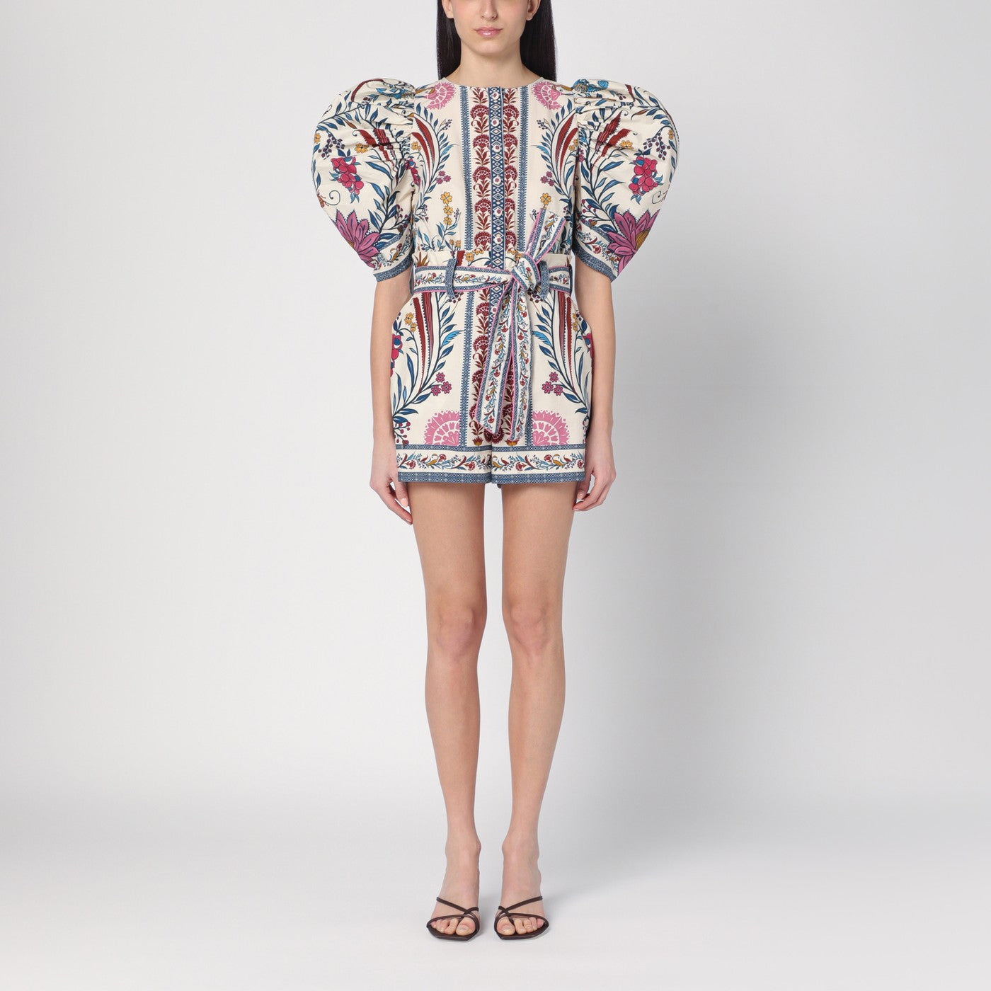 Saltiera corta di Farm Rio in cotone con stampa multicolore, caratterizzata da ampie maniche a palloncini corti, cintura regolabile, anelli della cintura e due tasche laterali.