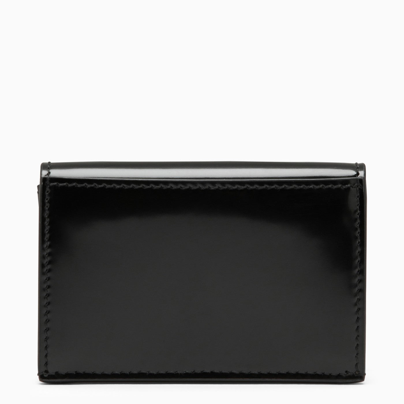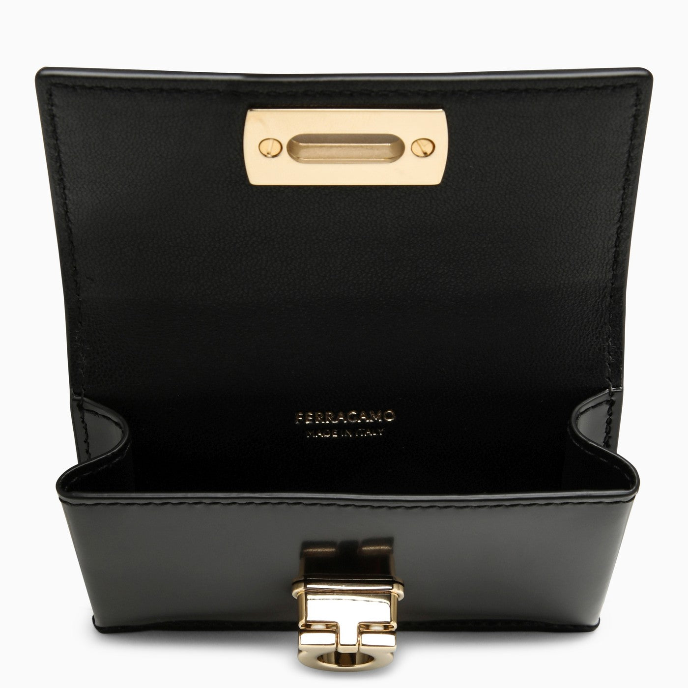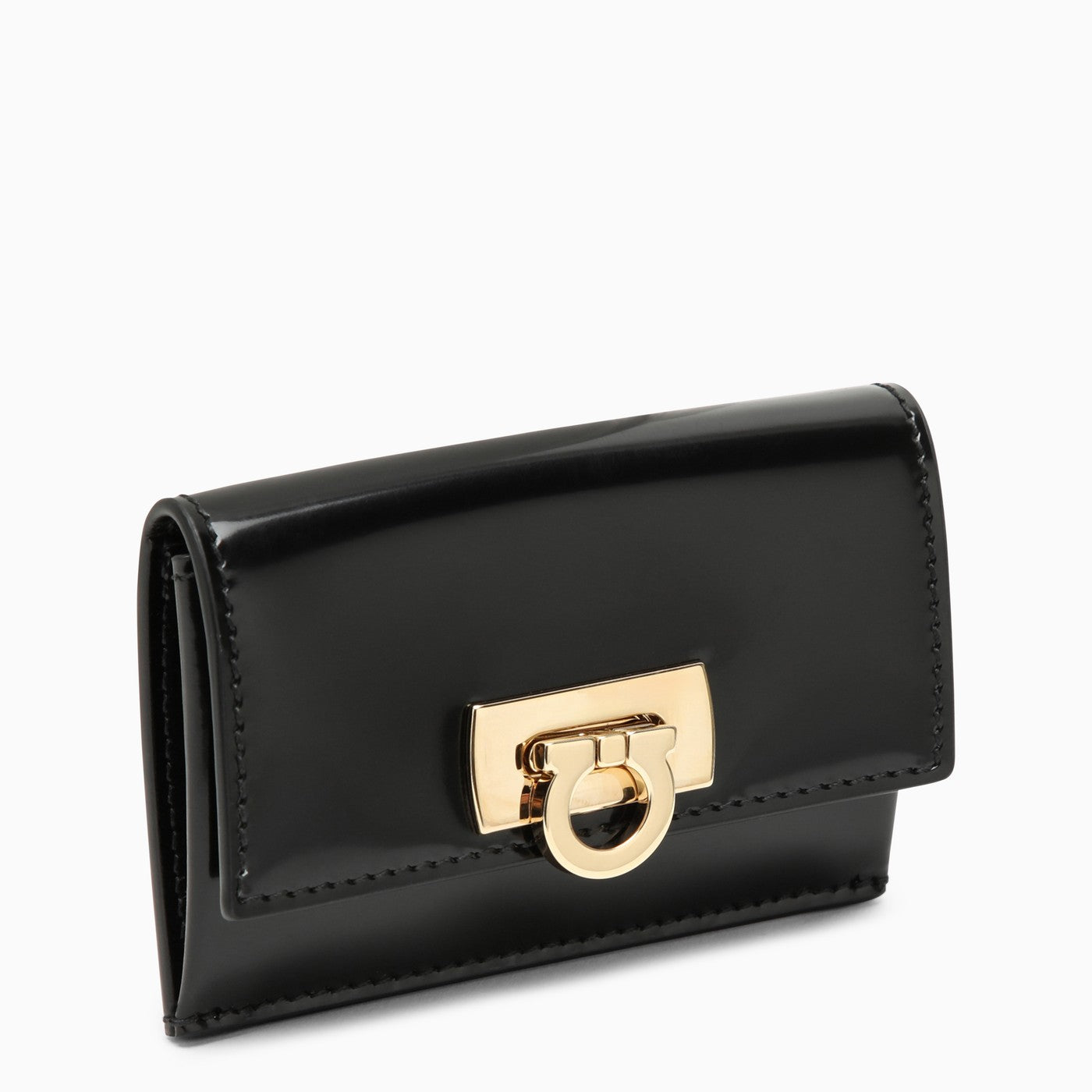 Custodia per ferragamo in pelle nera liscia con dettagli di ganci sul davanti, lembo anteriore, vano interno singolo e hardware in metallo color oro.