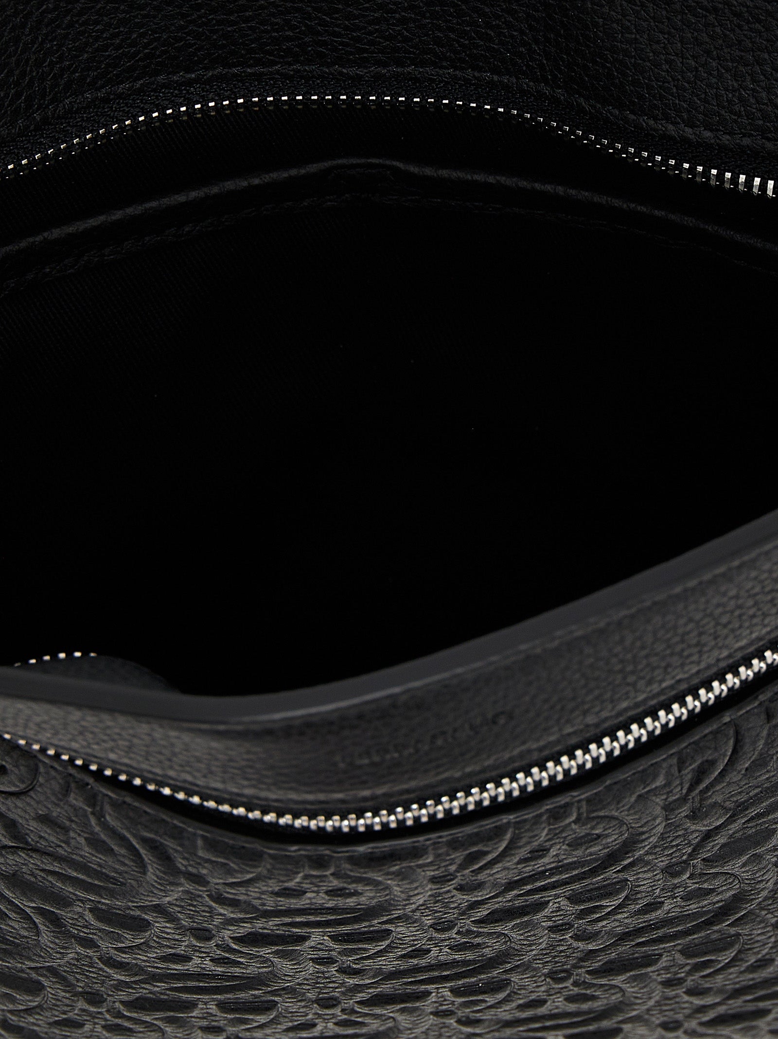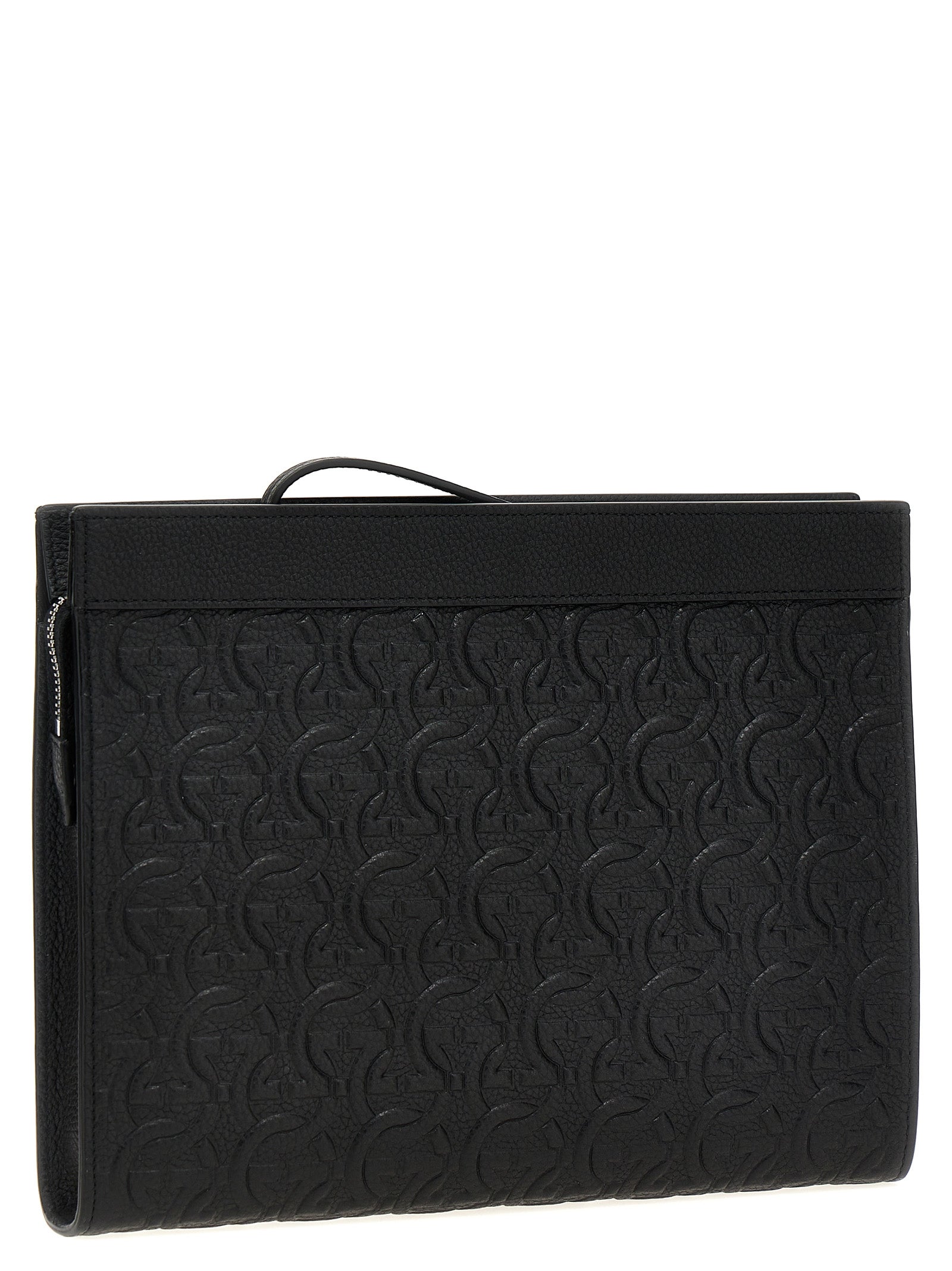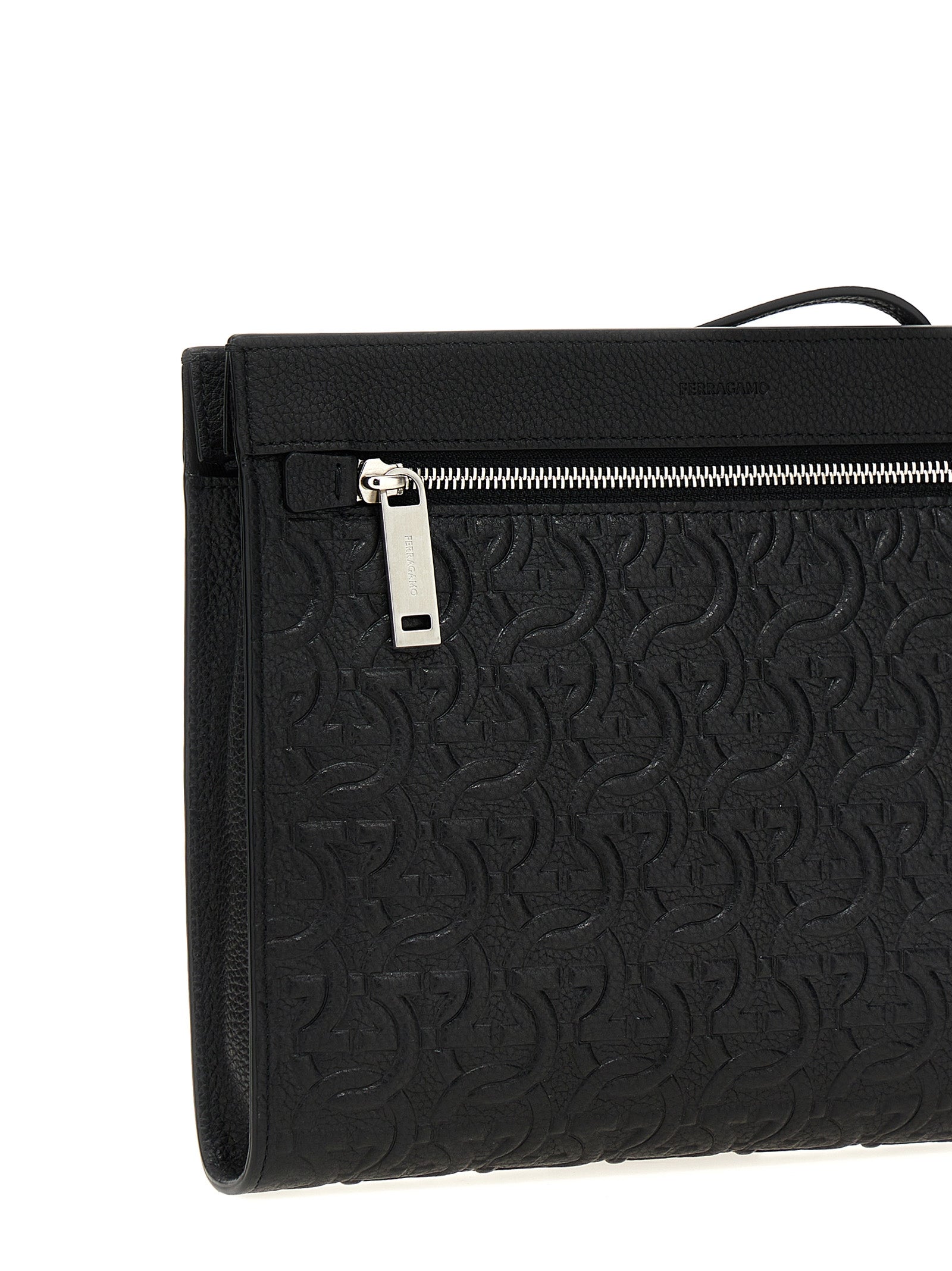 "Ganci" martellano e frizione in pelle di vitello martellata e in rilievo, chiusura a zip, cinghia da polso.