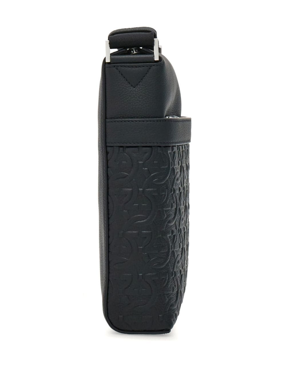 black calf leather pebbled texture embossed monogram pattern Gancini print logo-engraved silver-tone hardware adjustable shoulder strap top zip fastening main compartment internal zip-fastening pocket front zip-fastening pocket