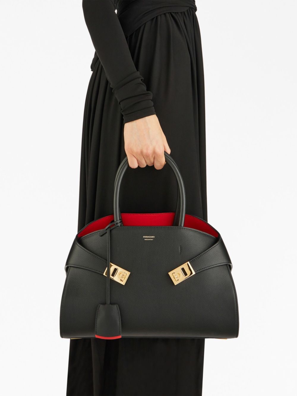 Piccola borsa in pelle abbraccio di Ferragamo con nero, pelle di vitello, placca di ganci, lettere logo tono in oro, hardware tono in oro, etichetta in pelle, maniglie superiore circolare, spalline staccabile regolabile, piedi di metallo e vano principale.