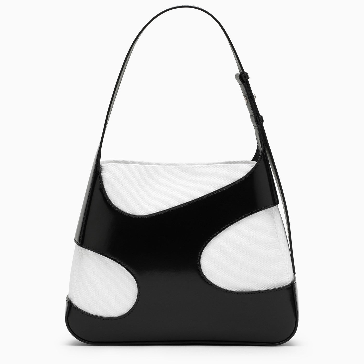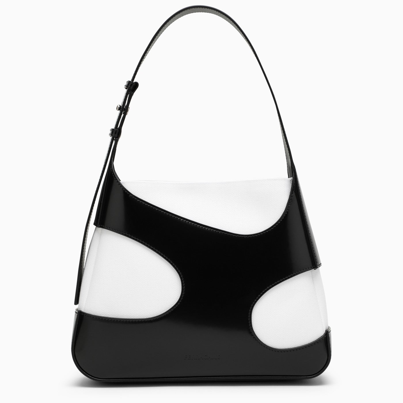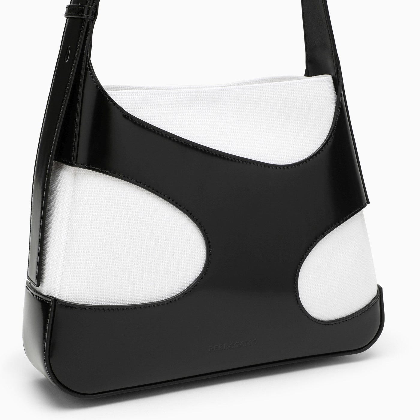 Grande borsa a tracolla di Ferragamo in tela bianca e pelle nera con dettagli ritagliati, impugnatura in pelle regolabile, aperta sulla parte superiore, una tasca zippata all'interno e un logo in rilievo tono sul fronte.