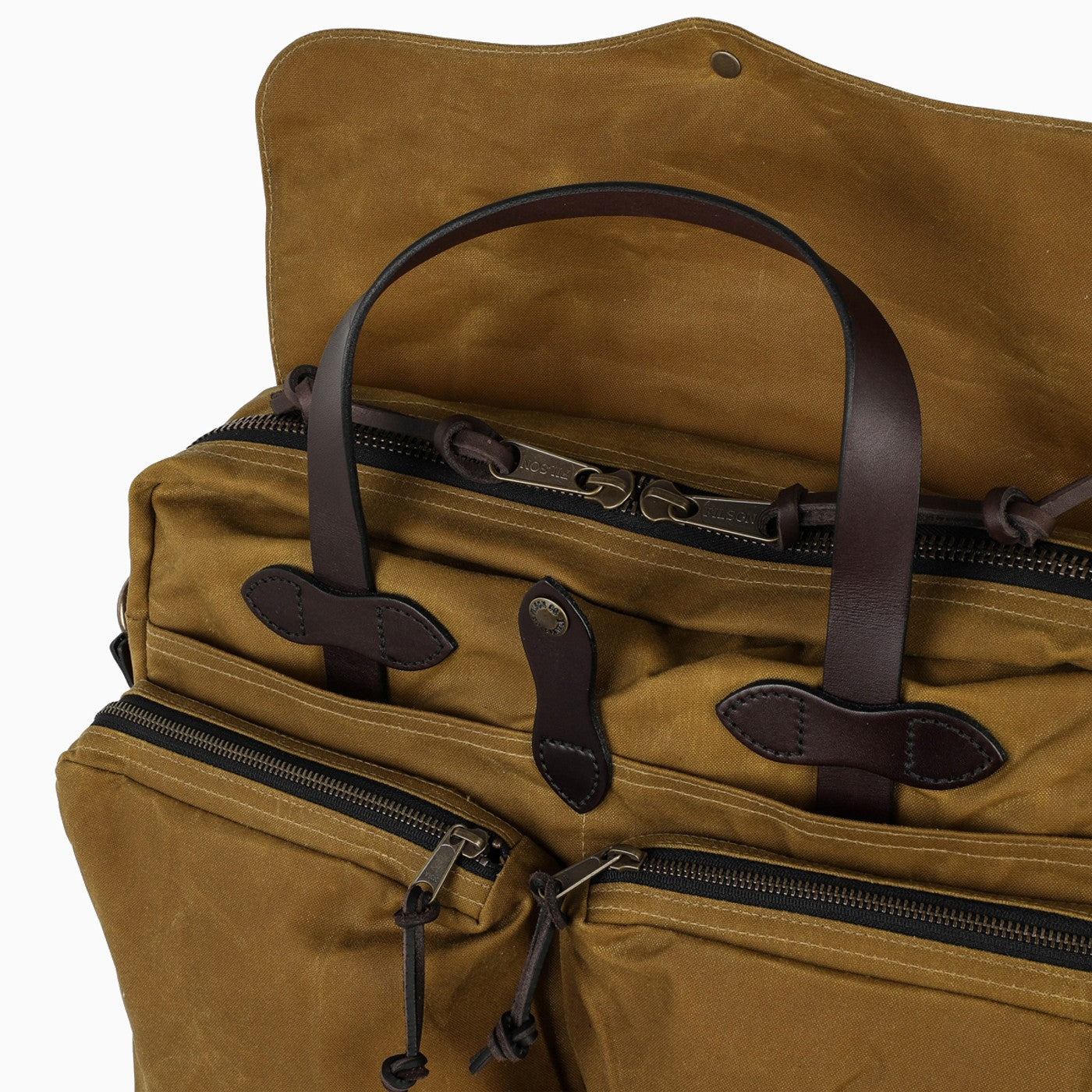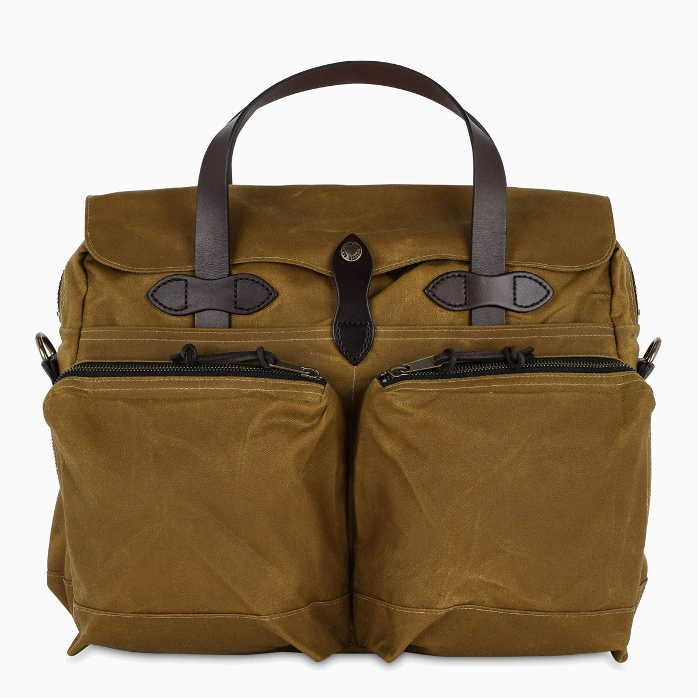 Valecase di Filson in cotone marrone scuro, con dettagli in pelle, doppie maniglie, due tasche sul davanti, chiusura a doppio slider e lembo pieghevole con pulsante automatico. Grande scompartimento interno con tasche multiple e tracolla regolabile e rimovibile. Collezione autunno/inverno 2020-21.